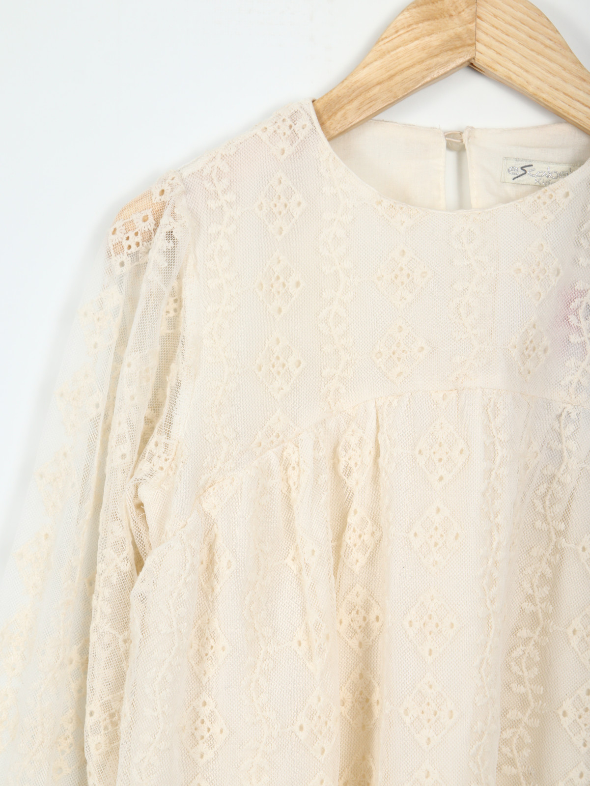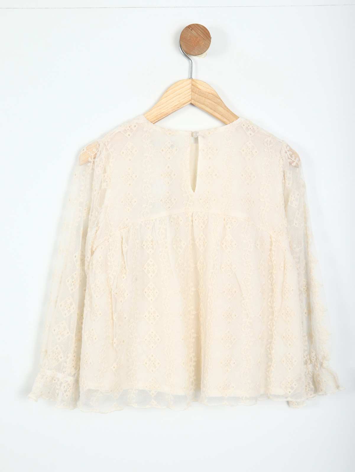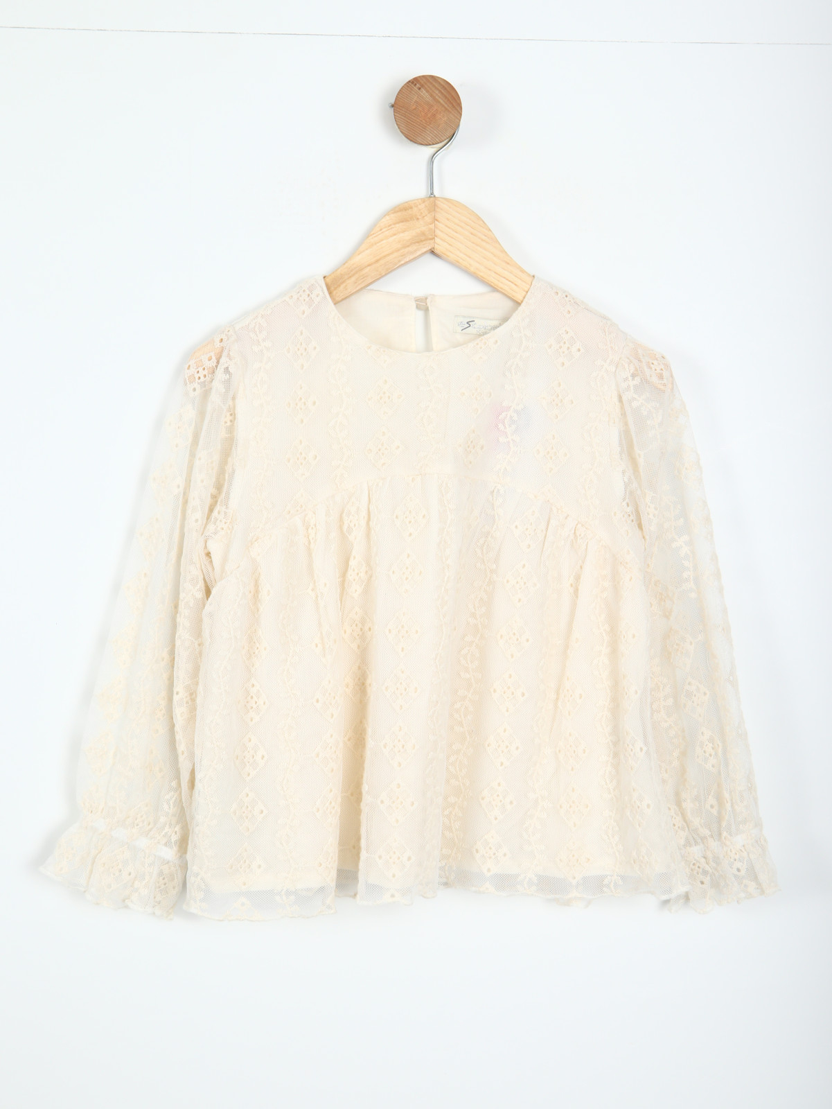 Şık ve zarif tasarımıyla kız çocukları için özel olarak tasarlanmış bu bluz, ekru renginde ve uzun kolludur. Sıfır yakaya sahip olan bluz, hafif kabarık uzun kollara ve manşetlerinde zarif fırfır detaylarına sahiptir. İnce dantel işlemeleriyle süslenen bluz, klasik ve romantik bir görünüm sunar. Arkasında küçük bir düğme ile kapanan bluz, günlük ve özel günlerde rahatça kullanılabilir.
