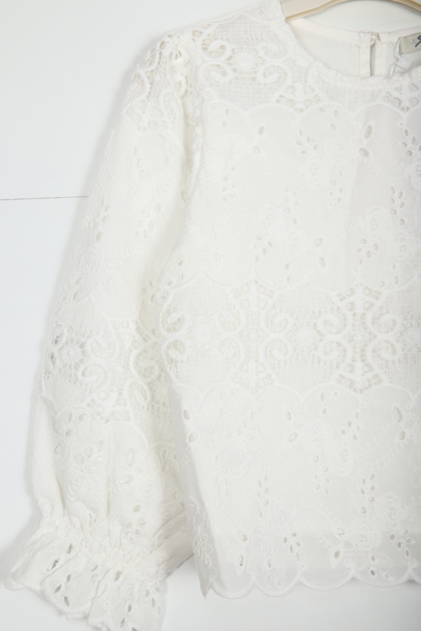 This elegant girls' blouse stands out with its delicate and feminine details. In a pristine white color, it features fine lace and embroidery patterns. The blouse has long sleeves with slightly gathered cuffs and a comfortable crew neckline. It closes at the back with a single button, making it a graceful option suitable for both everyday wear and special occasions.