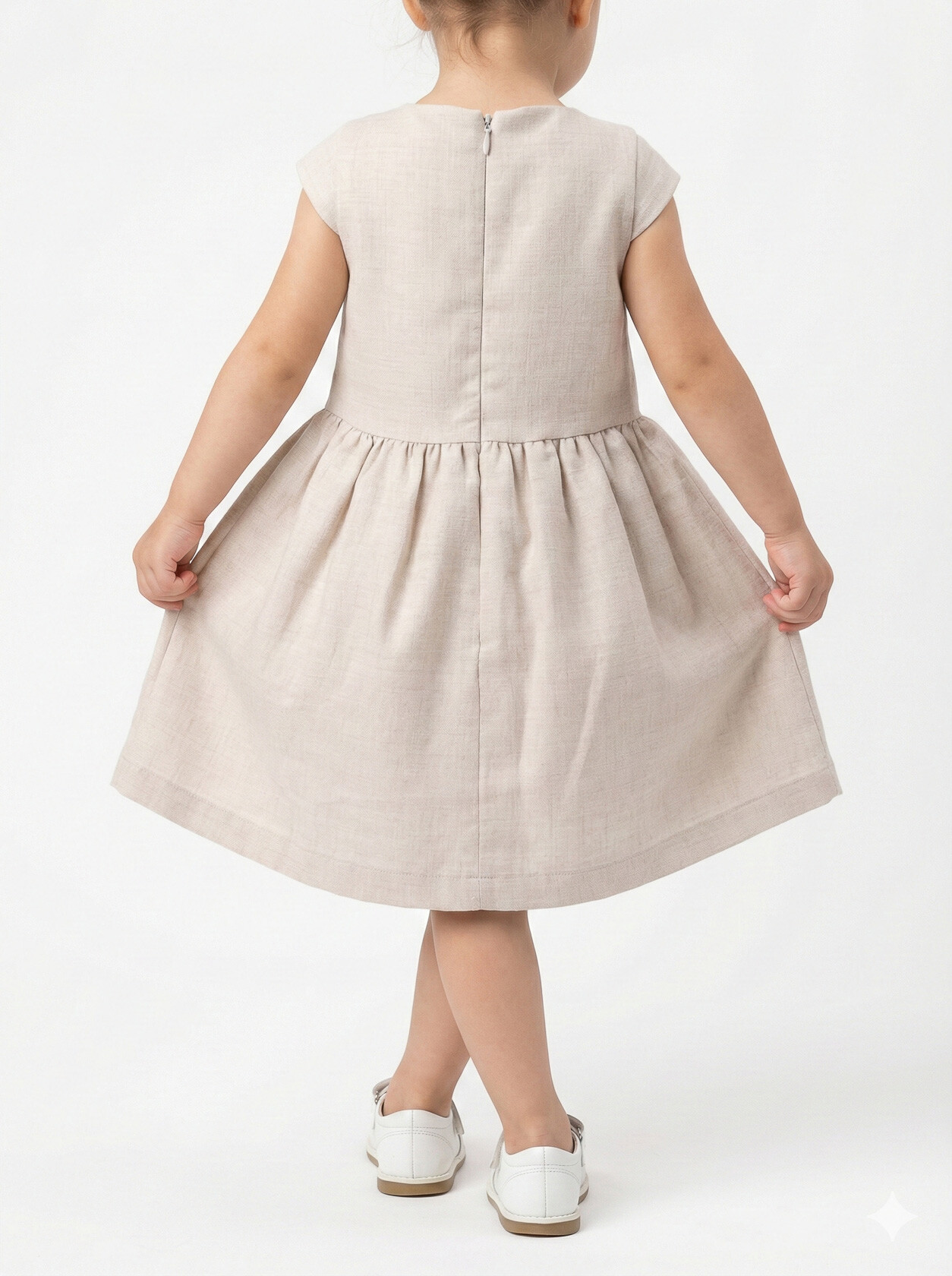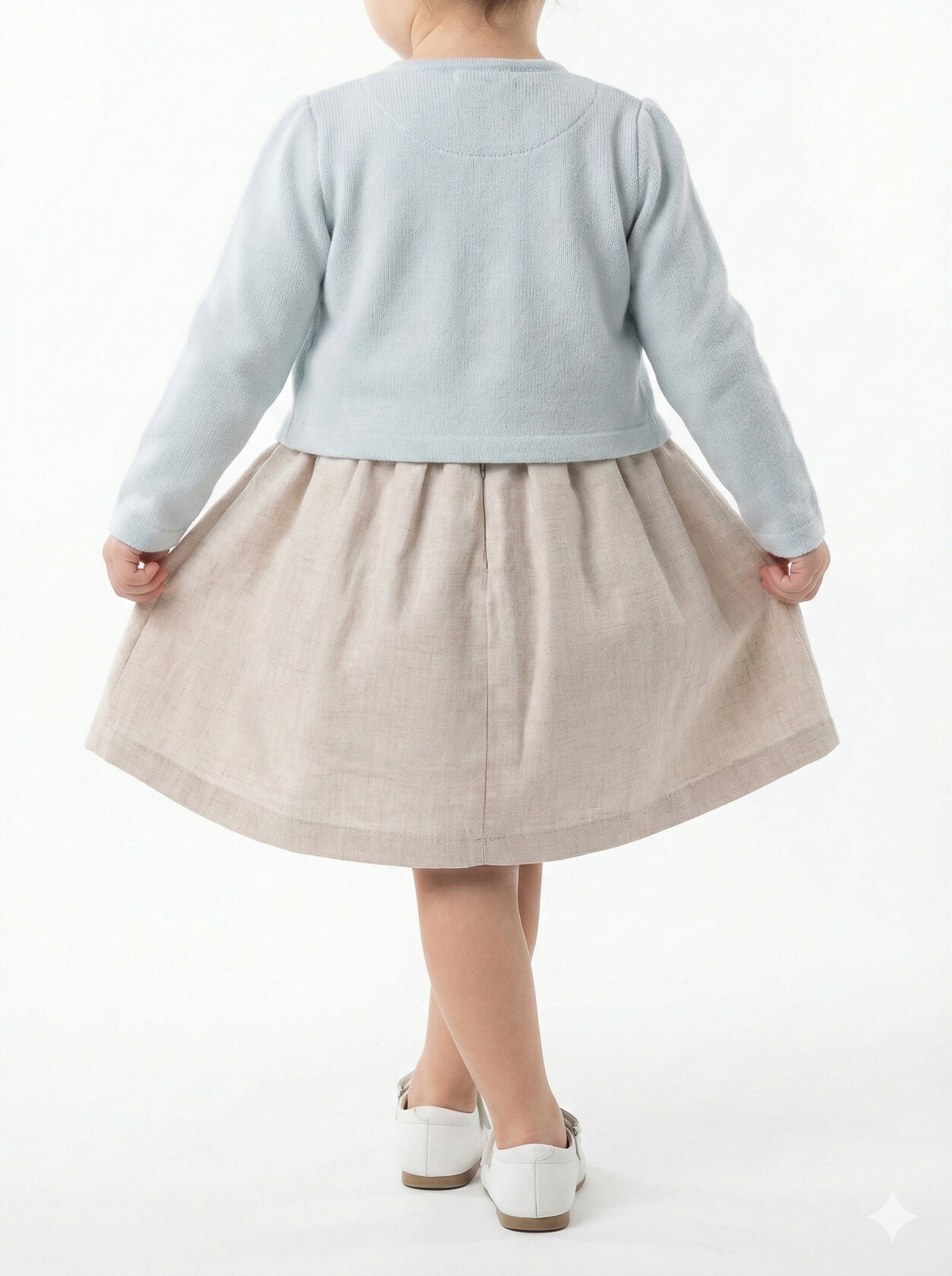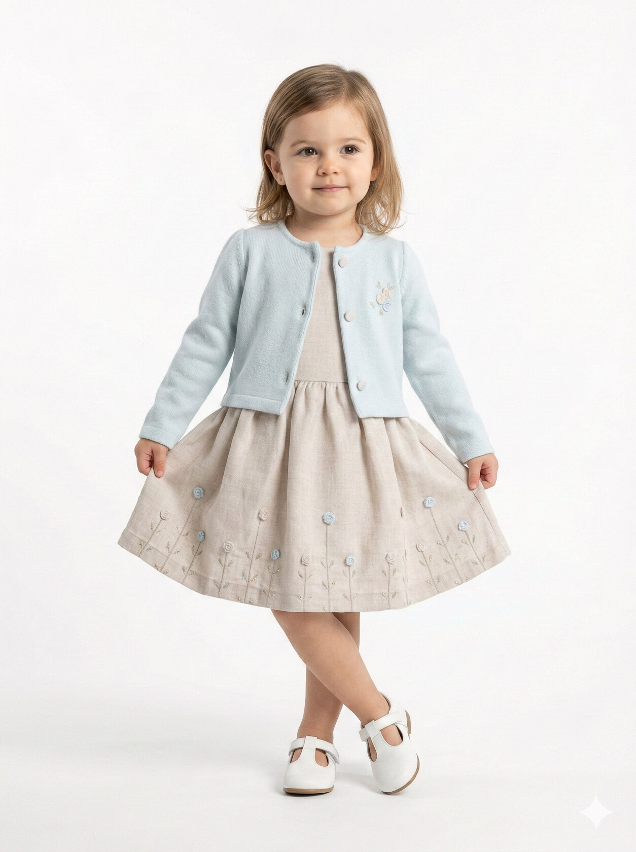 Bu kız çocuk elbisesi, bahar ayları için mükemmel bir seçimdir. Elbise, sıfır yaka ve kolsuz tasarımıyla rahat bir kullanım sunar. Diz hizasında midi boyda olup, etek kısmında pembe ve gri küçük çiçek detaylarıyla süslenmiştir. Üzerine giyilen pembe hırka, uzun kollu ve düğmeli olup, küçük çiçek nakışlarıyla tamamlanmıştır. Bu kombin, hem şık hem de günlük kullanıma uygundur.