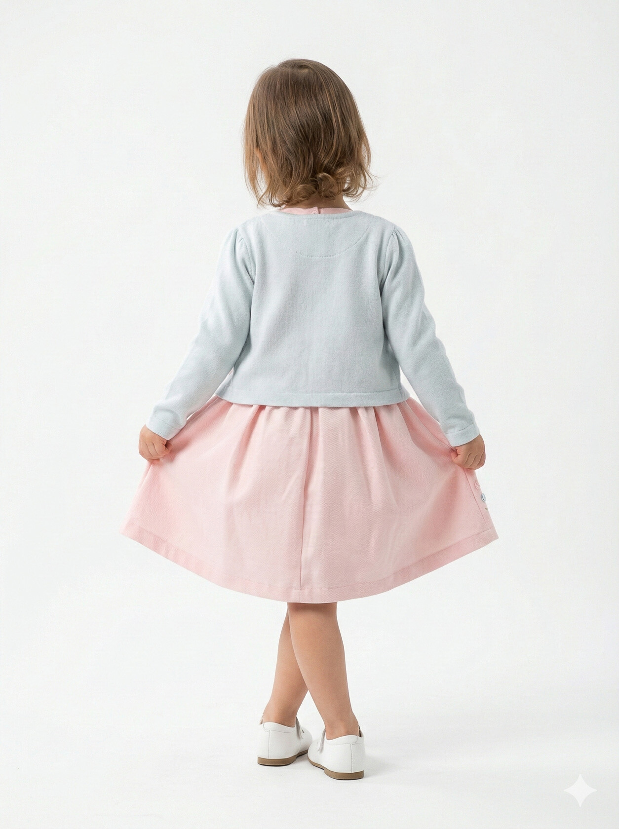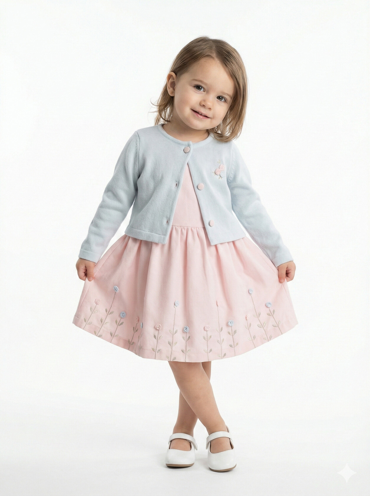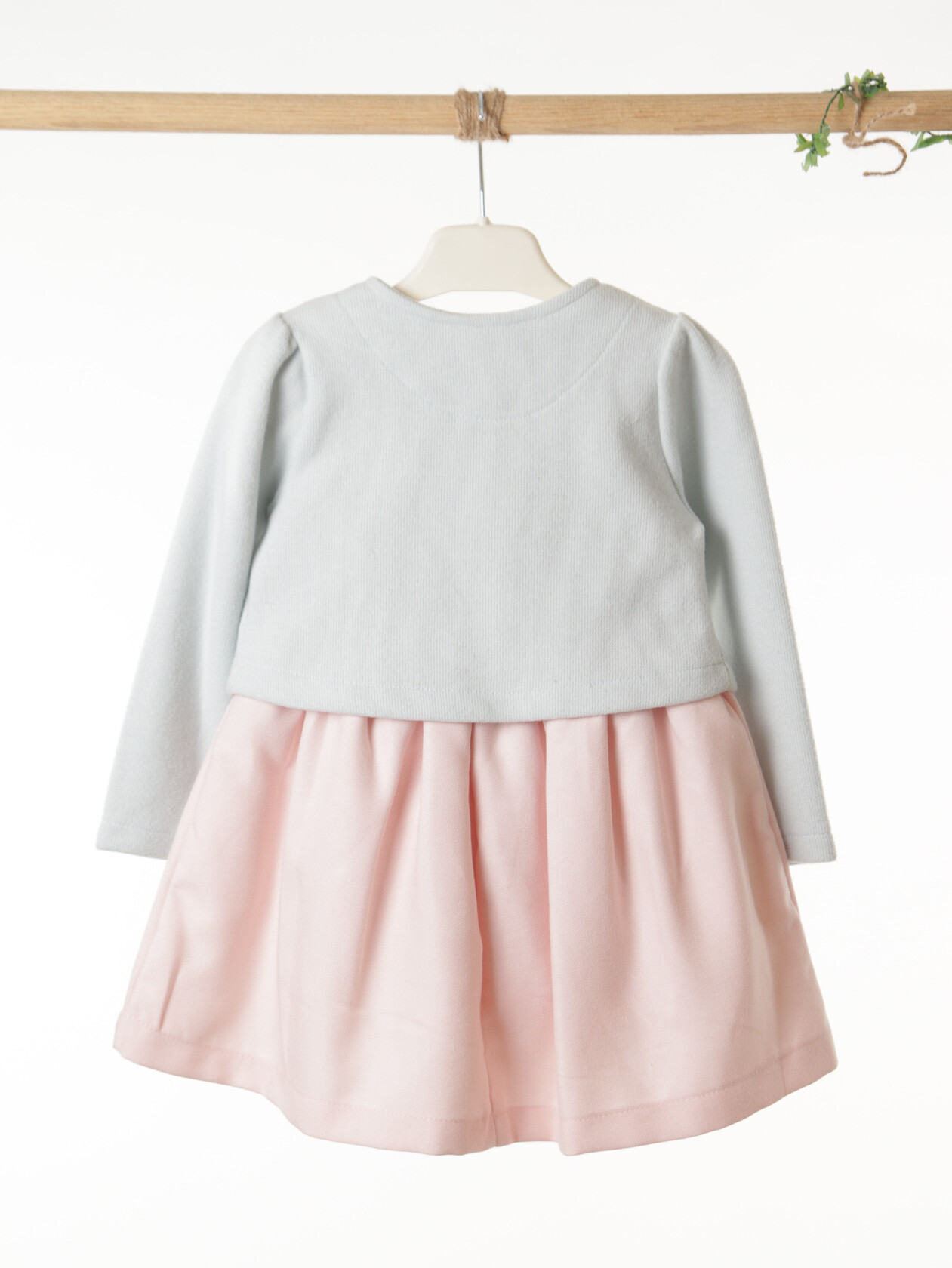 Bu kız çocuk elbisesi, bahar ayları için mükemmel bir seçimdir. Elbise, sıfır yaka ve kolsuz tasarımıyla rahat bir kullanım sunar. Diz hizasında midi boyda olup, etek kısmında pembe ve gri küçük çiçek detaylarıyla süslenmiştir. Üzerine giyilen pembe hırka, uzun kollu ve düğmeli olup, küçük çiçek nakışlarıyla tamamlanmıştır. Bu kombin, hem şık hem de günlük kullanıma uygundur.