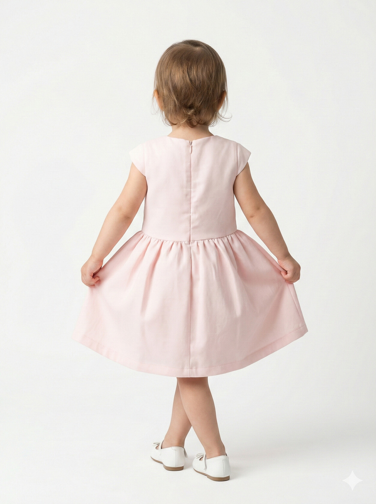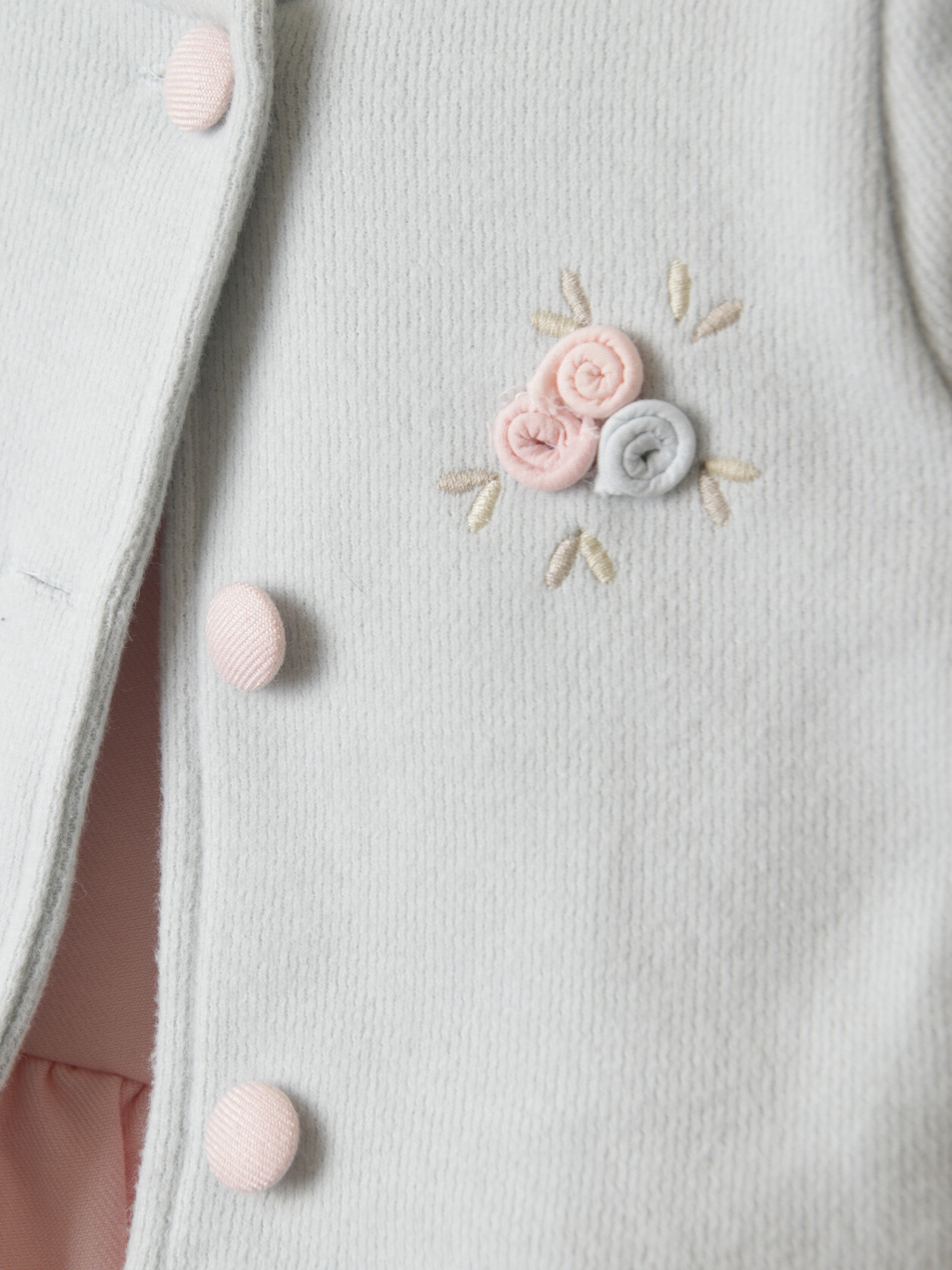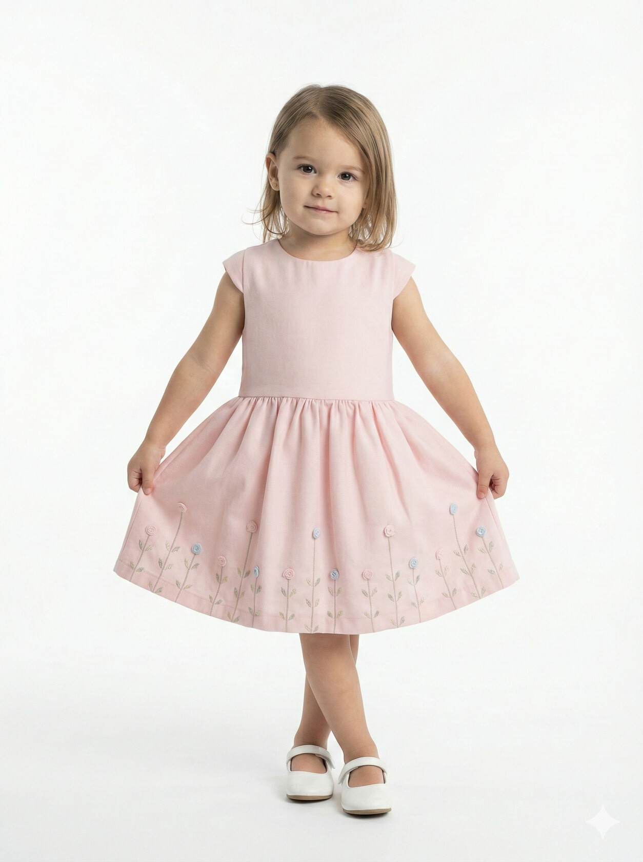 Bu kız çocuk elbisesi, bahar ayları için mükemmel bir seçimdir. Elbise, sıfır yaka ve kolsuz tasarımıyla rahat bir kullanım sunar. Diz hizasında midi boyda olup, etek kısmında pembe ve gri küçük çiçek detaylarıyla süslenmiştir. Üzerine giyilen pembe hırka, uzun kollu ve düğmeli olup, küçük çiçek nakışlarıyla tamamlanmıştır. Bu kombin, hem şık hem de günlük kullanıma uygundur.