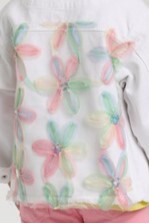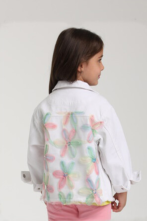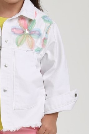 Bu şık kız çocuk ceketi, hem rahat hem de zarif bir görünüm sunar. Beyaz rengi ile yaz aylarında ferah bir seçenek sunarken, ön kısmındaki renkli çiçek detayları ile dikkat çeker. Hem günlük hem de özel günler için idealdir.