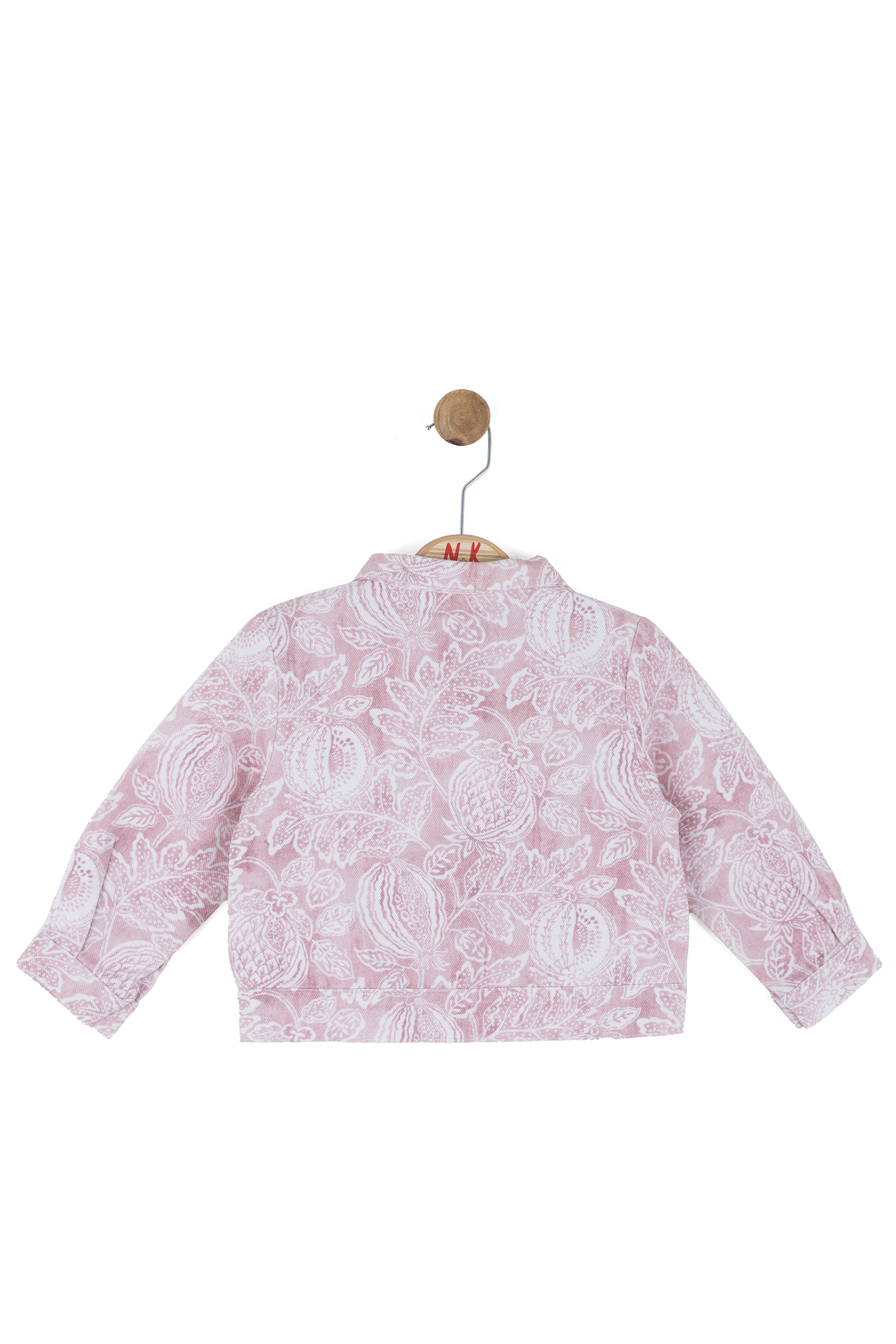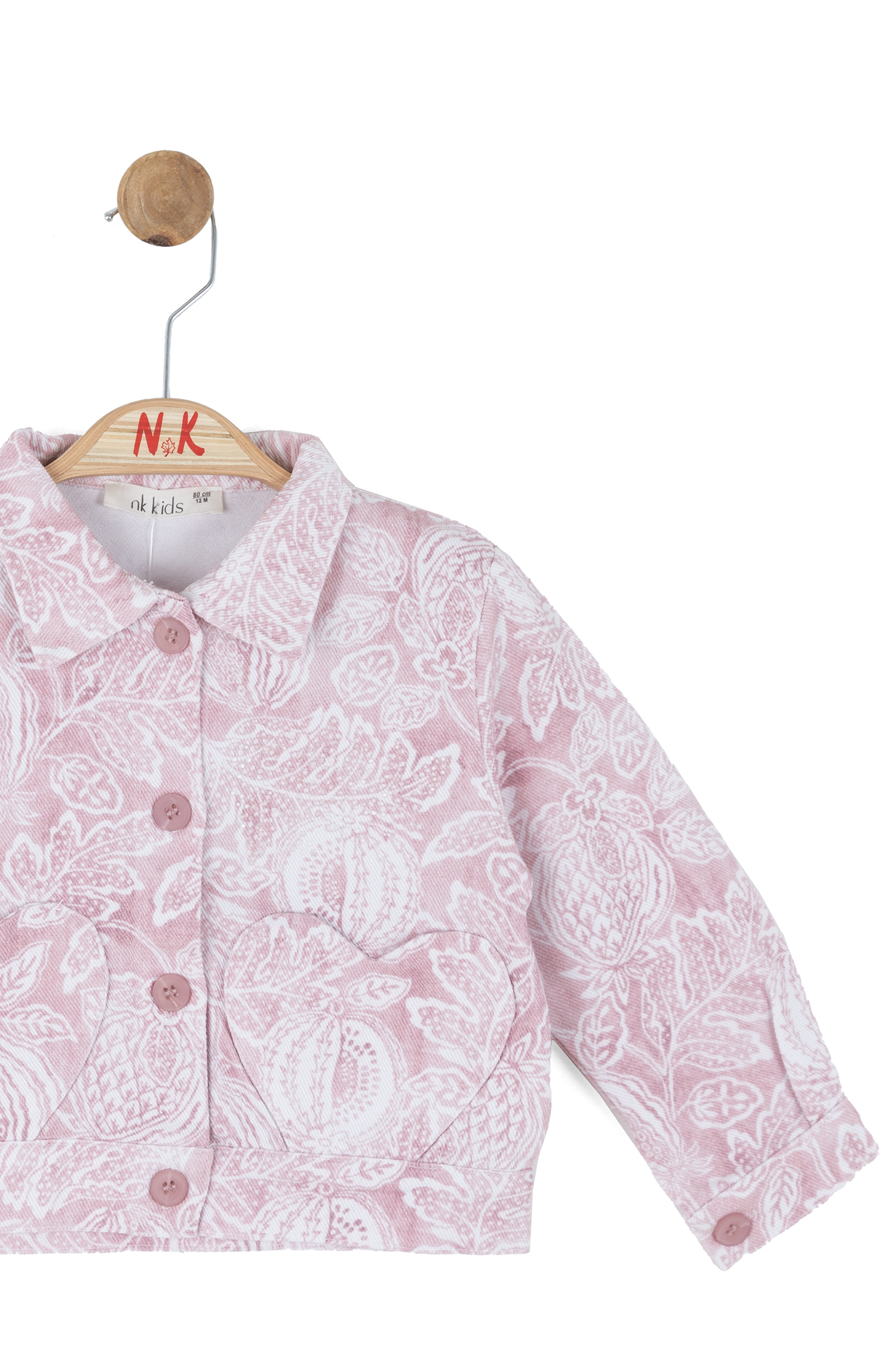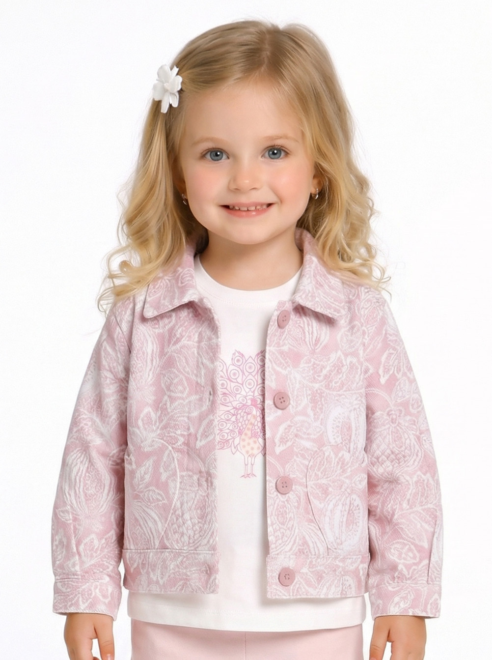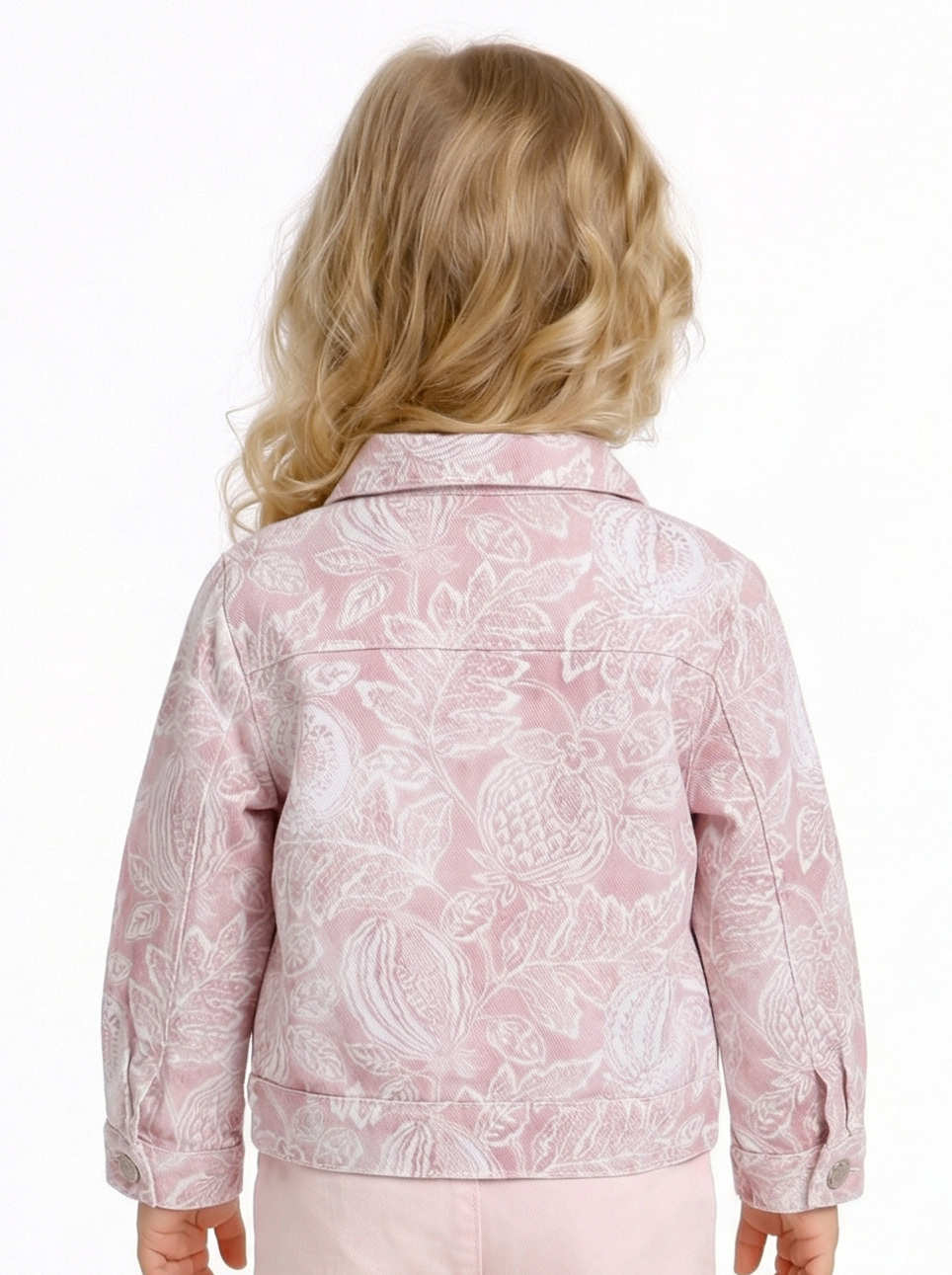 Bu kız çocuk ceketi, bahar mevsimi için ideal hafif bir dış giyim parçasıdır. Kapüşonsuz, klasik yakalı ve düğmeli ön kapama detayına sahiptir. Uzun kollu olan ceket, yumuşak yeşil tonlarında ve zarif beyaz yaprak desenleriyle süslenmiştir. Cepli tasarımı ve kısa boy uzunluğu sayesinde rahat ve kullanışlıdır. Günlük kullanıma uygun, şık ve doğal görünümlü bir seçenektir.