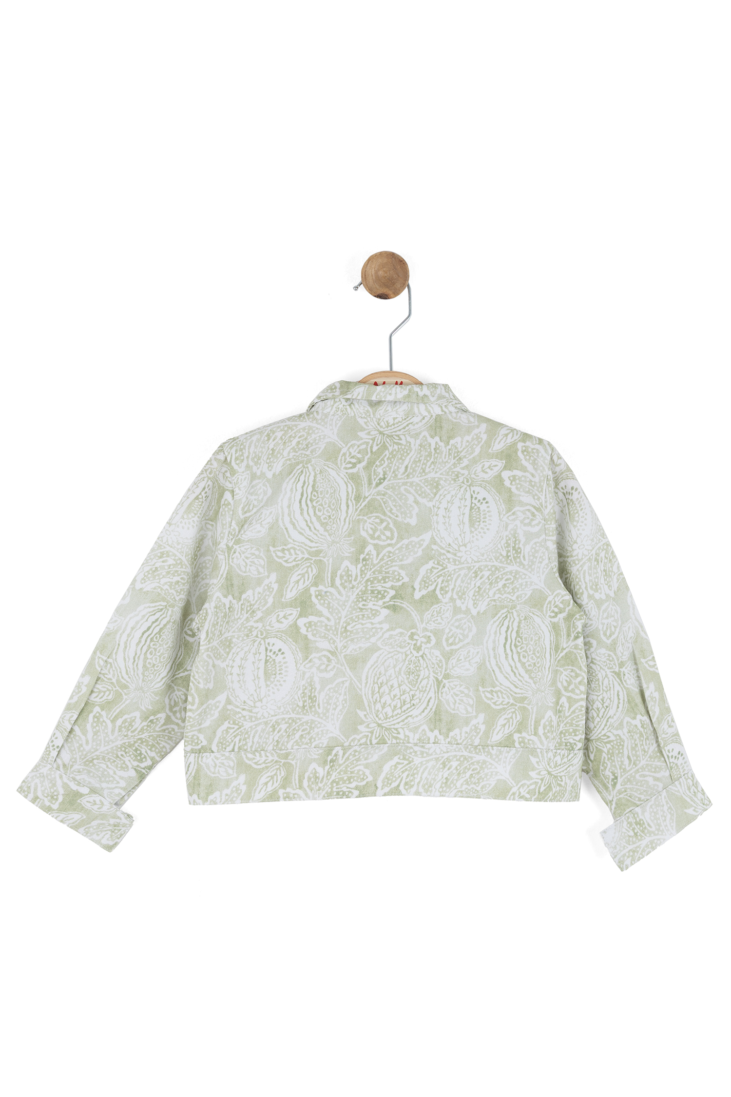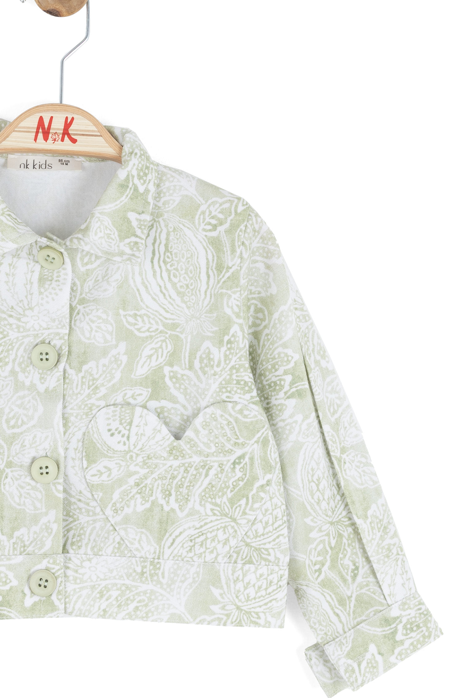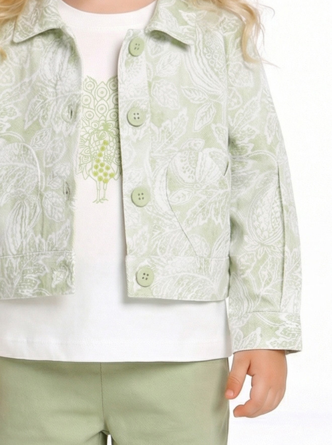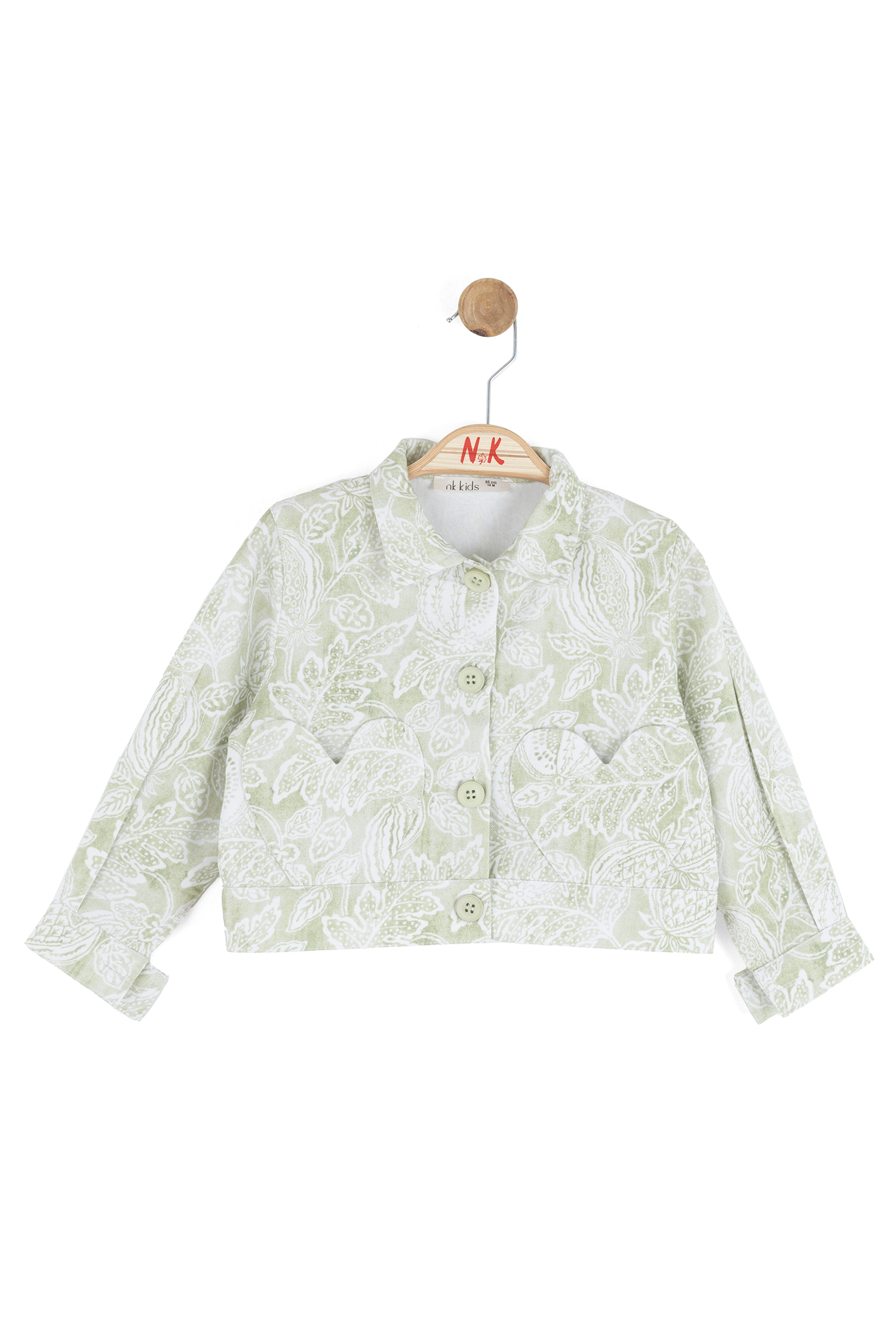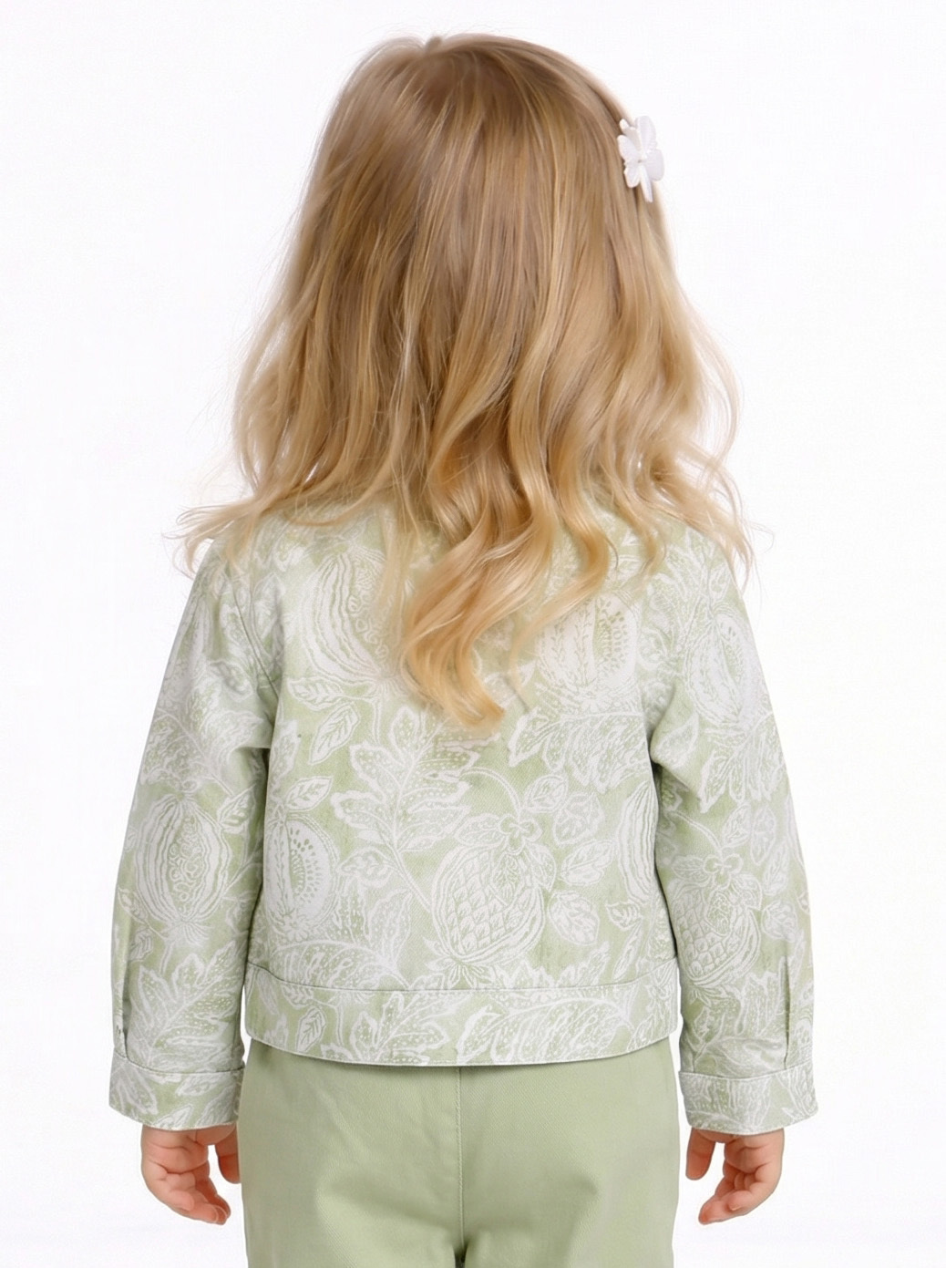 Bu kız çocuk ceketi, bahar mevsimi için ideal hafif bir dış giyim parçasıdır. Kapüşonsuz, klasik yakalı ve düğmeli ön kapama detayına sahiptir. Uzun kollu olan ceket, yumuşak yeşil tonlarında ve zarif beyaz yaprak desenleriyle süslenmiştir. Cepli tasarımı ve kısa boy uzunluğu sayesinde rahat ve kullanışlıdır. Günlük kullanıma uygun, şık ve doğal görünümlü bir seçenektir.