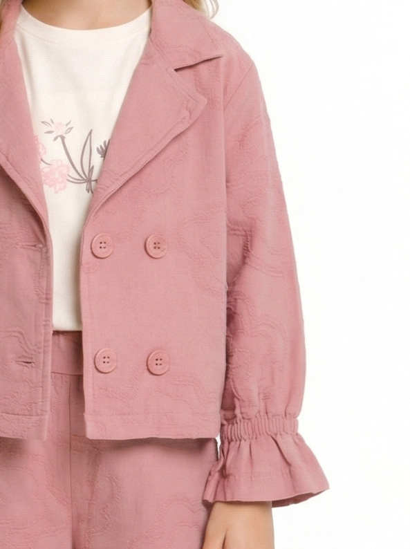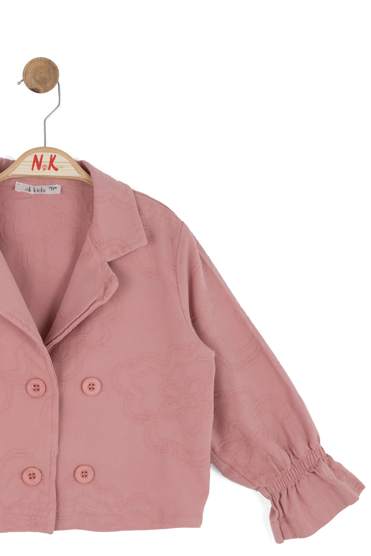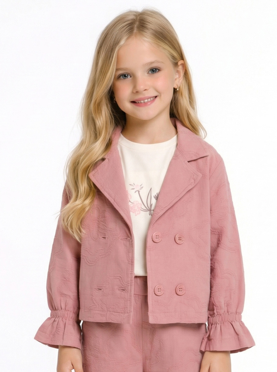Bu kız çocuk ceketi, bahar mevsimi için ideal hafif ve şık bir tercihtir. Kapüşonsuz ve çift düğmeli ön tasarımı ile klasik bir ceket görünümü sunar. Uzun kollu ve bilek kısmında lastikli detaylarla konforlu bir kullanım sağlar. Soft yeşil tonundaki kumaş, cekete zarif bir doku kazandıran kabartmalı desenlere sahiptir. Günlük ve özel kombinlerde rahatlıkla kullanılabilir.