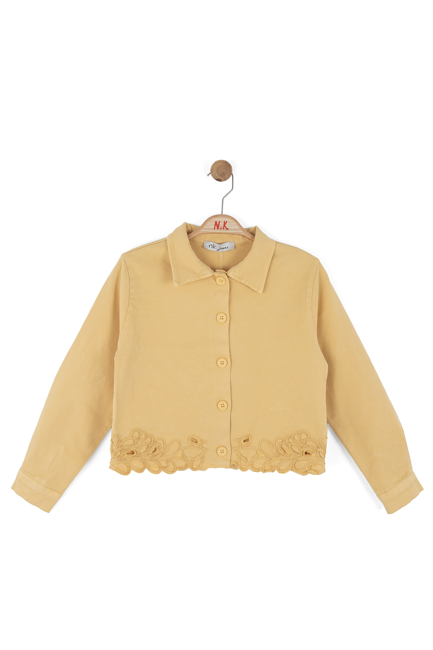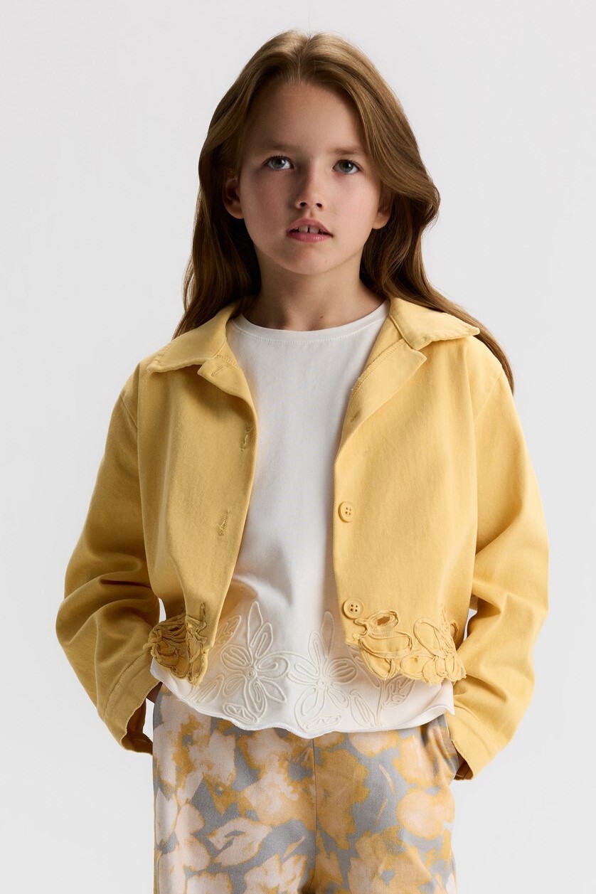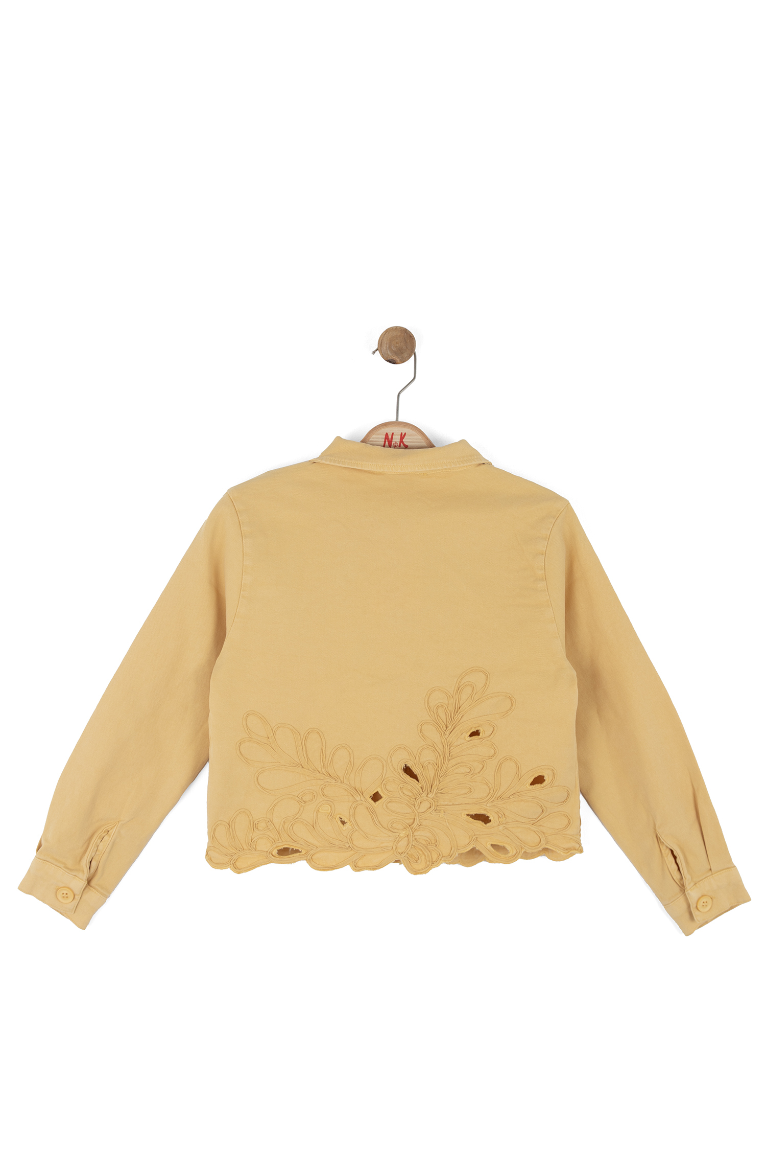 Bu kız çocuk ceketi, bahar sezonu için tasarlanmış şık ve rahat bir parçadır. Krem-sarı tonlarında, kısa ve crop kesim modeliyle modern bir görünüm sunar. Ceket, klasik yaka tipi ve düğme kapamalı ön tasarımıyla sade ama dikkat çekici bir stilde. Bel kısmında ve arka bölümde bulunan zarif çiçek desenli işlemeler, cekete özgünlük ve feminen bir dokunuş katmaktadır. Uzun kollu yapısı ve rahat kesimi sayesinde çocukların hareket özgürlüğünü kısıtlamadan konfor sağlar.