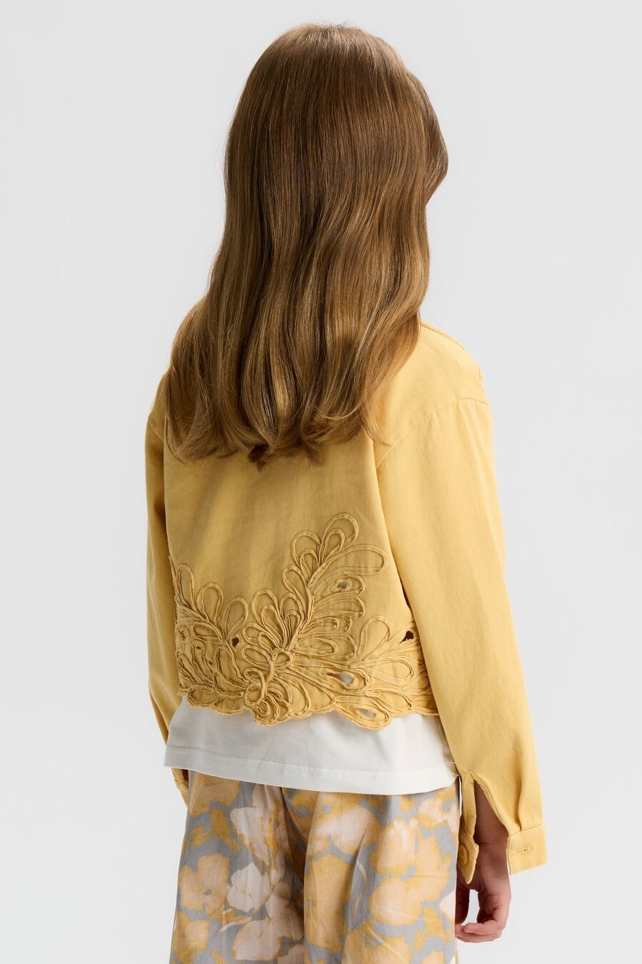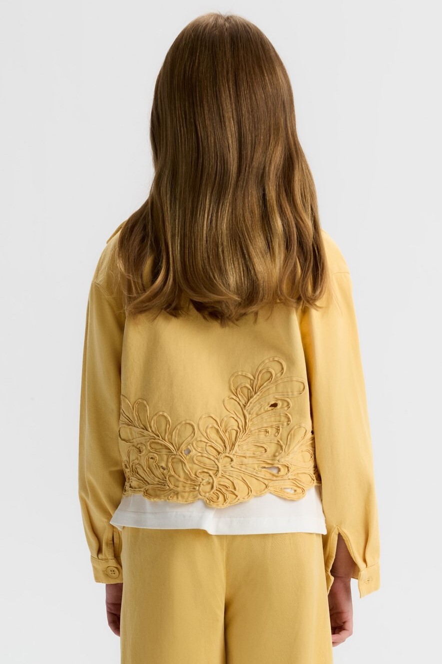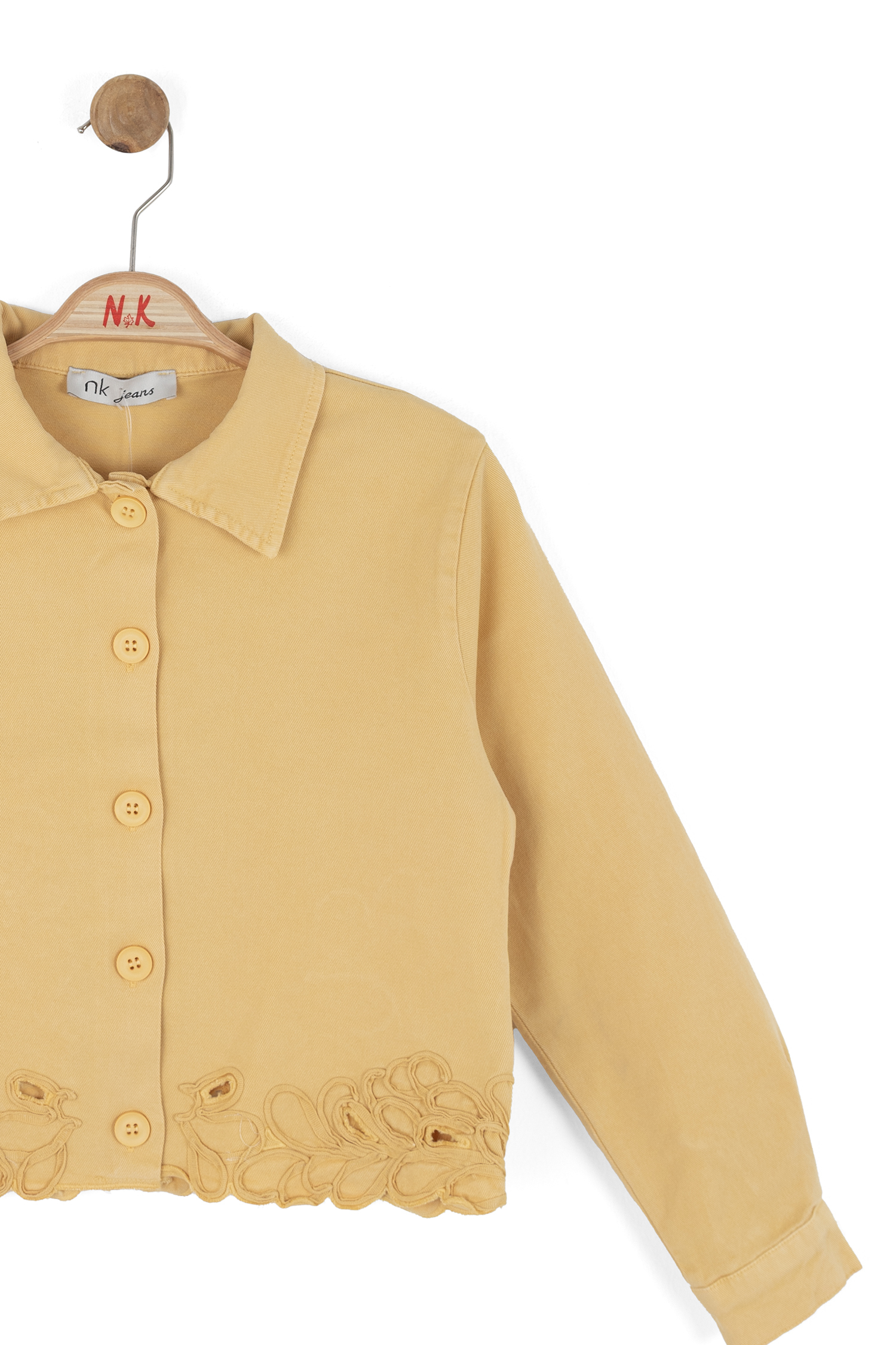 Bu kız çocuk ceketi, bahar sezonu için tasarlanmış şık ve rahat bir parçadır. Krem-sarı tonlarında, kısa ve crop kesim modeliyle modern bir görünüm sunar. Ceket, klasik yaka tipi ve düğme kapamalı ön tasarımıyla sade ama dikkat çekici bir stilde. Bel kısmında ve arka bölümde bulunan zarif çiçek desenli işlemeler, cekete özgünlük ve feminen bir dokunuş katmaktadır. Uzun kollu yapısı ve rahat kesimi sayesinde çocukların hareket özgürlüğünü kısıtlamadan konfor sağlar.