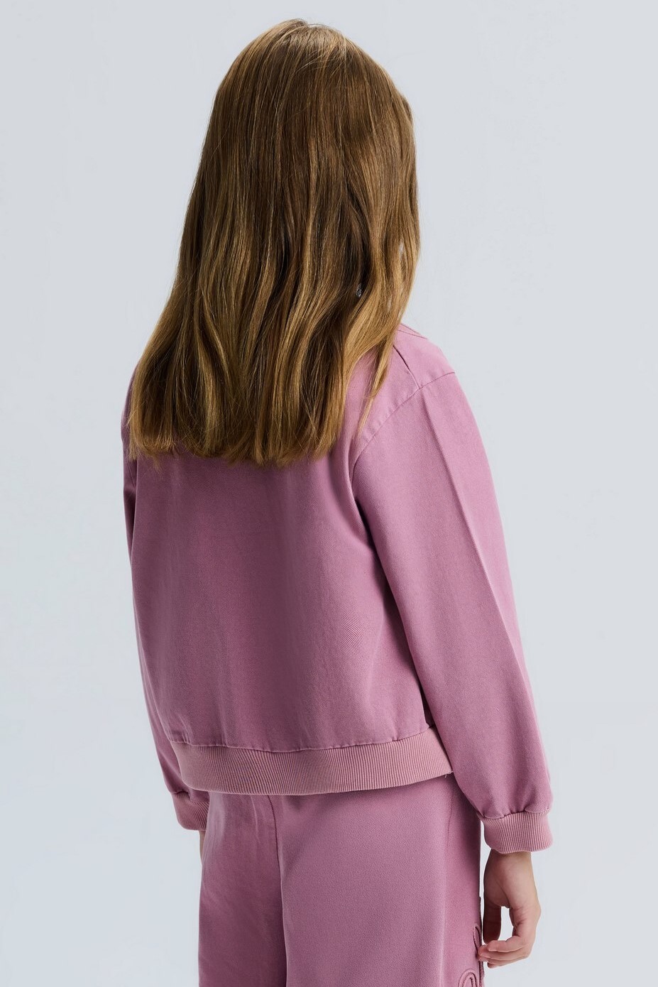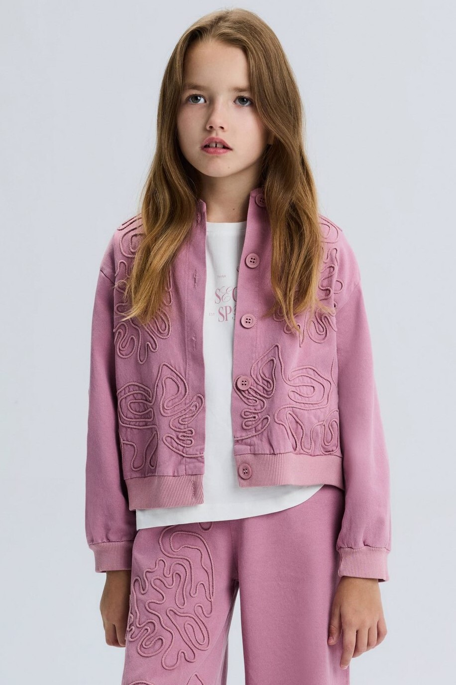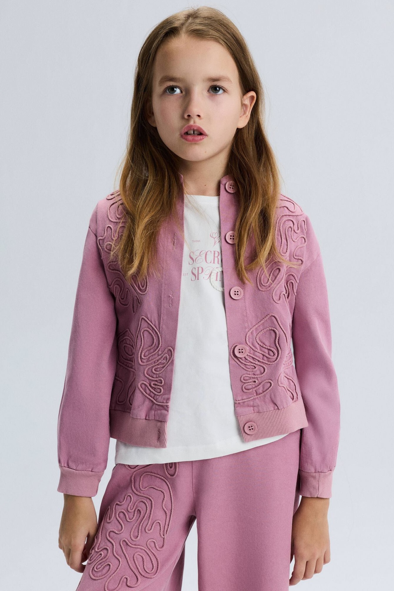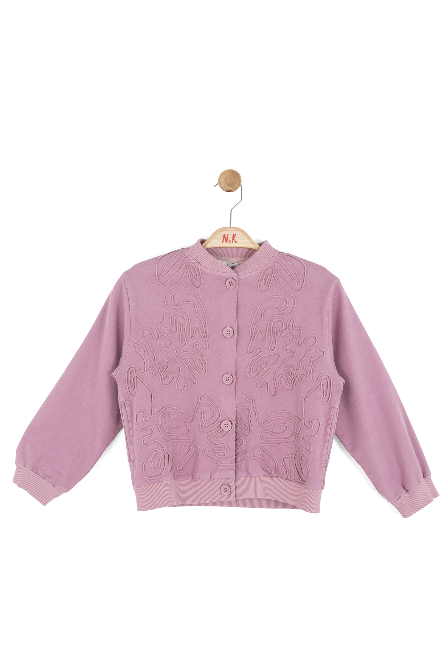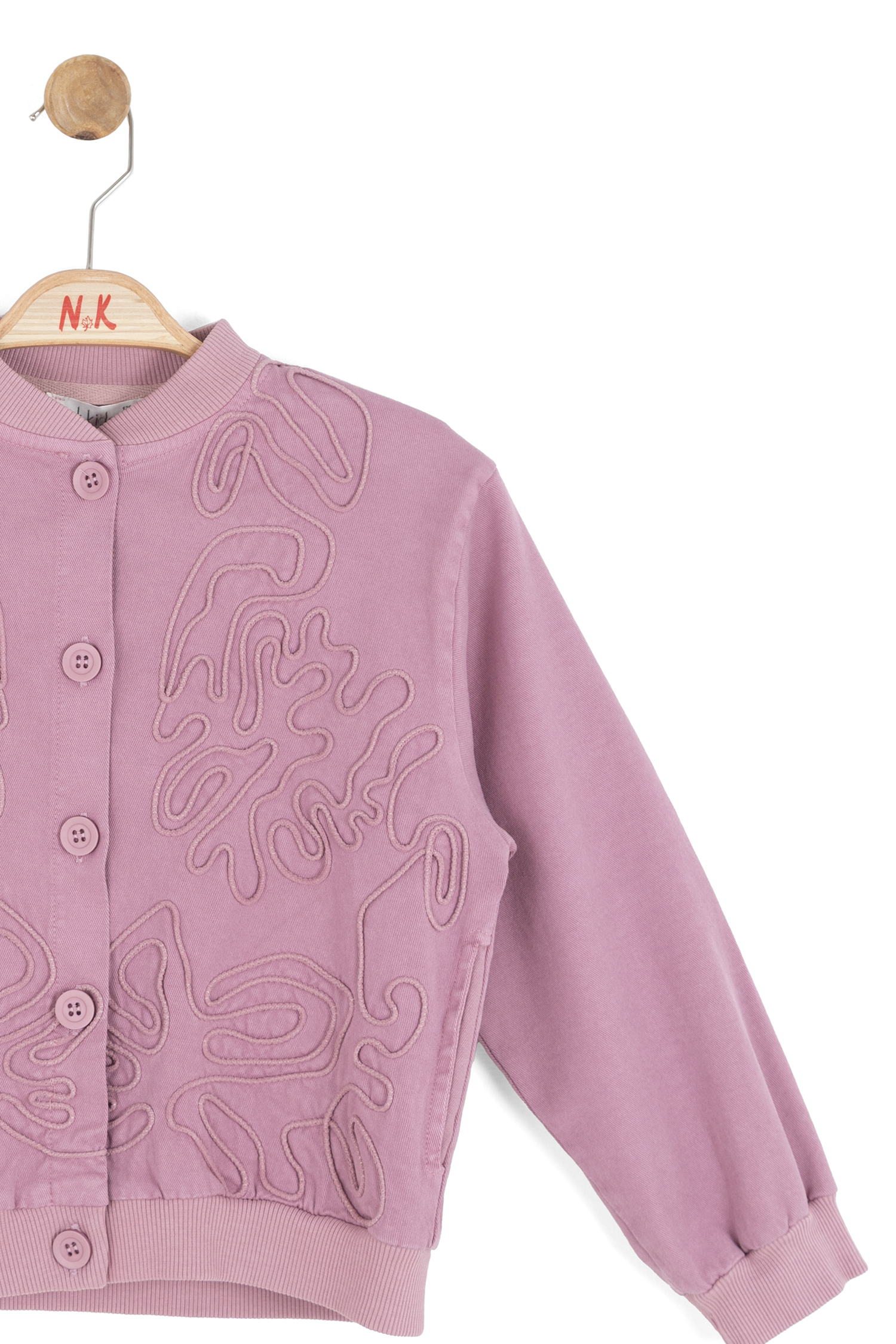 Bu kız çocuk ceketi, bahar sezonu için ideal yumuşak ve konforlu bir seçimdir. Kapüşonsuz, uzun kollu ve düğmeli tasarımıyla sade ama şık bir görünüm sunar. Ceketin ön kısmında ve alt etekte özgün kabartma desenler dikkat çekmektedir. Ribana manşetleri ve bel kısmı, cekete spor bir hava katarken, rahat bir kullanım sağlar. Ceket, günlük kullanım için hem şık hem de fonksiyonel bir dış giyim parçasıdır.