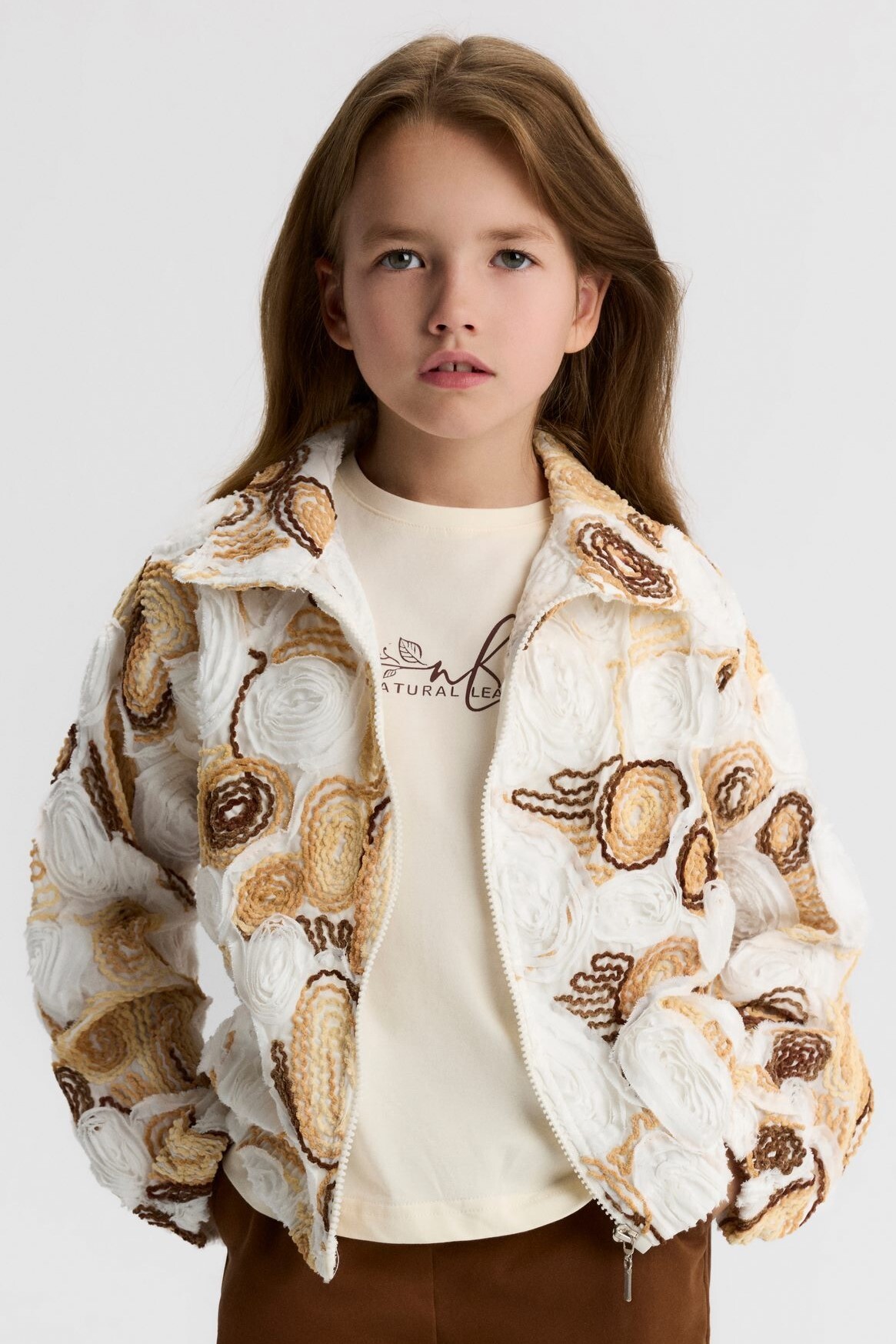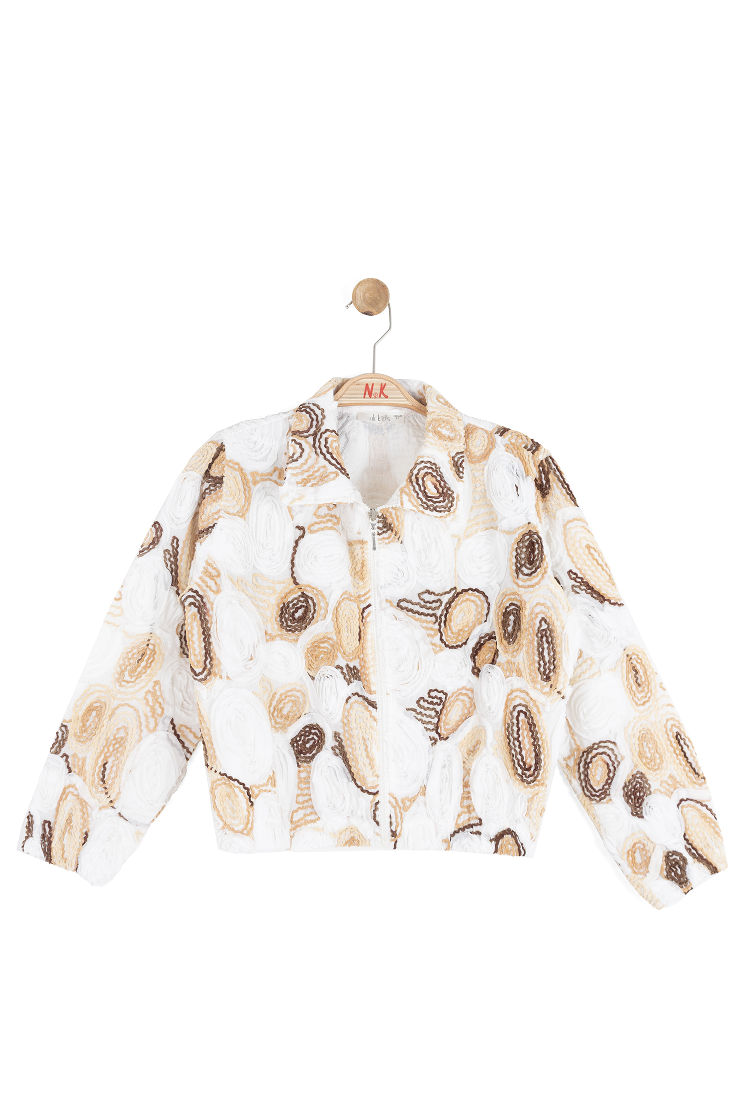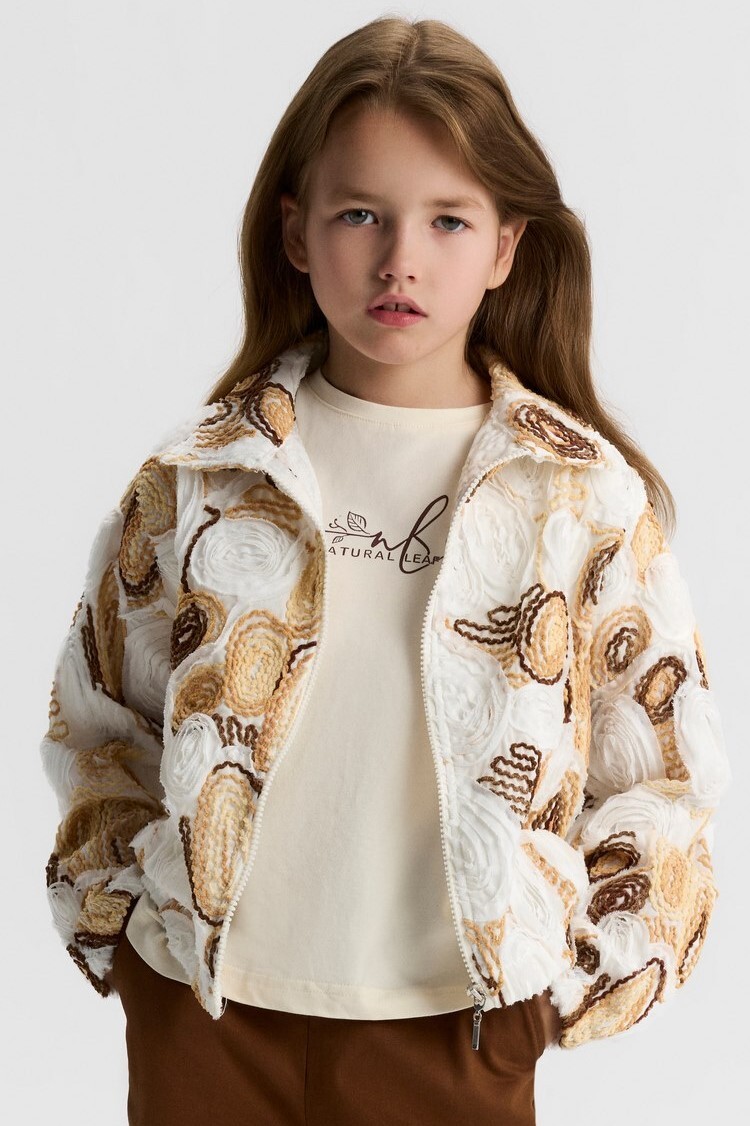 Bu kız çocuk ceketi, bahar ayları için ideal hafif ve şık bir seçenektir. Kapüşonsuz, kısa ve rahat kesimli olan ceket, tam fermuarlı kapanışı ile kolay kullanım sağlar. Kumaş üzerine işlenmiş çiçek desenleri ve dokulu yüzeyiyle dikkat çeker. Cepli ve uzun kollu olan bu ceket, hem spor hem de günlük kullanıma uygundur. Ekru, camel ve kahverengi tonlarının bir arada kullanıldığı renk paleti, doğal ve sıcak bir görünüm sunar.