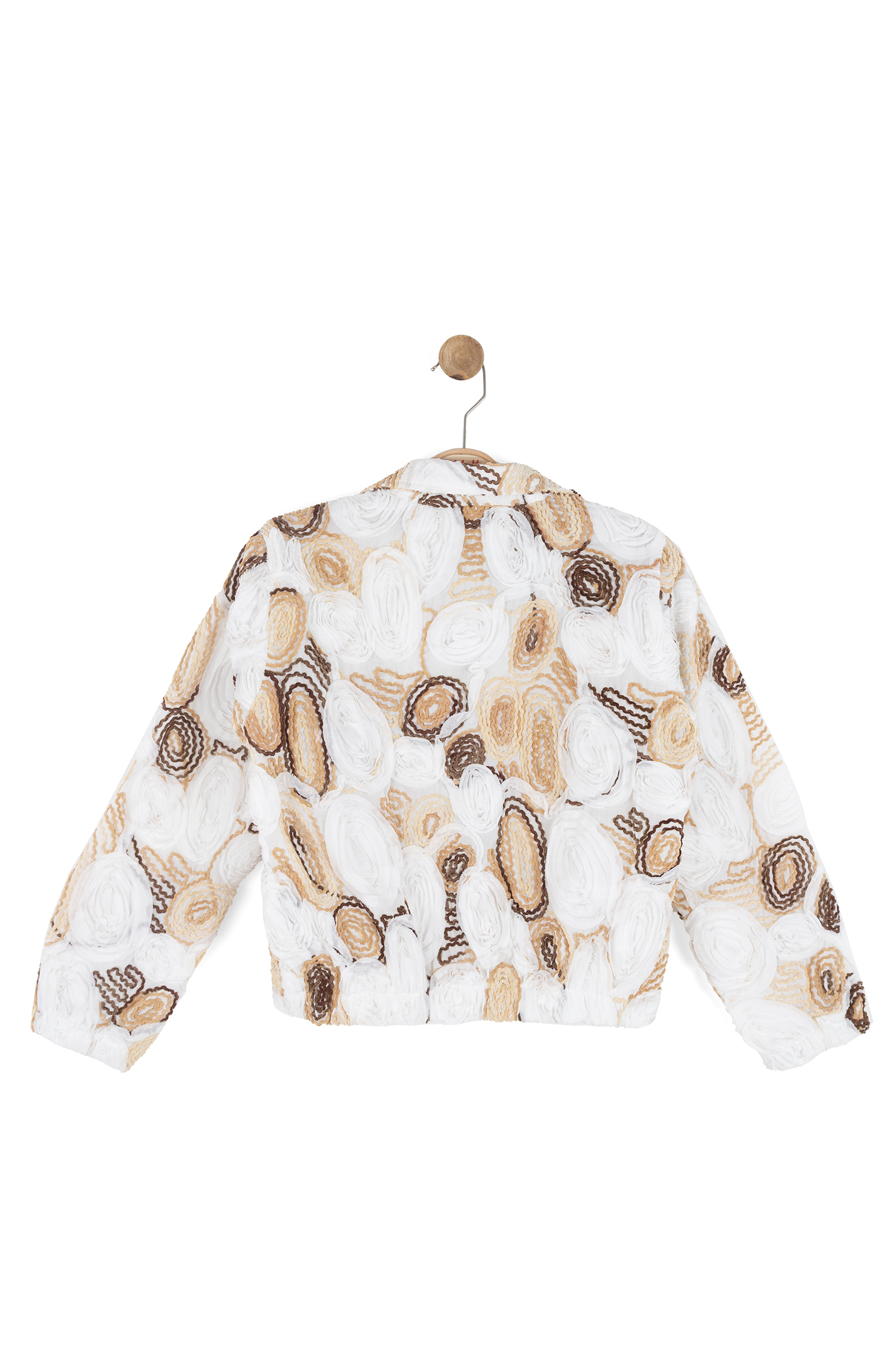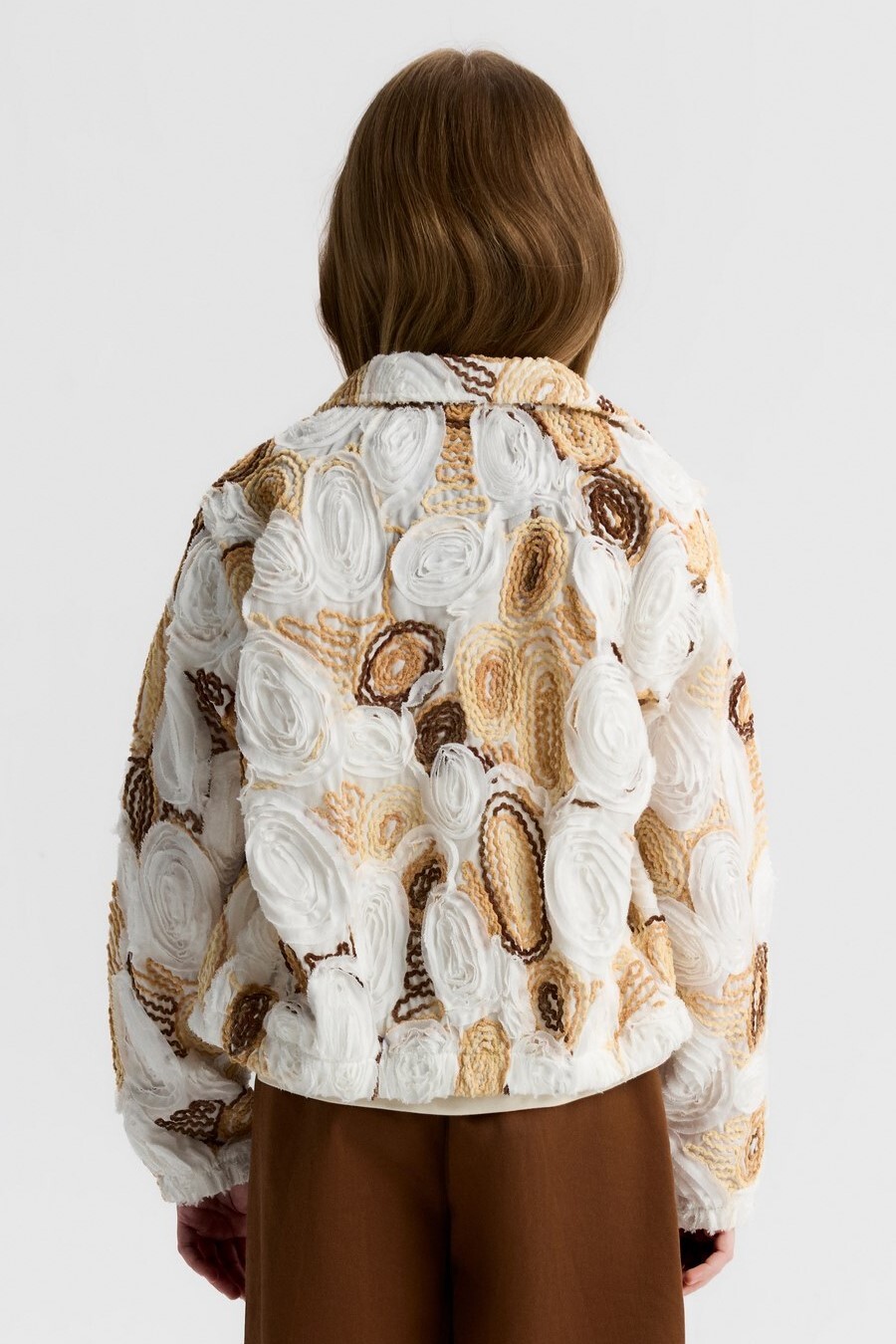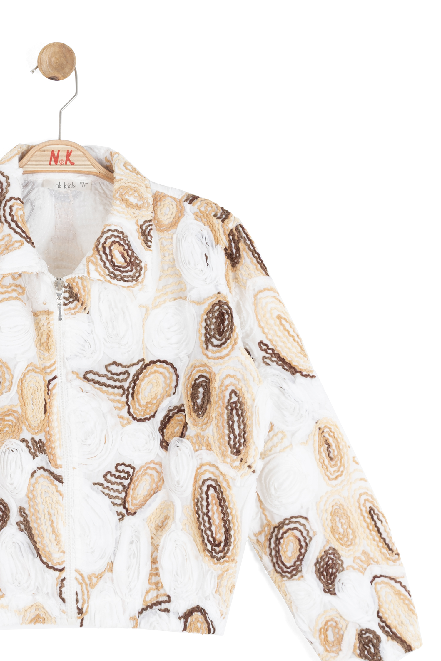 Bu kız çocuk ceketi, bahar ayları için ideal hafif ve şık bir seçenektir. Kapüşonsuz, kısa ve rahat kesimli olan ceket, tam fermuarlı kapanışı ile kolay kullanım sağlar. Kumaş üzerine işlenmiş çiçek desenleri ve dokulu yüzeyiyle dikkat çeker. Cepli ve uzun kollu olan bu ceket, hem spor hem de günlük kullanıma uygundur. Ekru, camel ve kahverengi tonlarının bir arada kullanıldığı renk paleti, doğal ve sıcak bir görünüm sunar.