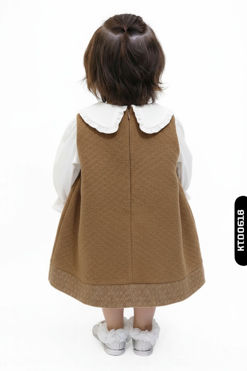 Bu şık kız çocuk elbisesi, kış ayları için ideal sıcak ve yumuşak bir kumaşa sahiptir. Elbise, uzun kollu beyaz iç bluz ile birlikte kullanılmıştır ve kolları lastikli, hafif volanlıdır. Sıfır yaka olan beyaz yakada ince fırfır detayları bulunur ve çok zarif bir görünüm sağlar. Kahverengi tonlarında olan elbisenin ön kısmında sevimli, peluş ayıcık figürü yer alıyor, bu da ürüne eğlenceli ve çocukların ilgisini çekecek bir dokunuş katıyor. Elbisenin arka kısmında gizli fermuar vardır, böylece kolayca giyilip çıkarılabilir. Diz hizasında, midi uzunlukta olan bu model sıcak tutarken aynı zamanda rahat hareket imkanı da sunar.