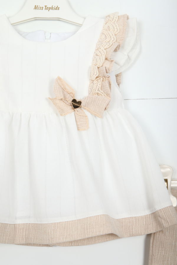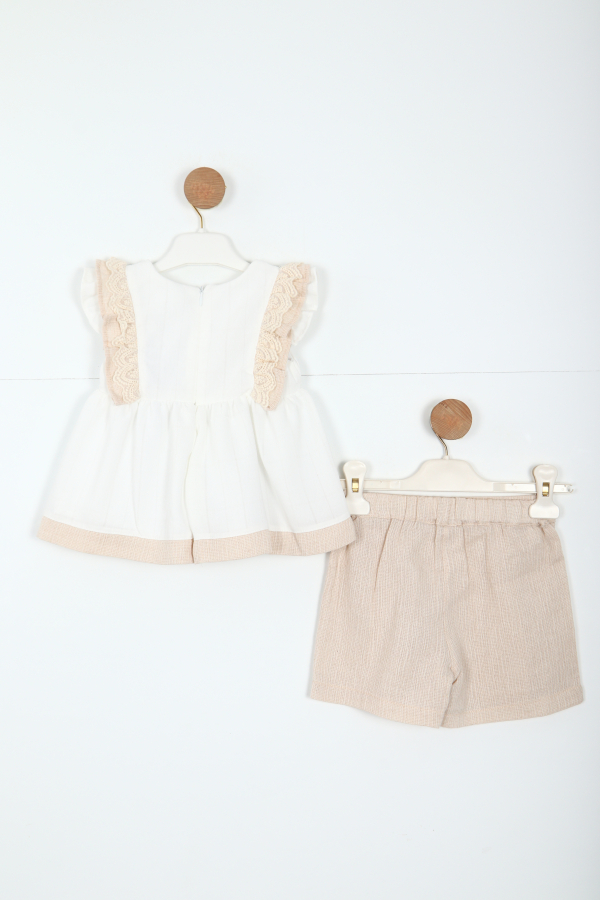 Bu şık kız çocuk elbise takımı, rahatlığı ve zarafeti bir arada sunar. Üst parça beyaz renkte, kısa kollu ve sıfır yaka tasarıma sahip olup, omuzlarında bej tonlarında dantel detayları ve fırfırlar bulunur. Göğüs kısmında aynı tonda sevimli bir fiyonk süsleme yer alır. Elbisenin etek ucu da bej renkte, dokulu bir kumaşla tamamlanmıştır. Alt parça ise bej tonlarında, hafif dokulu, rahat kalıplı şort şeklindedir. Bu takım günlük kullanıma ve özel günlere uygun, zarif ve konforlu bir seçimdir.