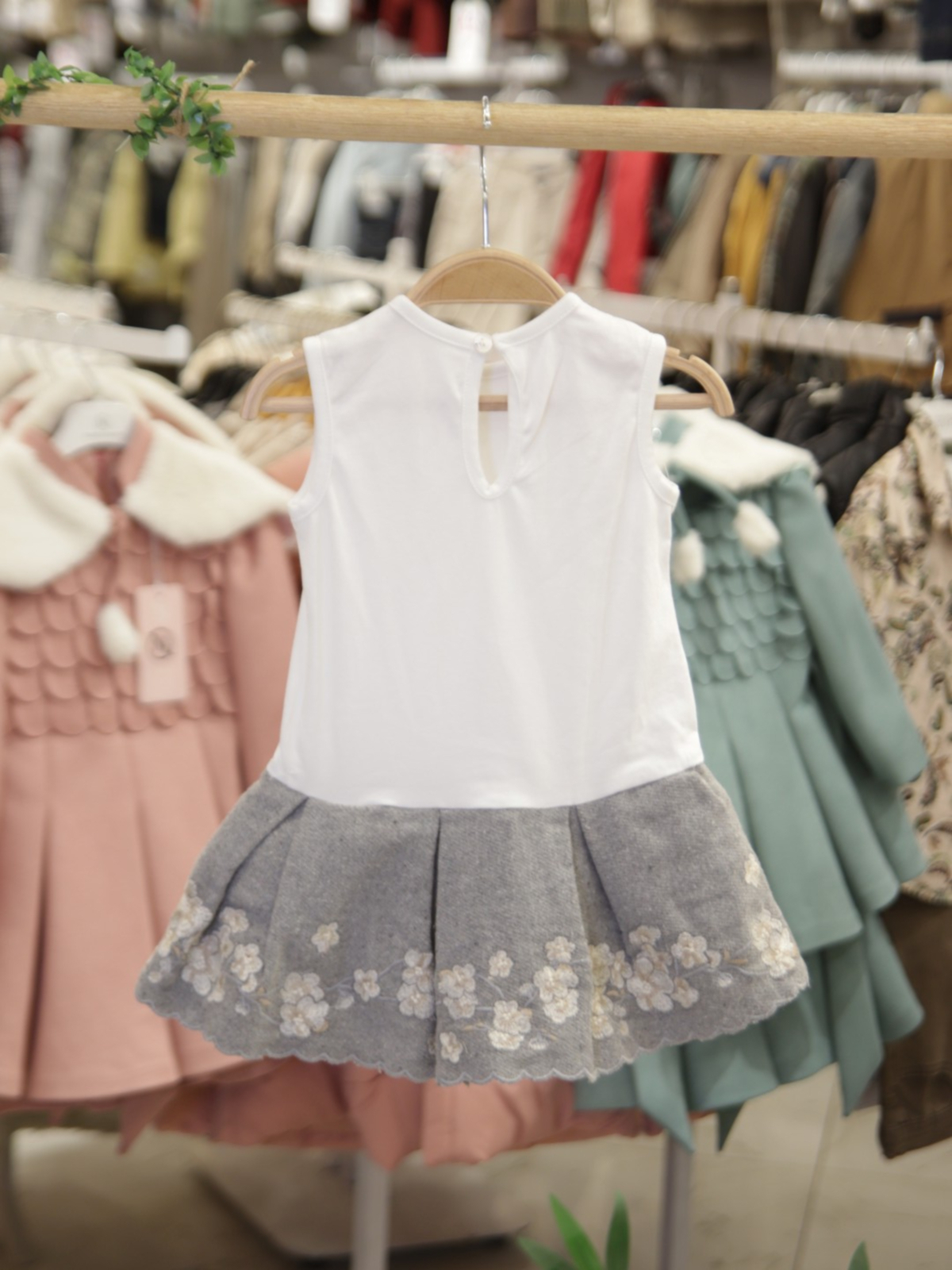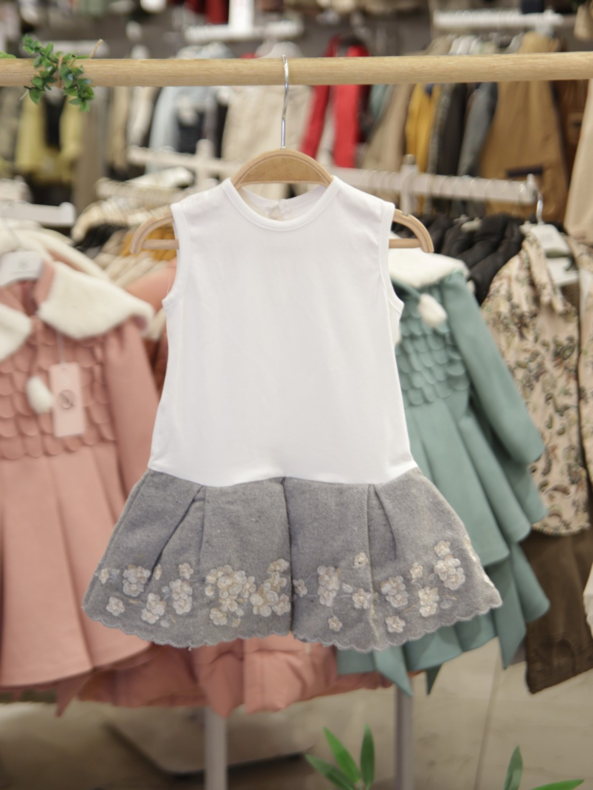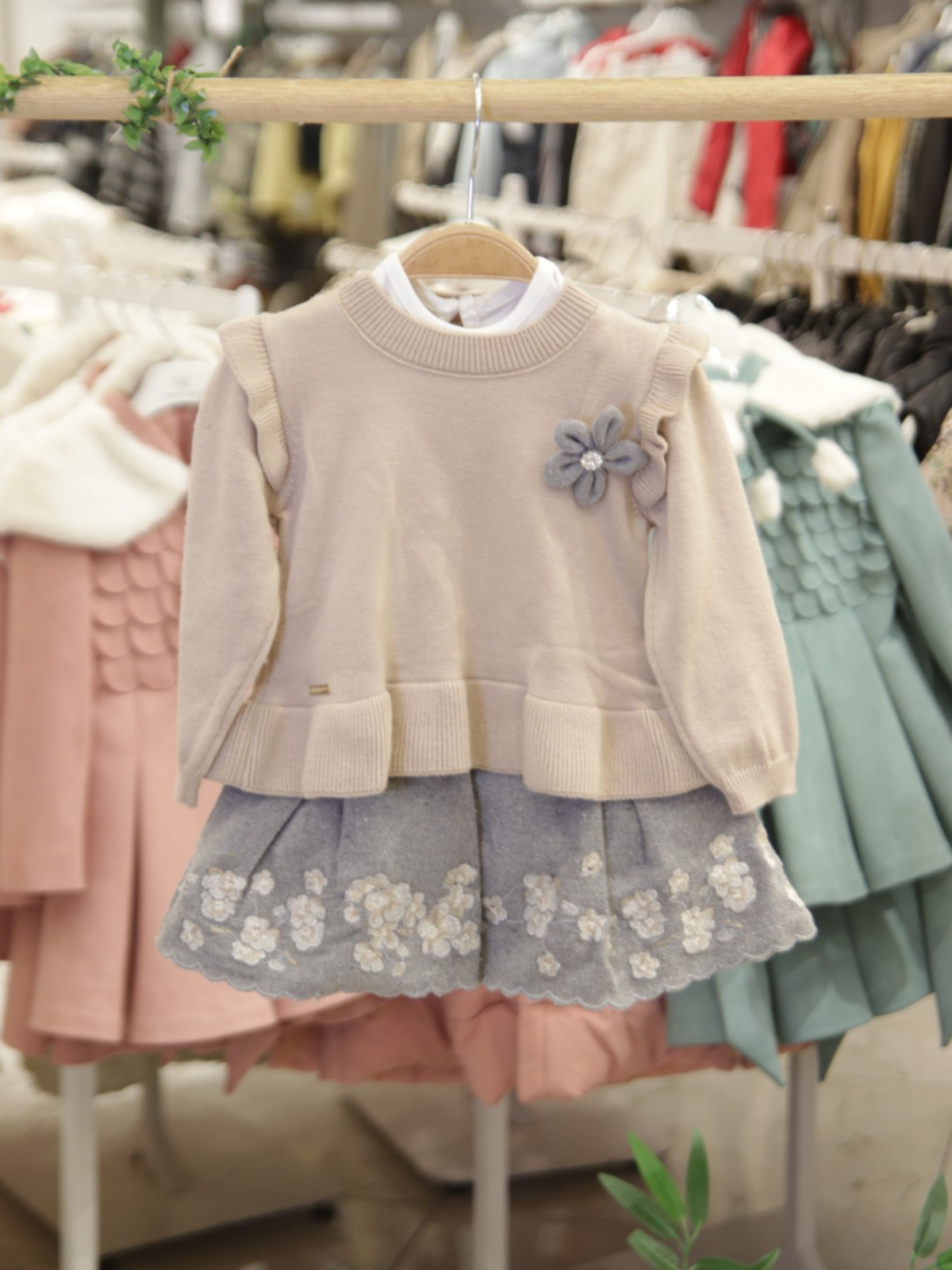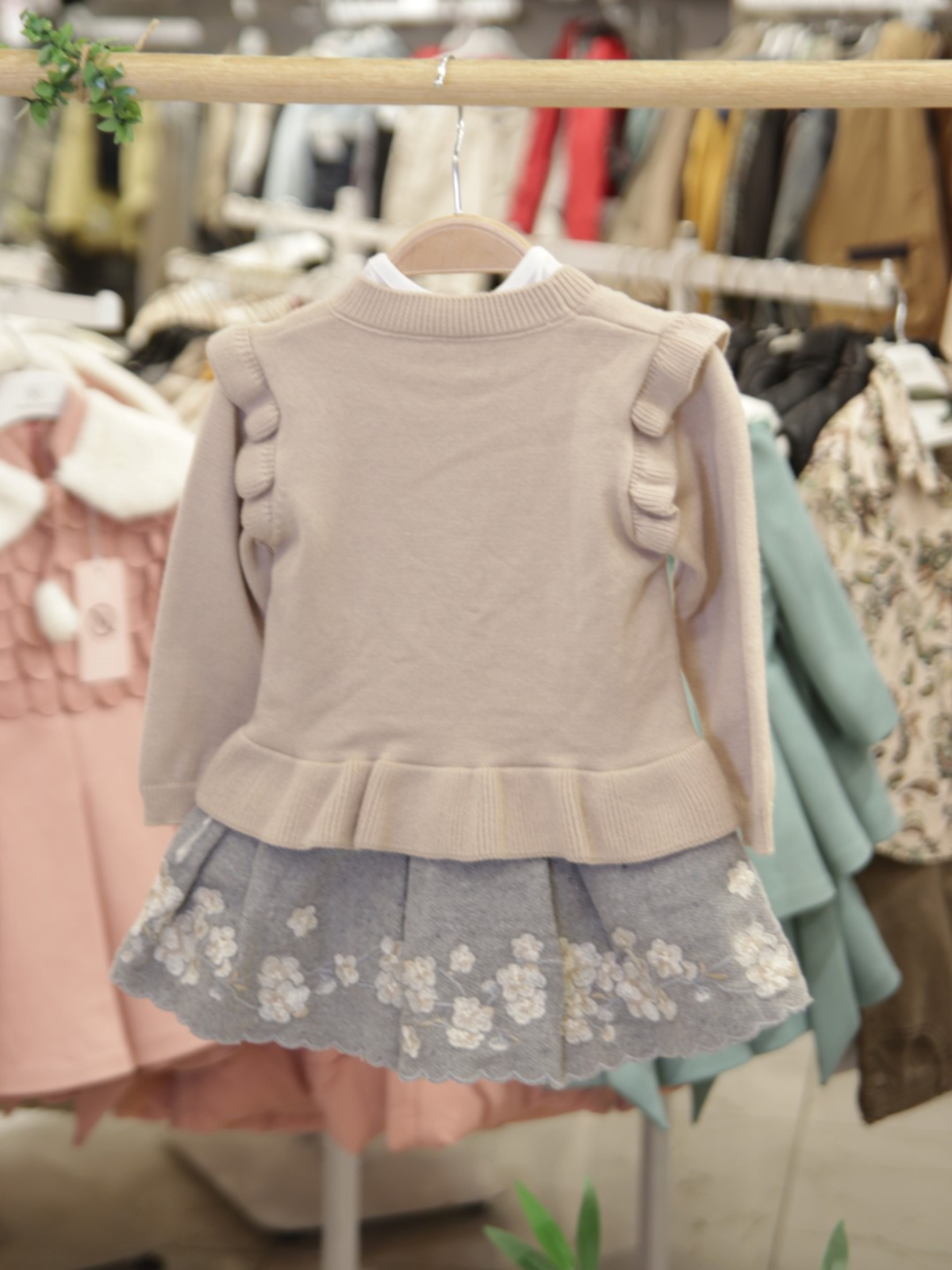 Bu kız çocuk elbisesi, kış sezonu için ideal, şık ve rahat bir tasarıma sahiptir. Üst kısmı bej tonunda, uzun kollu ve sıfır yakalıdır. Omuzlarda fırfırlı detaylarla süslenmiş, sade ama zarif bir görünüm sunar. Elbisenin etek bölümü gri renkte ve uç kısmında bej çiçek işlemeleri ile zarif bir desen taşır. Etek ucu dalgalı kesimlidir. Kombin, bej renkli tayt ve botlarla tamamlanarak sıcak tutan ve şık bir kış kıyafeti oluşturur.