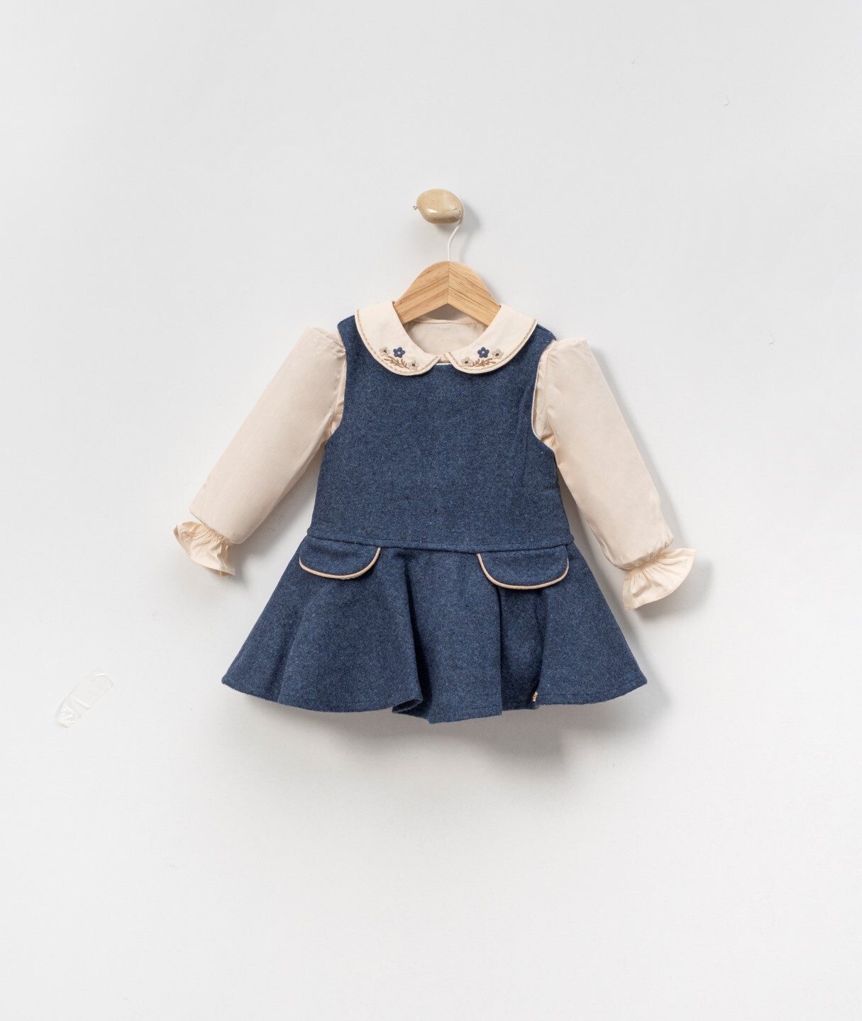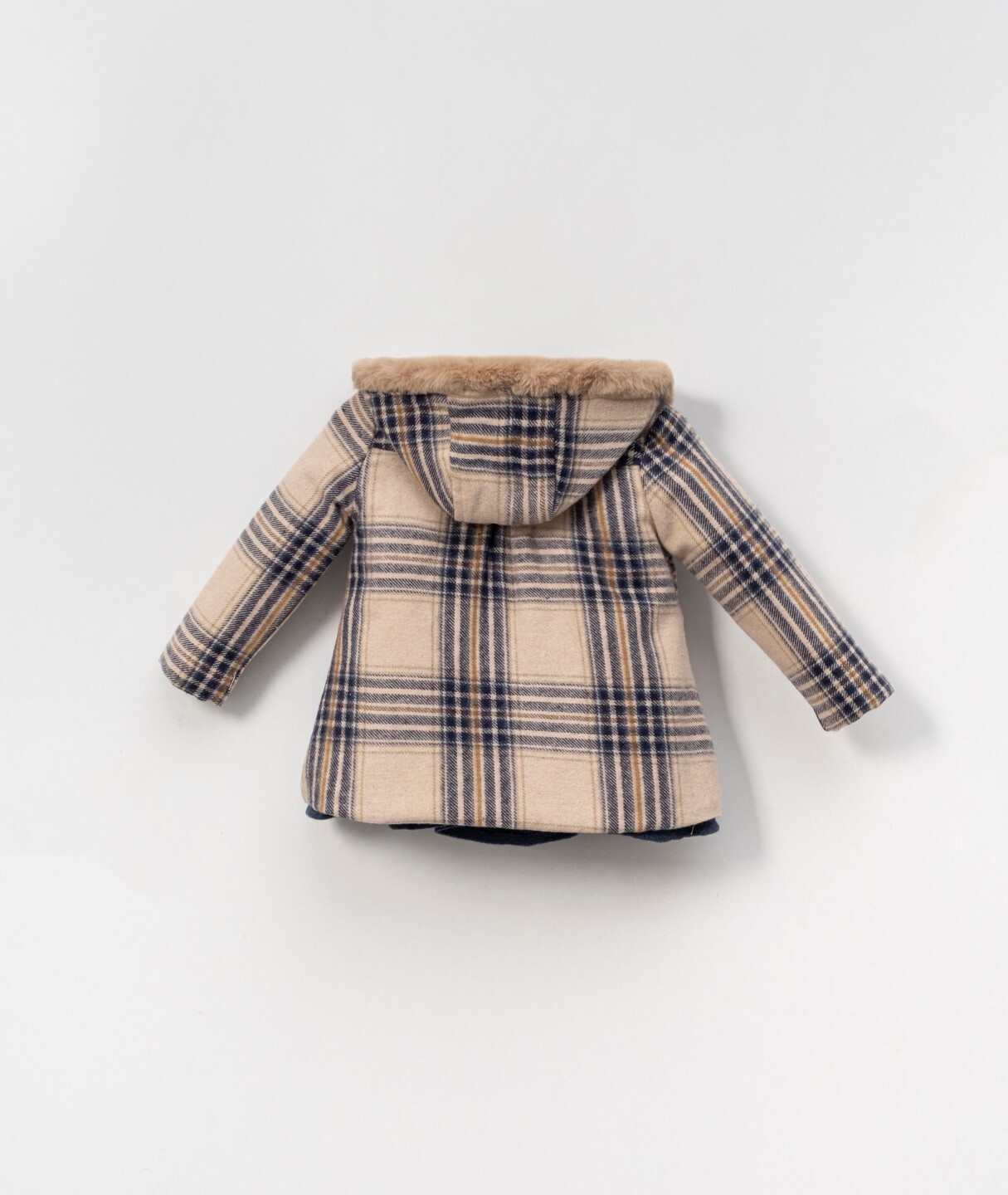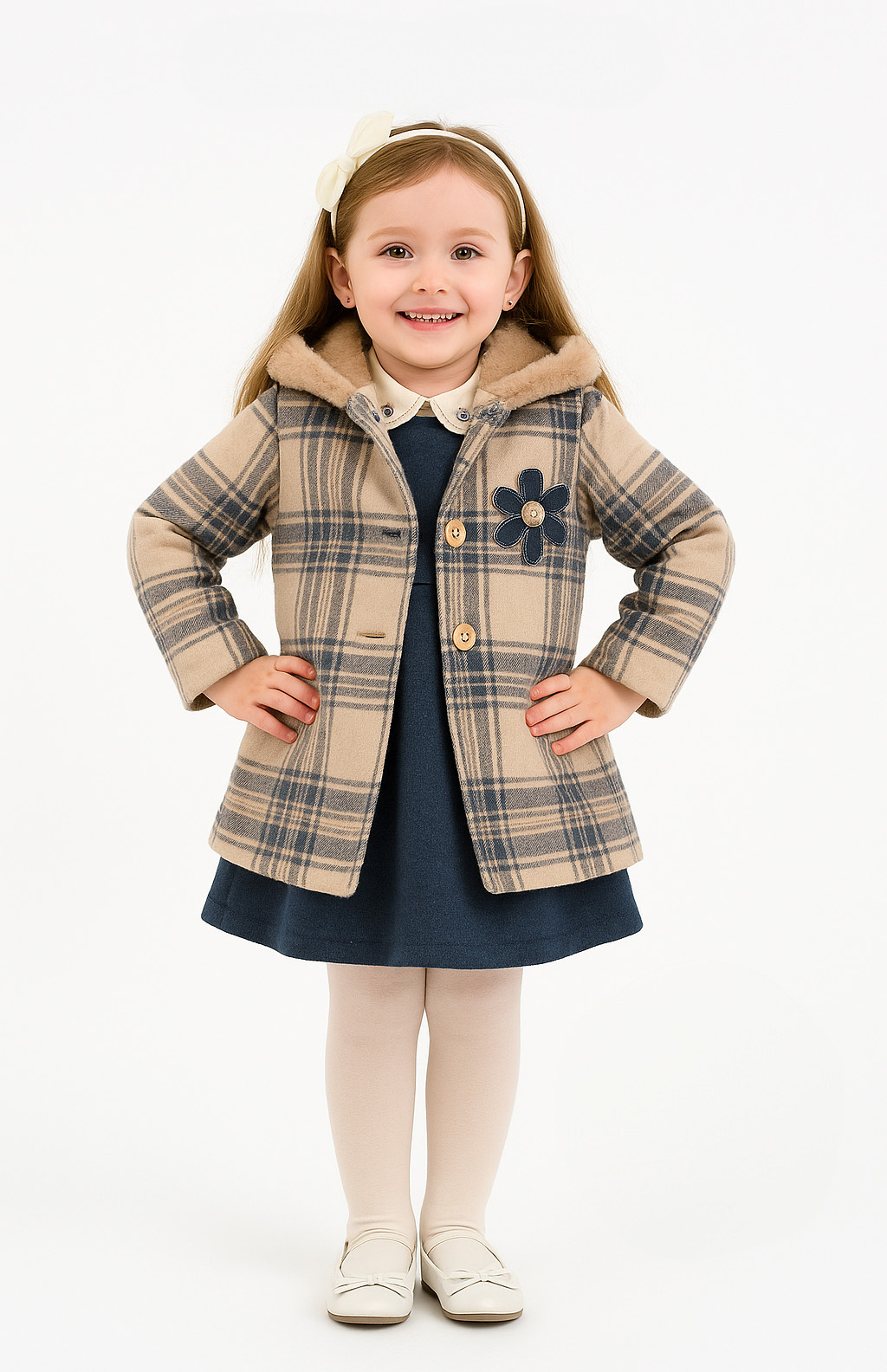 Bu şık kız çocuk elbisesi, soğuk kış günlerinde sıcak ve rahat bir seçim sunar. Lacivert tonlarında, uzun kollu, fırfırlı manşetli ve işlemeli yakalı elbisenin üzerine giyilen bej ve lacivert ekoseli, kapüşonlu, düğmeli dış giyim parçası, hem koruyucu hem de şık bir görünüm sağlar. Kürklü kapüşon detayı, soğuk havalarda ekstra sıcaklık sunarken, elbisenin etek kısmındaki geniş ve hareketli formu çocukların rahatça hareket etmesine olanak verir.