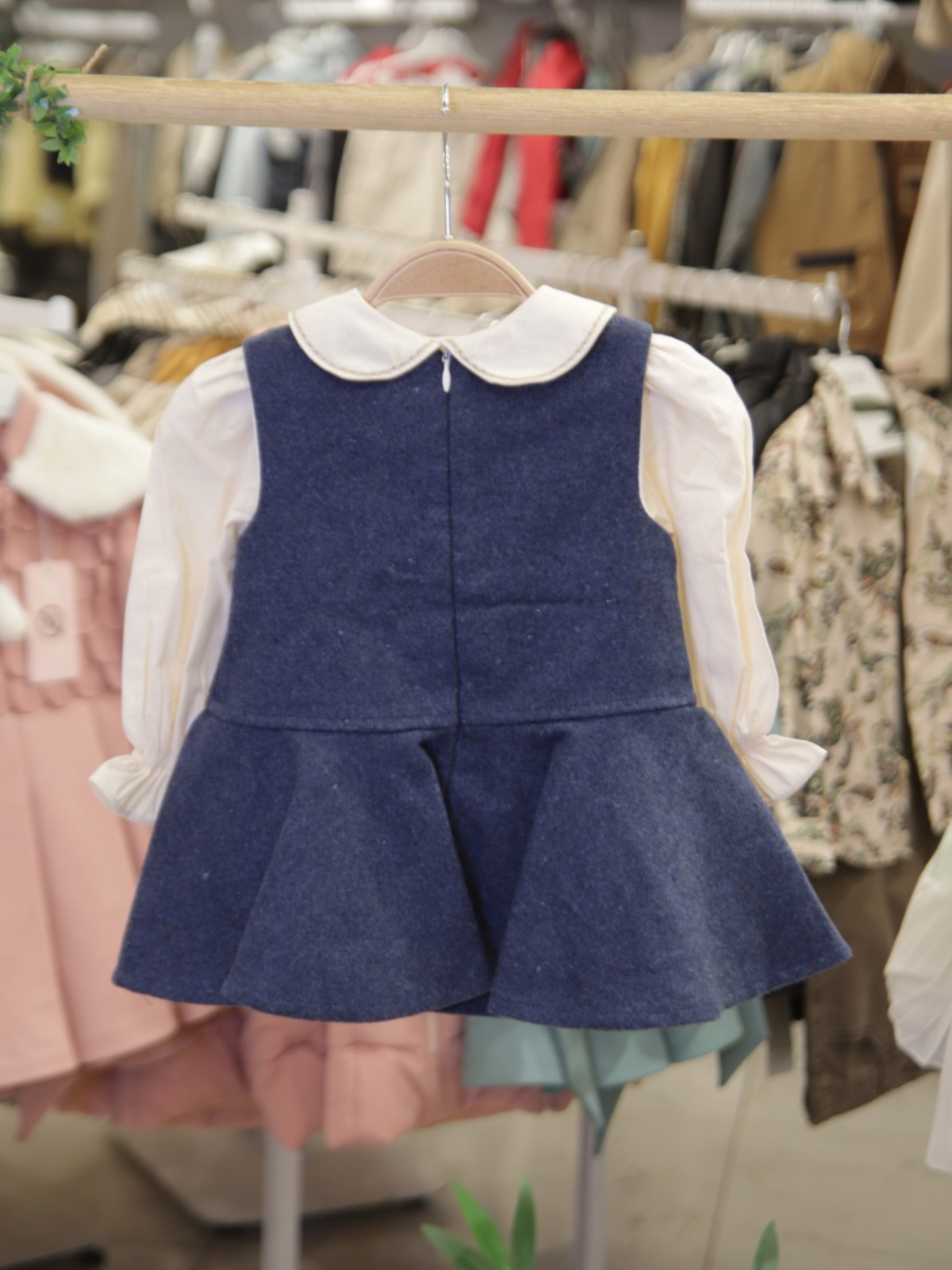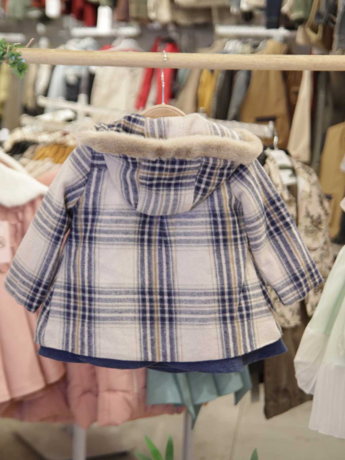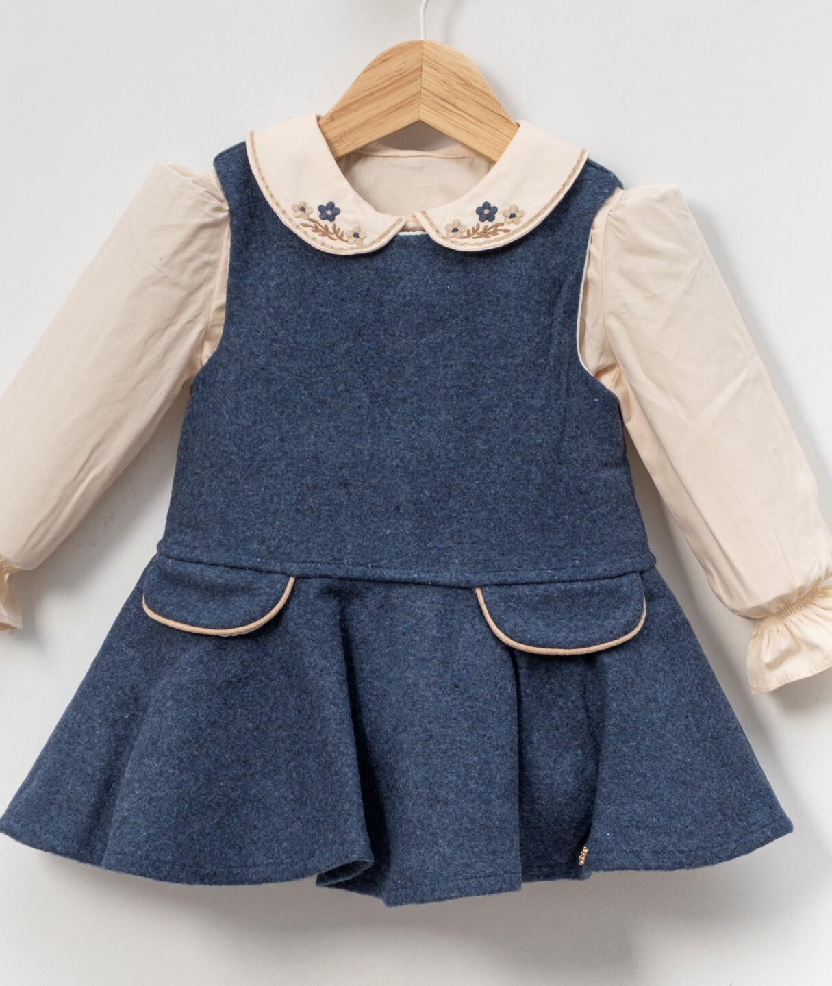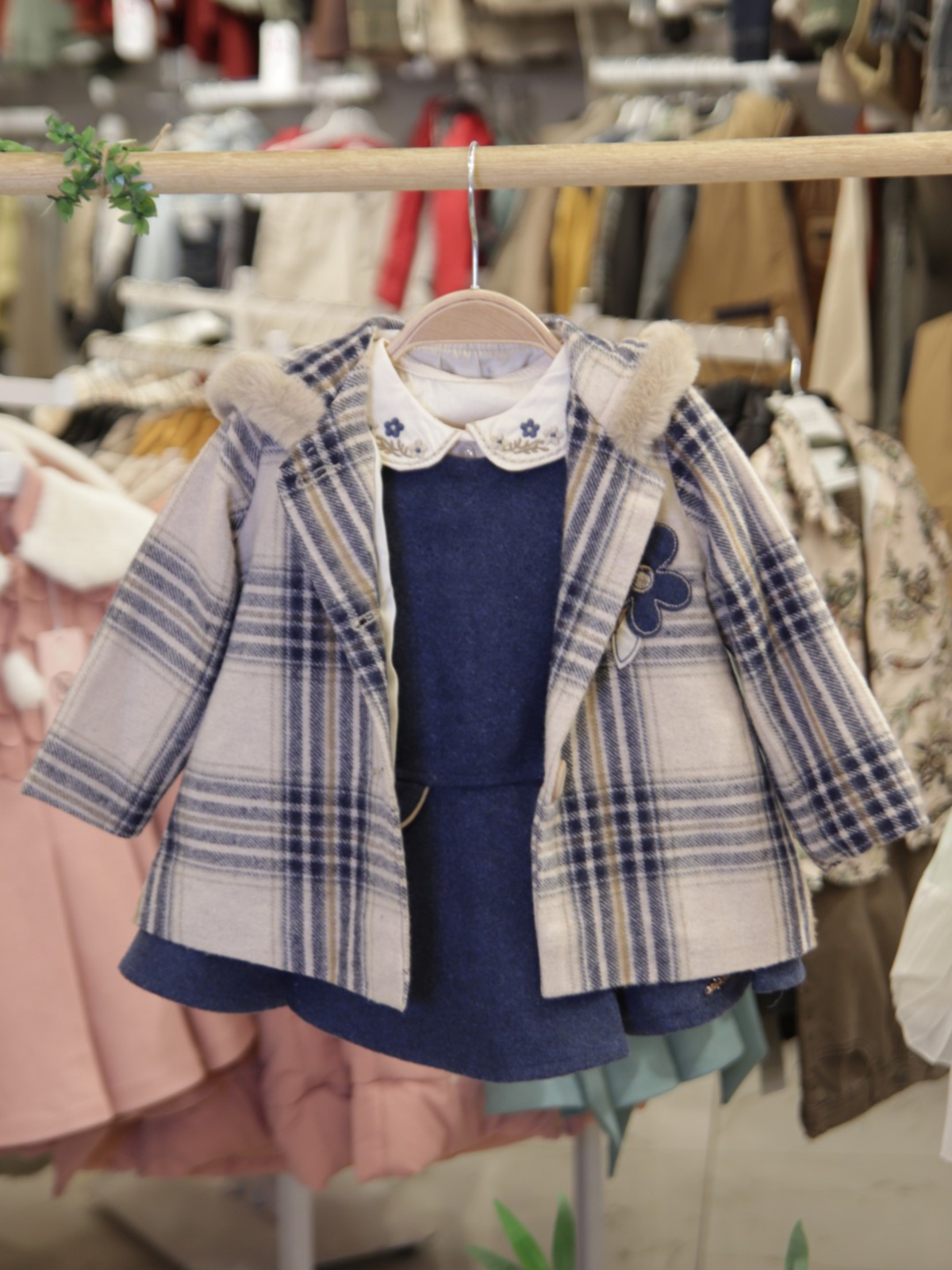 Bu şık kız çocuk elbisesi, soğuk kış günlerinde sıcak ve rahat bir seçim sunar. Lacivert tonlarında, uzun kollu, fırfırlı manşetli ve işlemeli yakalı elbisenin üzerine giyilen bej ve lacivert ekoseli, kapüşonlu, düğmeli dış giyim parçası, hem koruyucu hem de şık bir görünüm sağlar. Kürklü kapüşon detayı, soğuk havalarda ekstra sıcaklık sunarken, elbisenin etek kısmındaki geniş ve hareketli formu çocukların rahatça hareket etmesine olanak verir.