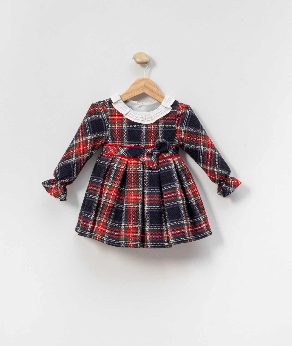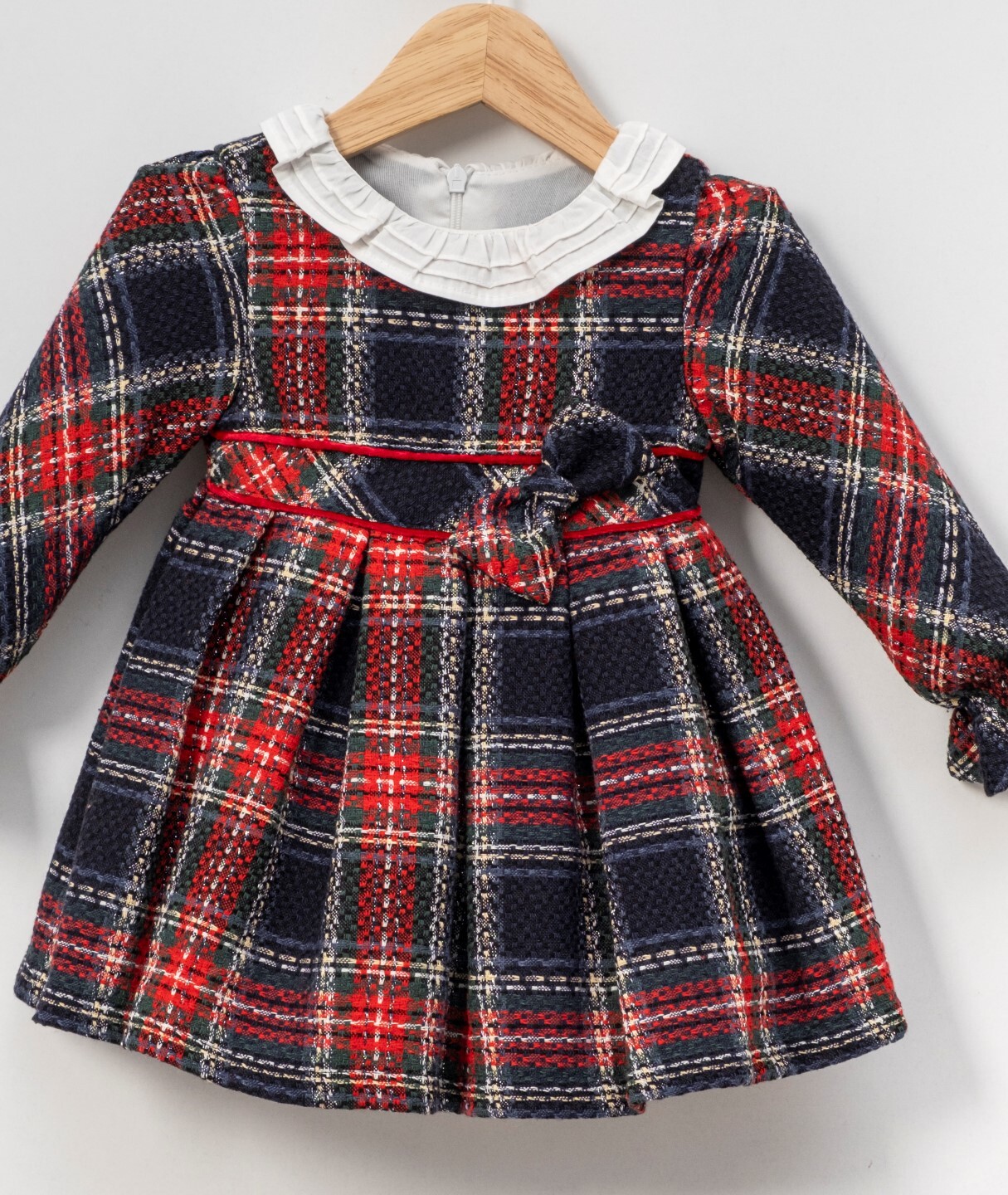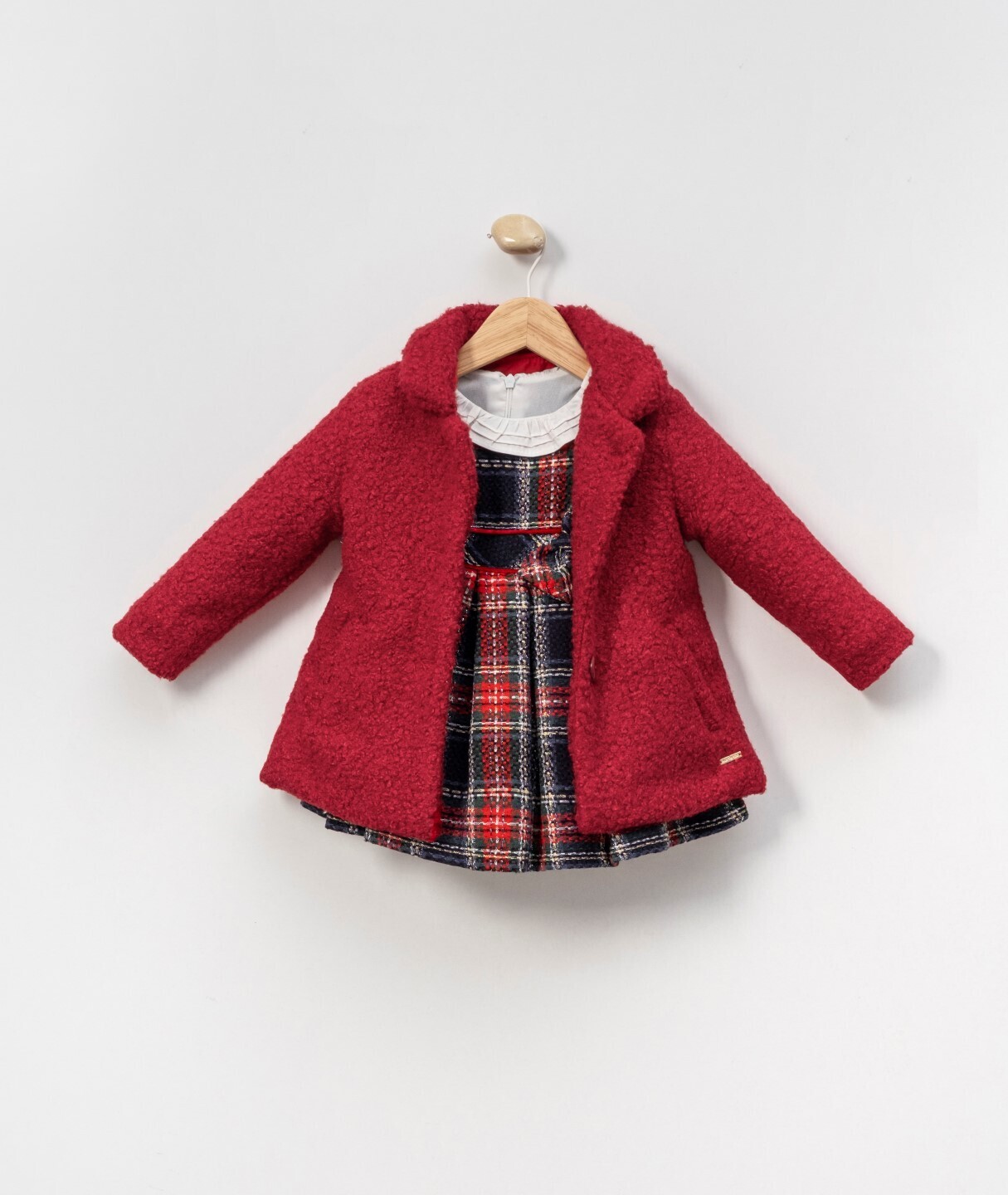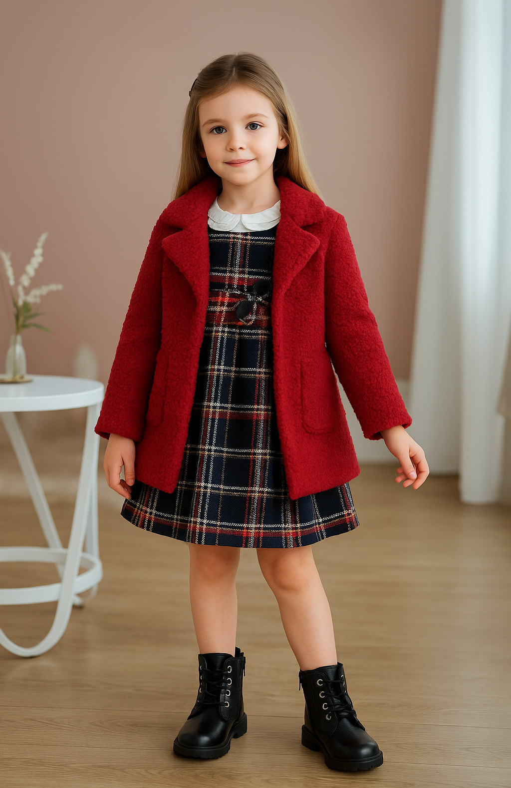 Bu şık kız çocuk kışlık elbise seti, sıcak tutan kırmızı kaban ve uyumlu kareli desenli elbiseden oluşur. Kaban, yumuşak ve kabarık dokusuyla dikkat çeker, klasik yaka ve uzun kolludur. Fermuarlı kapanışı ve cepleriyle pratik kullanım sağlar. Elbise ise bisiklet yaka ve uzun kollu olup, bel kısmındaki küçük fiyonk detayı ve pileli etek kısmıyla zarif bir görünüm sunar. Kış mevsimi için ideal olan bu kombin, hem rahat hem de şık bir tercih olacaktır.