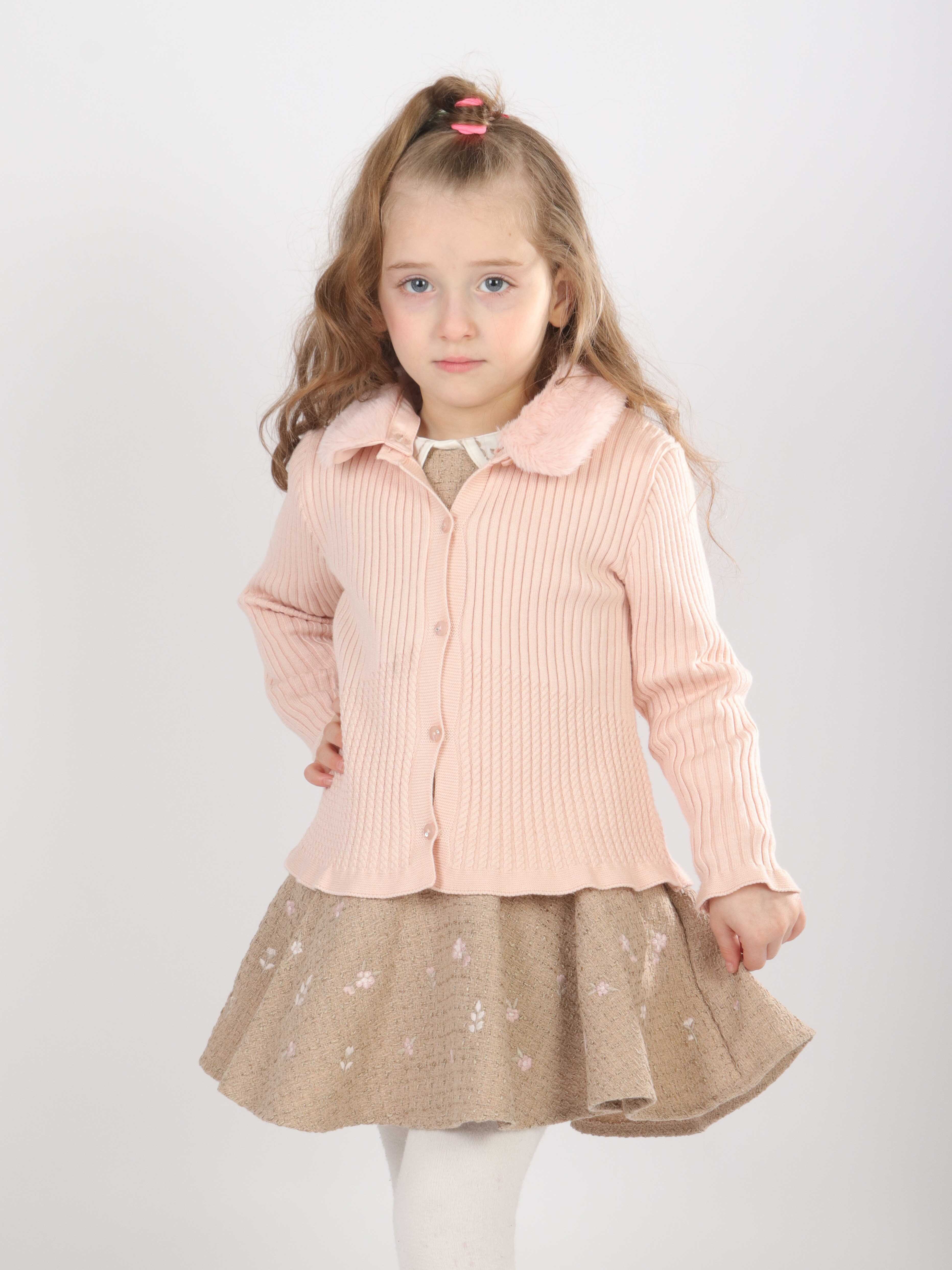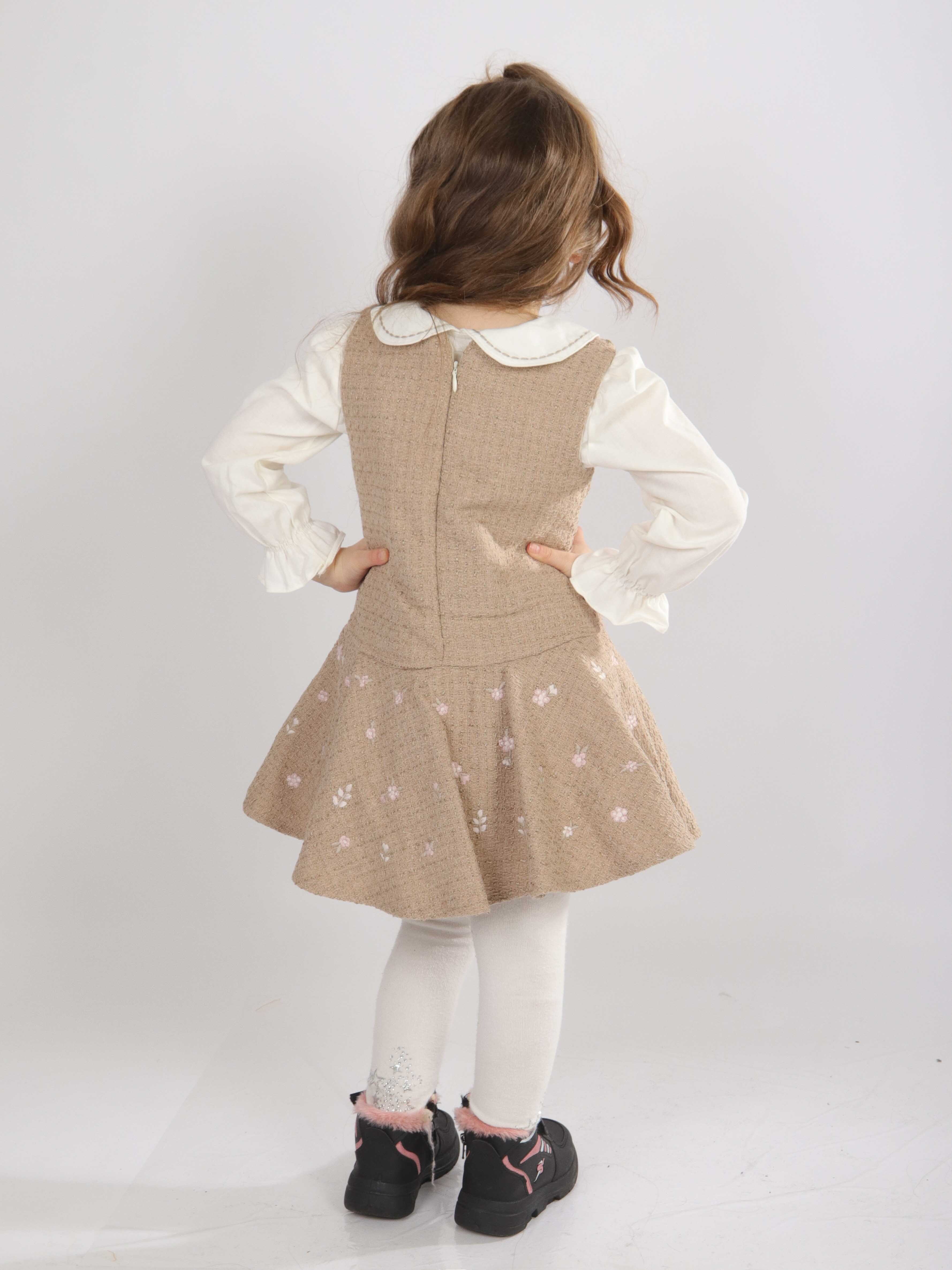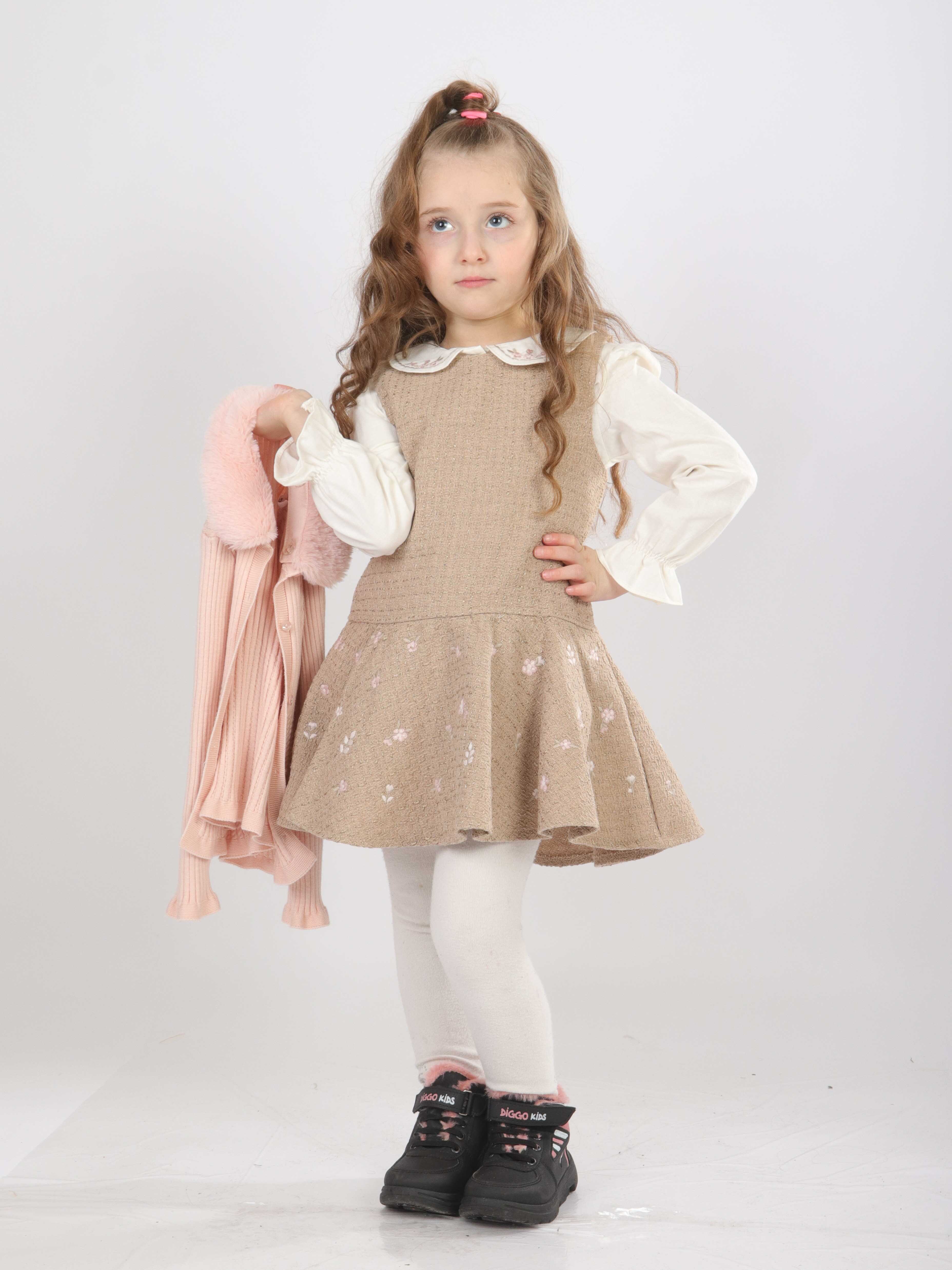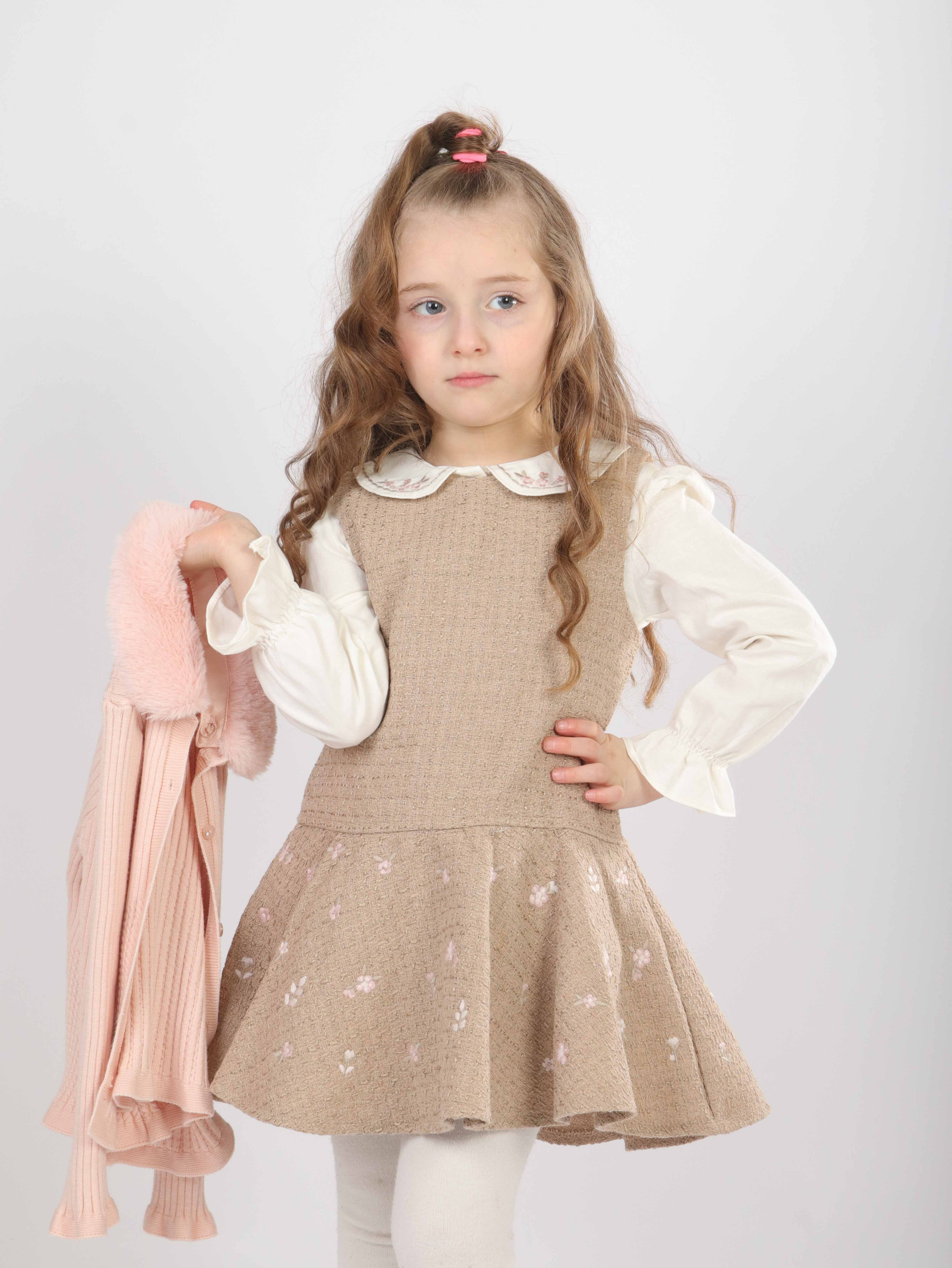 Bu kız çocuk elbisesi, bahar mevsimi için ideal yumuşak dokulu ve rahat bir tasarıma sahiptir. Elbise, uzun kollu ve beyaz renkli bluz ile birleşik görünürken, bej tonlarında, çiçek desenli, hafif kabarık ve midi boy etek kısmı ile şık bir görünüm sunar. Üzerine giyilen pembe, düğmeli hırka ise tüy detaylı yakası ve fitilli dokusuyla sıcak ve sevimli bir katman oluşturur. Kombin, beyaz tayt ve siyah-pembe detaylı botlarla tamamlanmıştır.
