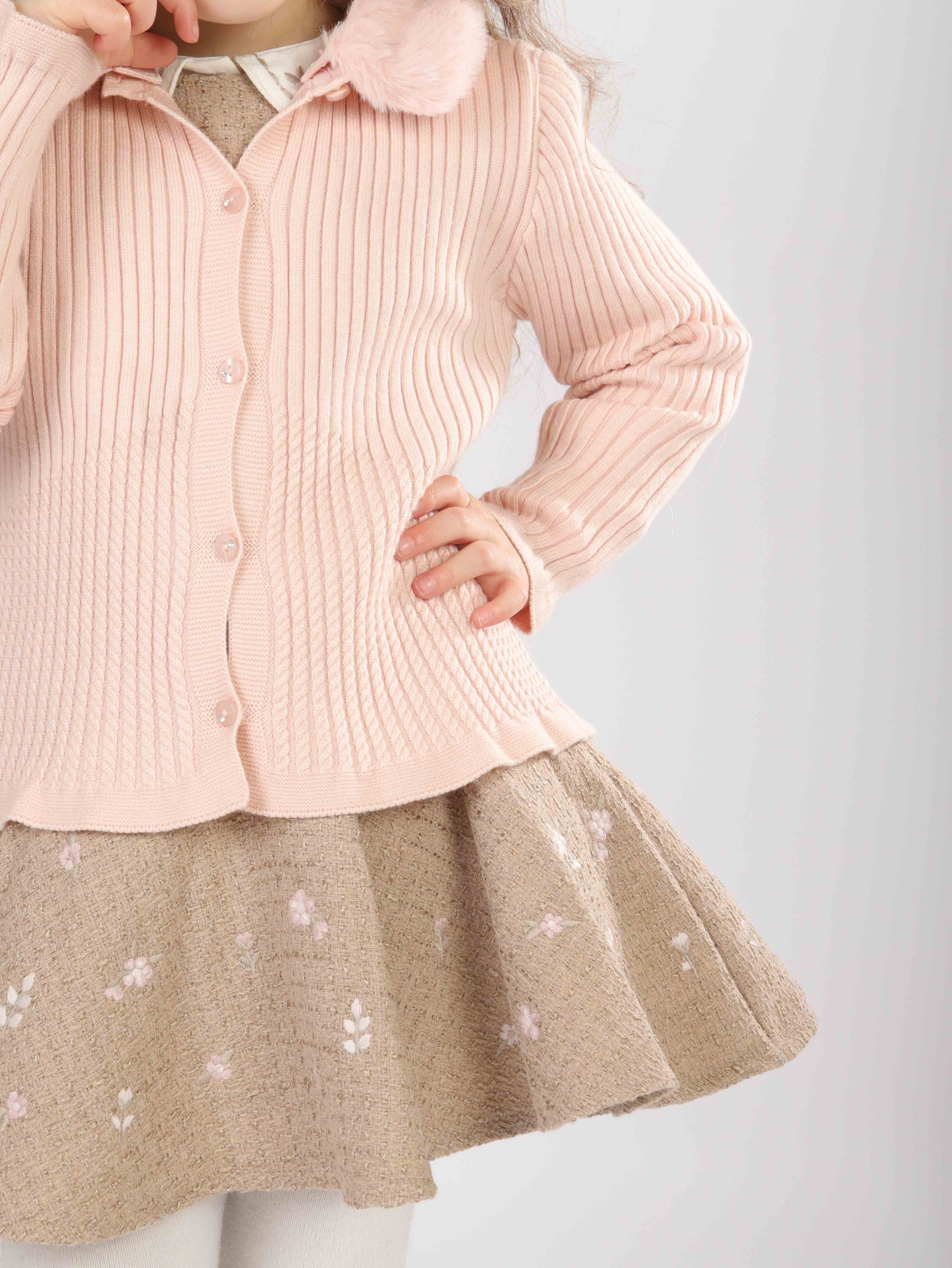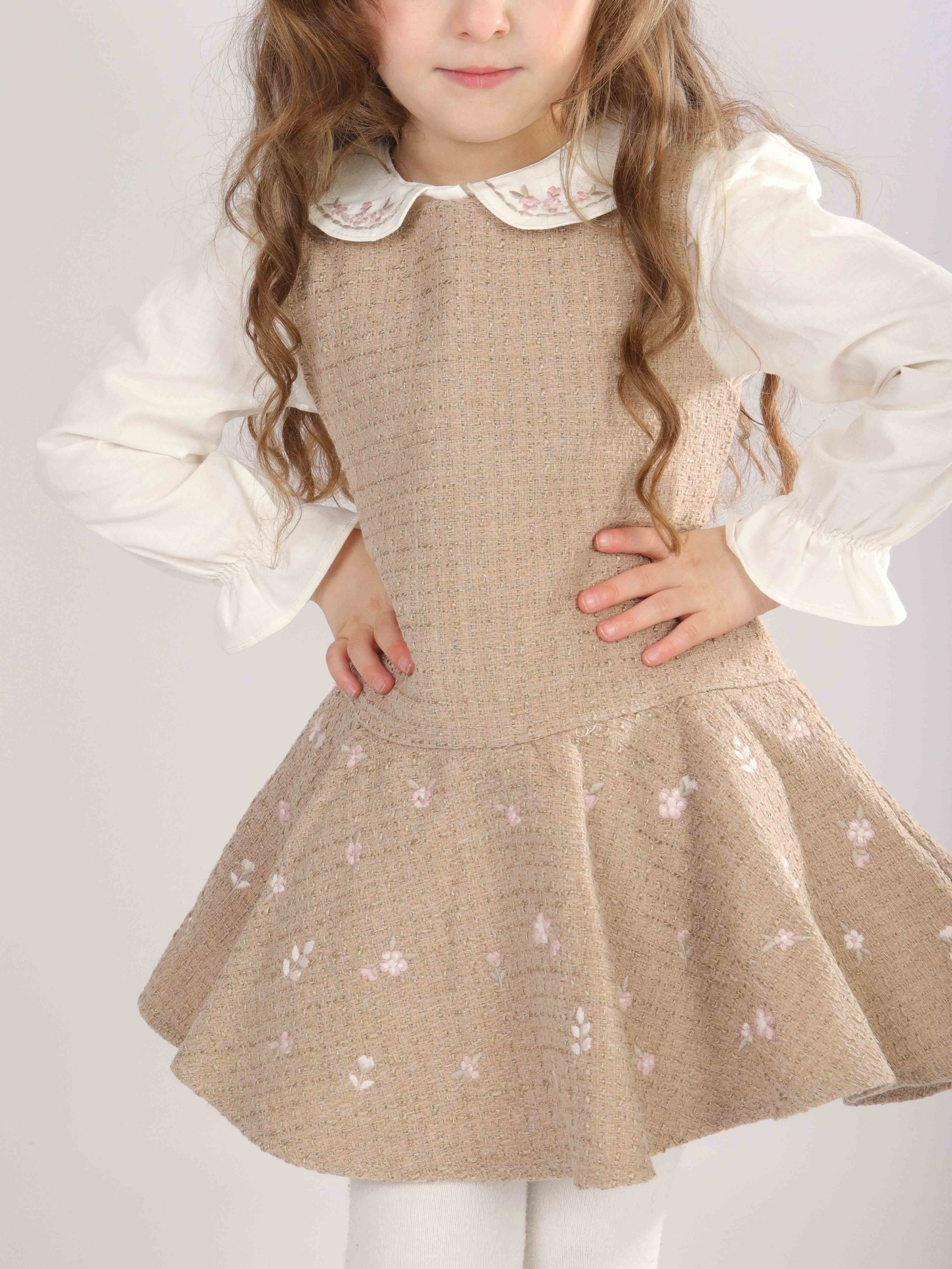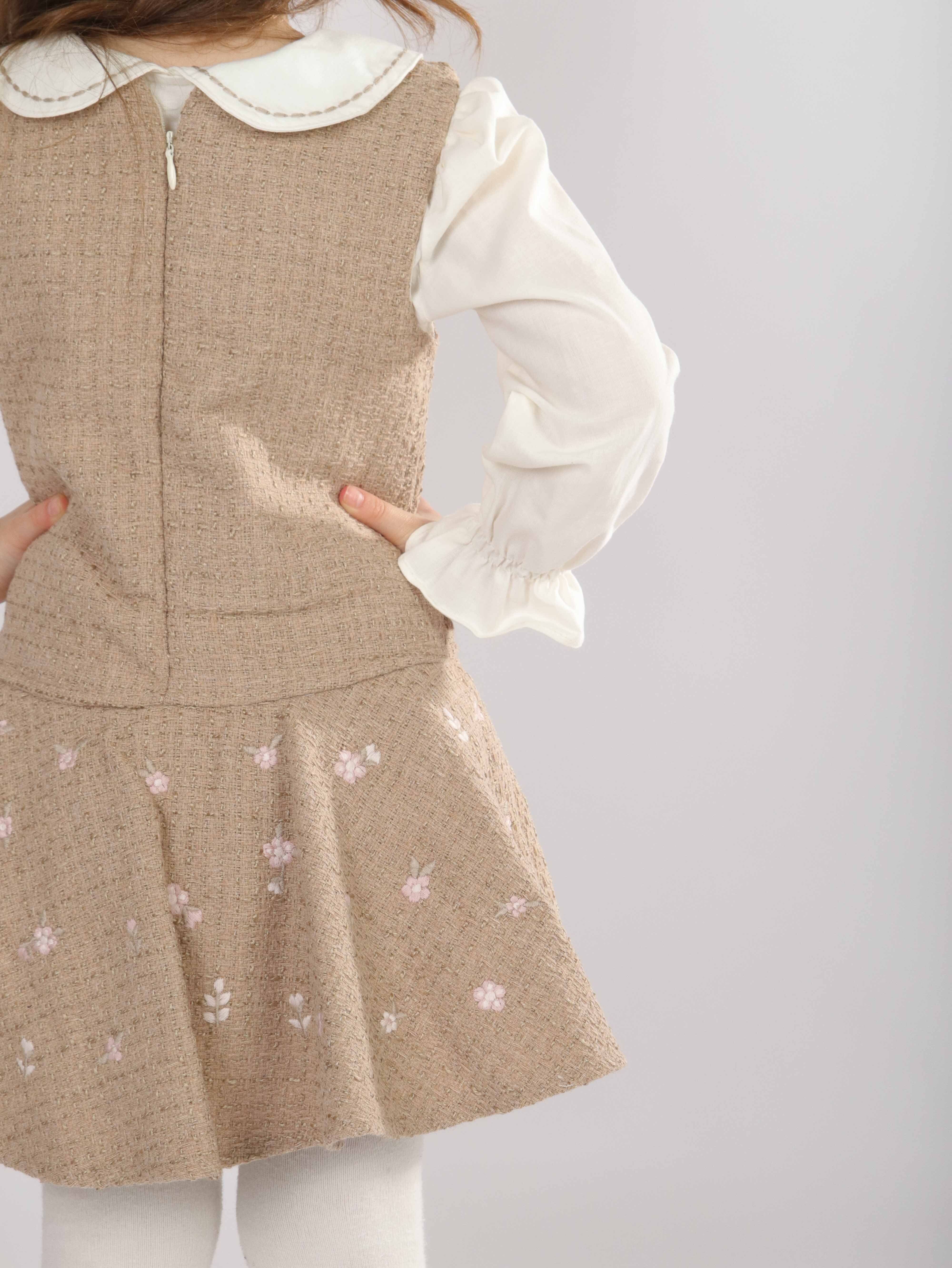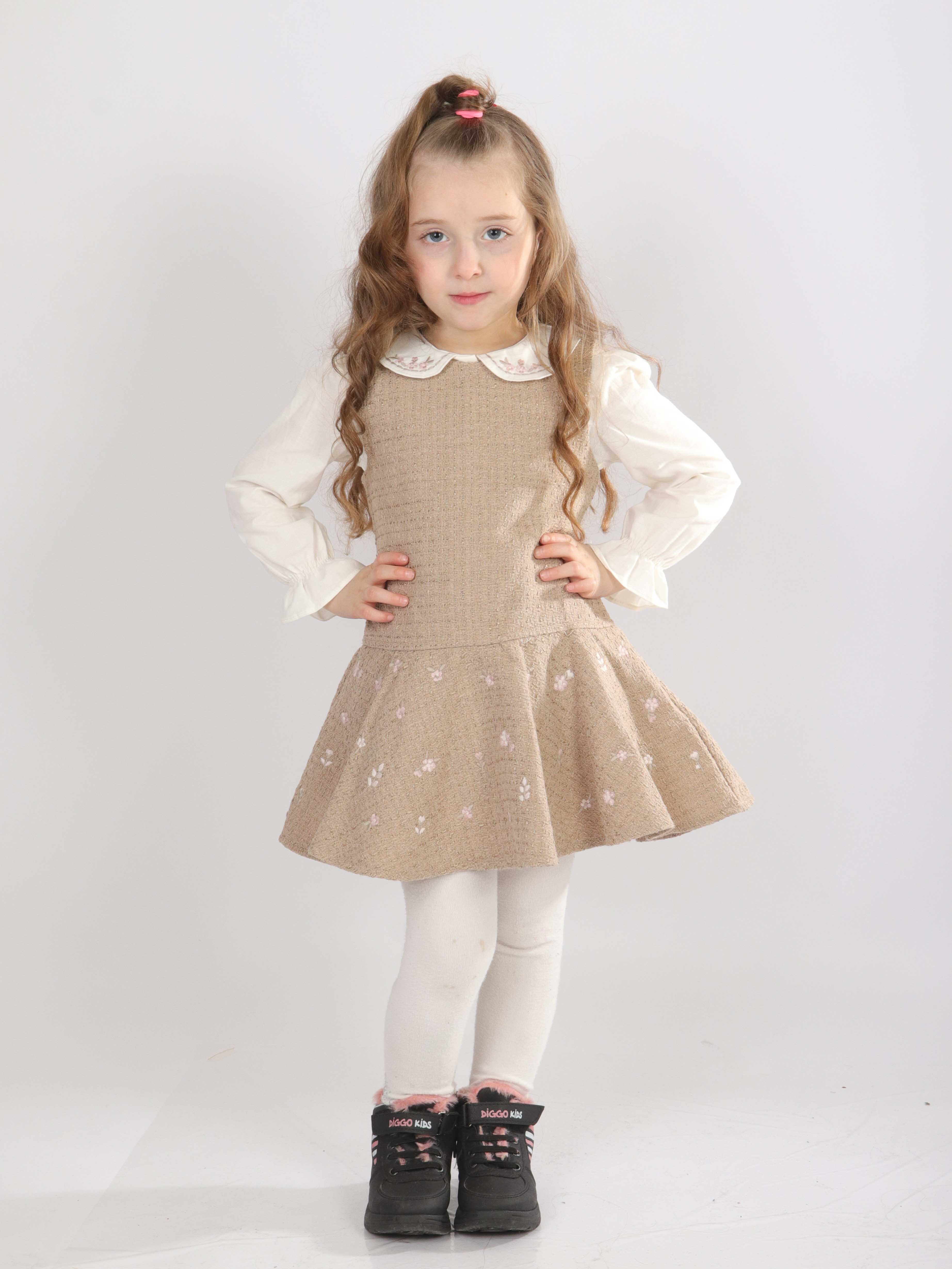 Bu kız çocuk elbisesi, bahar mevsimi için ideal yumuşak dokulu ve rahat bir tasarıma sahiptir. Elbise, uzun kollu ve beyaz renkli bluz ile birleşik görünürken, bej tonlarında, çiçek desenli, hafif kabarık ve midi boy etek kısmı ile şık bir görünüm sunar. Üzerine giyilen pembe, düğmeli hırka ise tüy detaylı yakası ve fitilli dokusuyla sıcak ve sevimli bir katman oluşturur. Kombin, beyaz tayt ve siyah-pembe detaylı botlarla tamamlanmıştır.