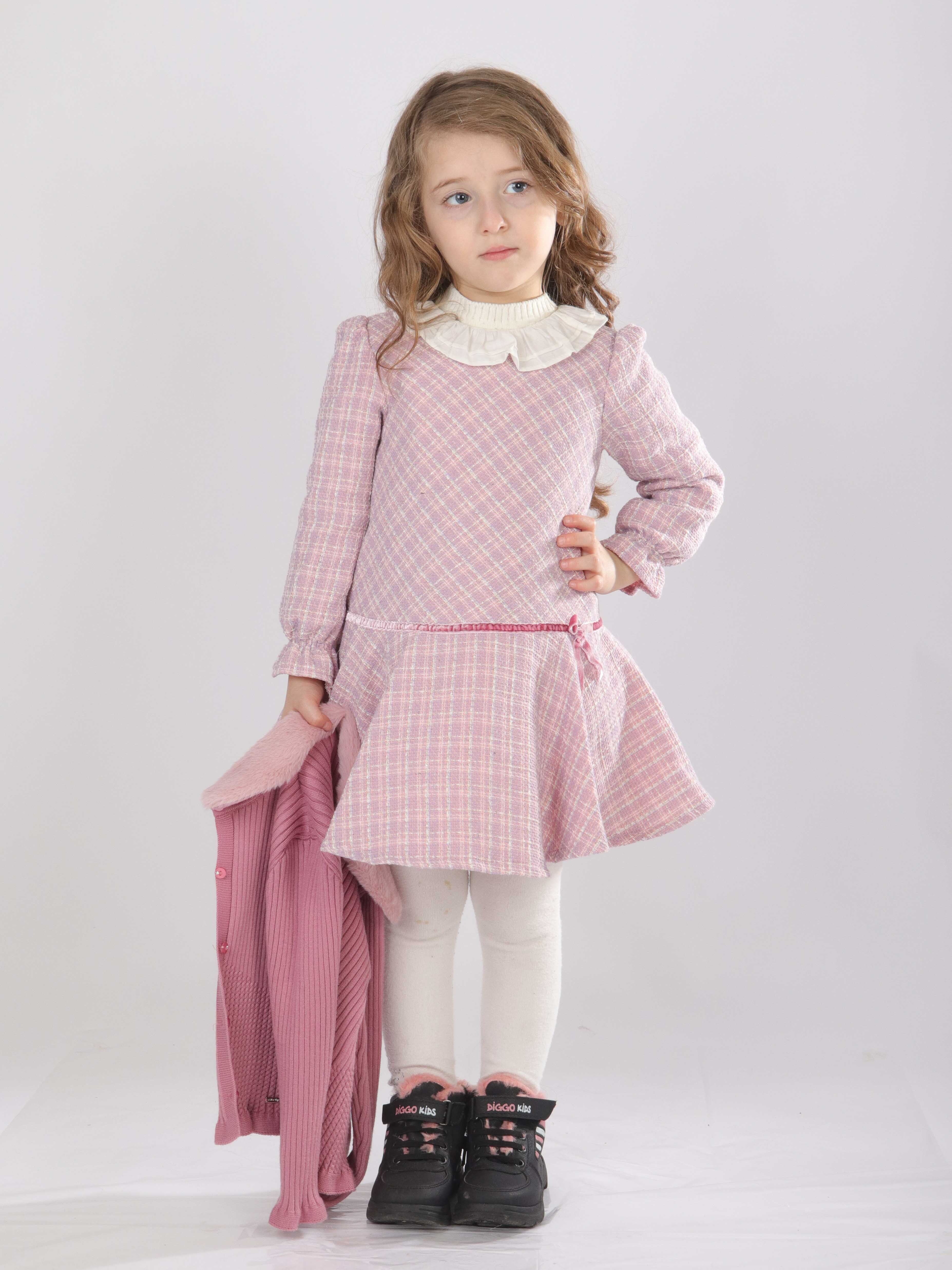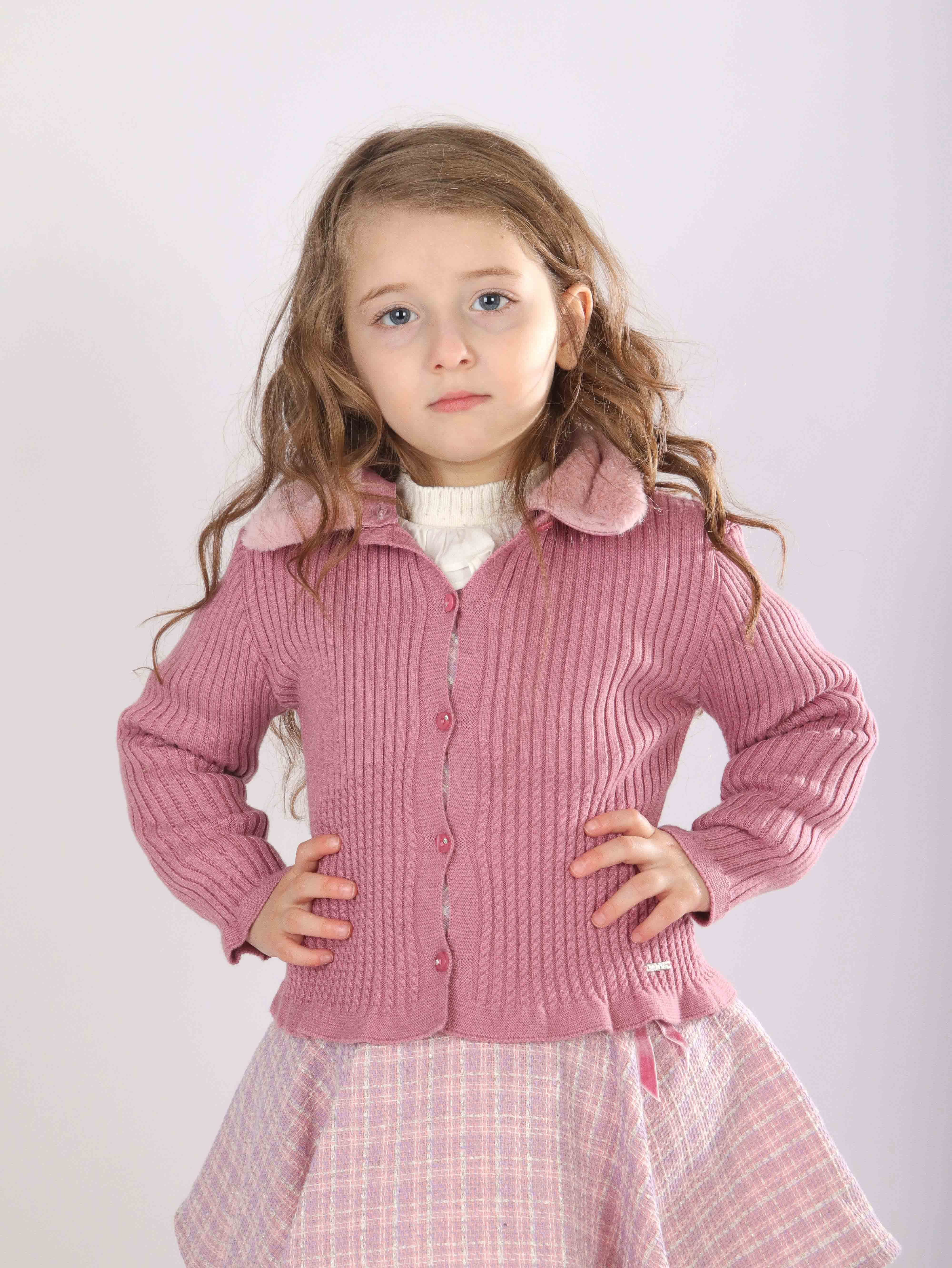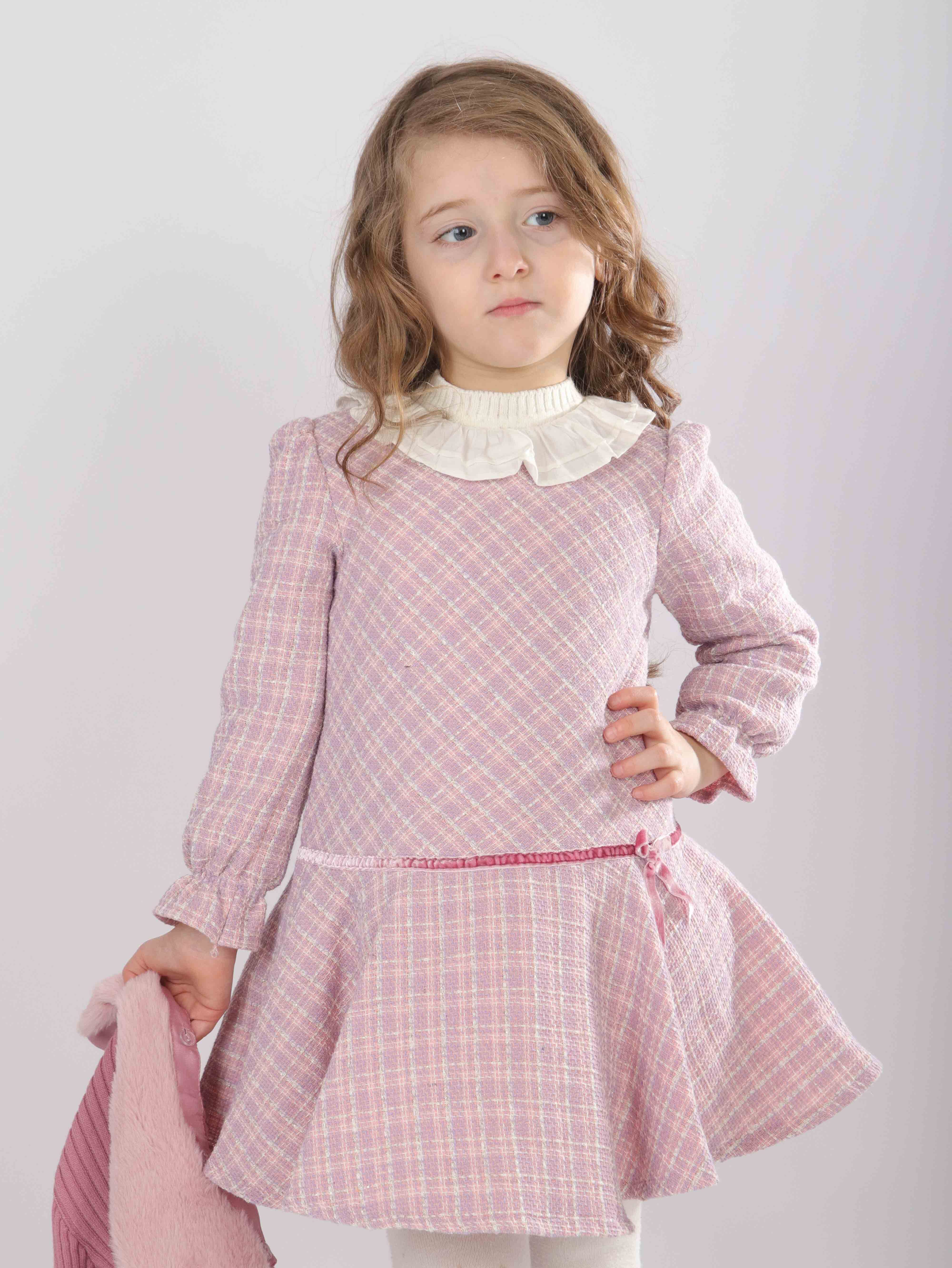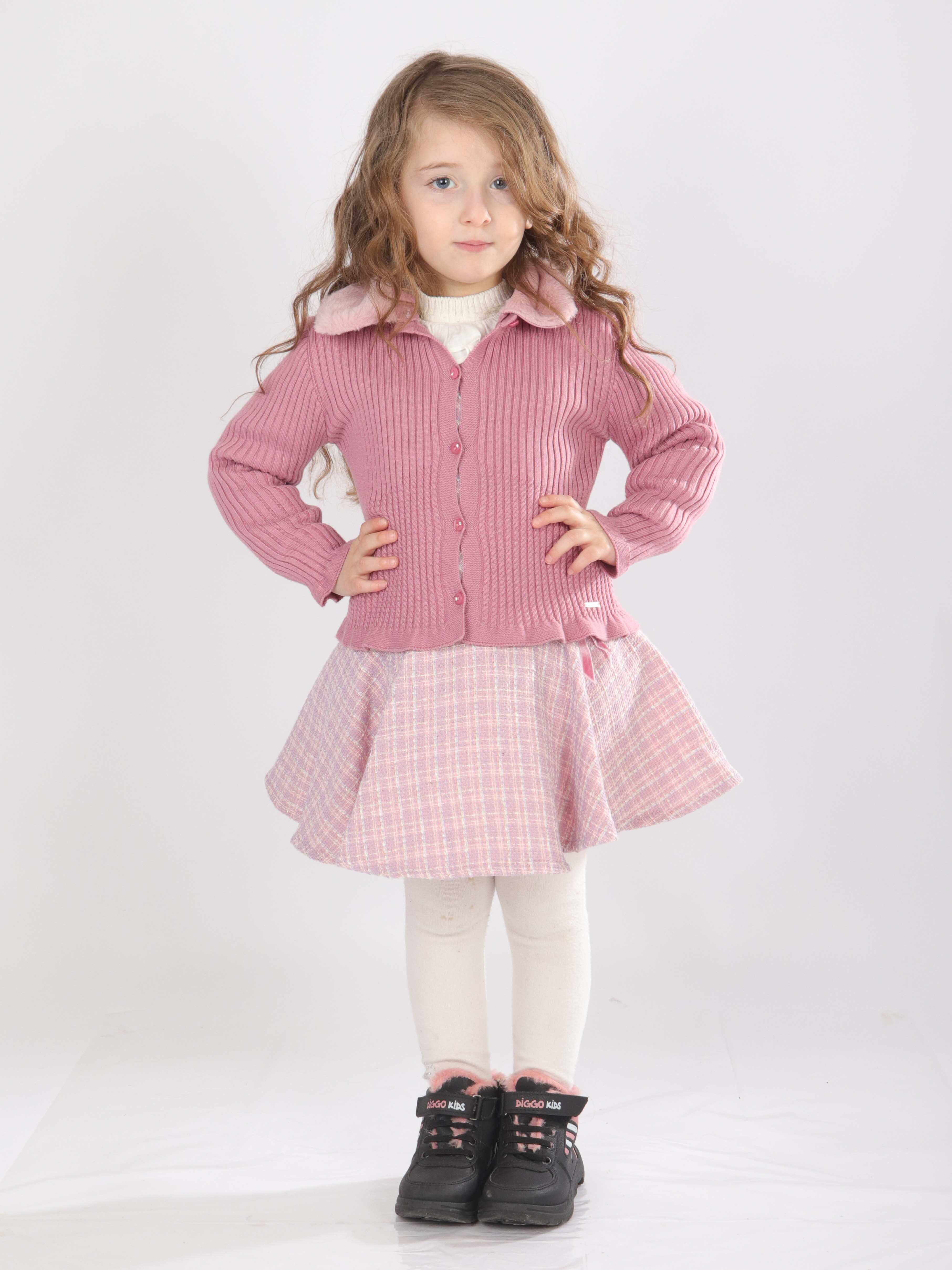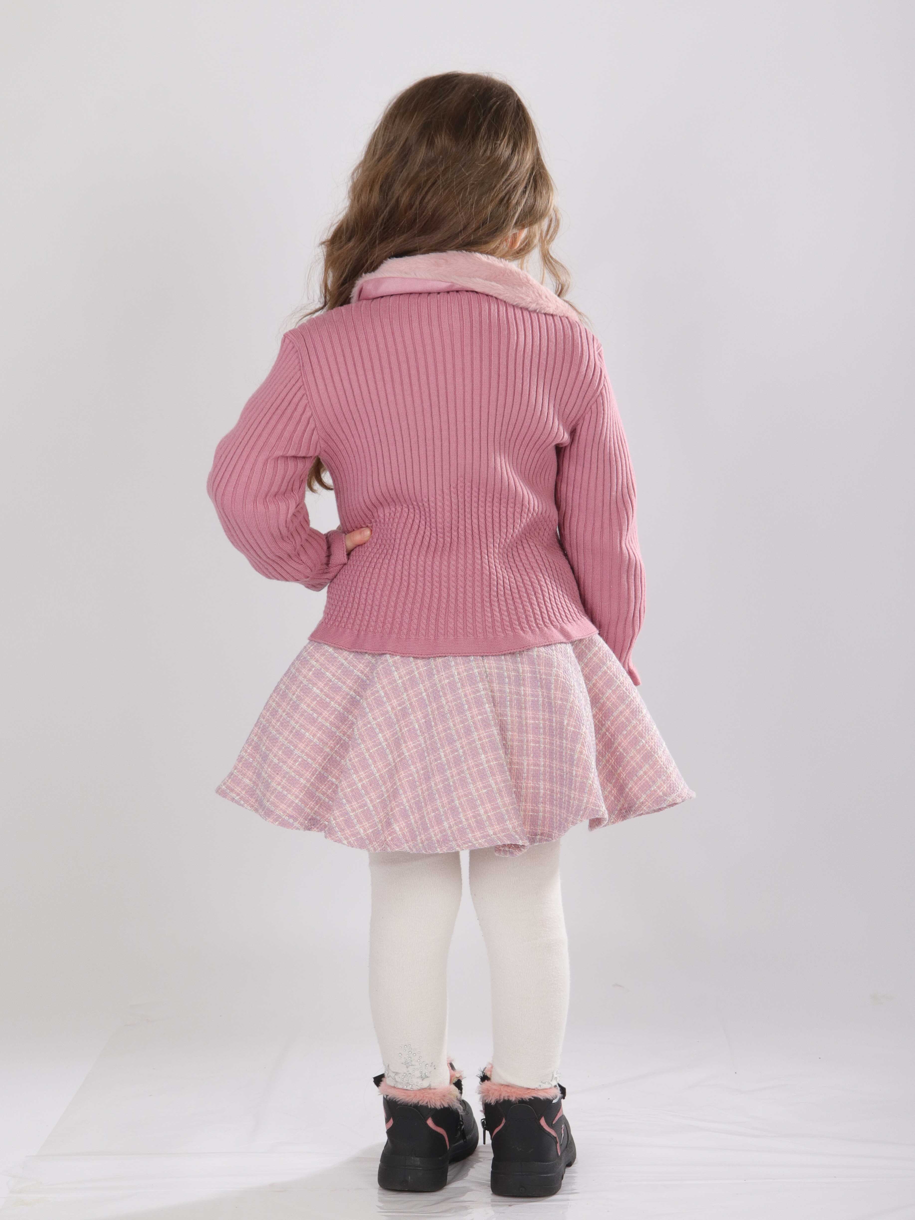 Bu kız çocuk elbisesi, bahar mevsimi için ideal şık ve rahat bir tasarıma sahiptir. Elbisenin kendisi uzun kollu ve bisiklet yaka detaylıdır. Alt kısmı hafifçe kabarık ve midi boyda, yumuşak ve dokulu kumaştan yapılmıştır. Üzerine giyilen hırka ise gül kurusu renkte, düğmeli, uzun kollu ve kapüşonsuzdur. Hırkanın yakası peluş detaylı olup sıcaklık ve rahatlık sağlar. Bütün kombinasyon, günlük kullanım için hem zarif hem de konforlu bir stil sunar.