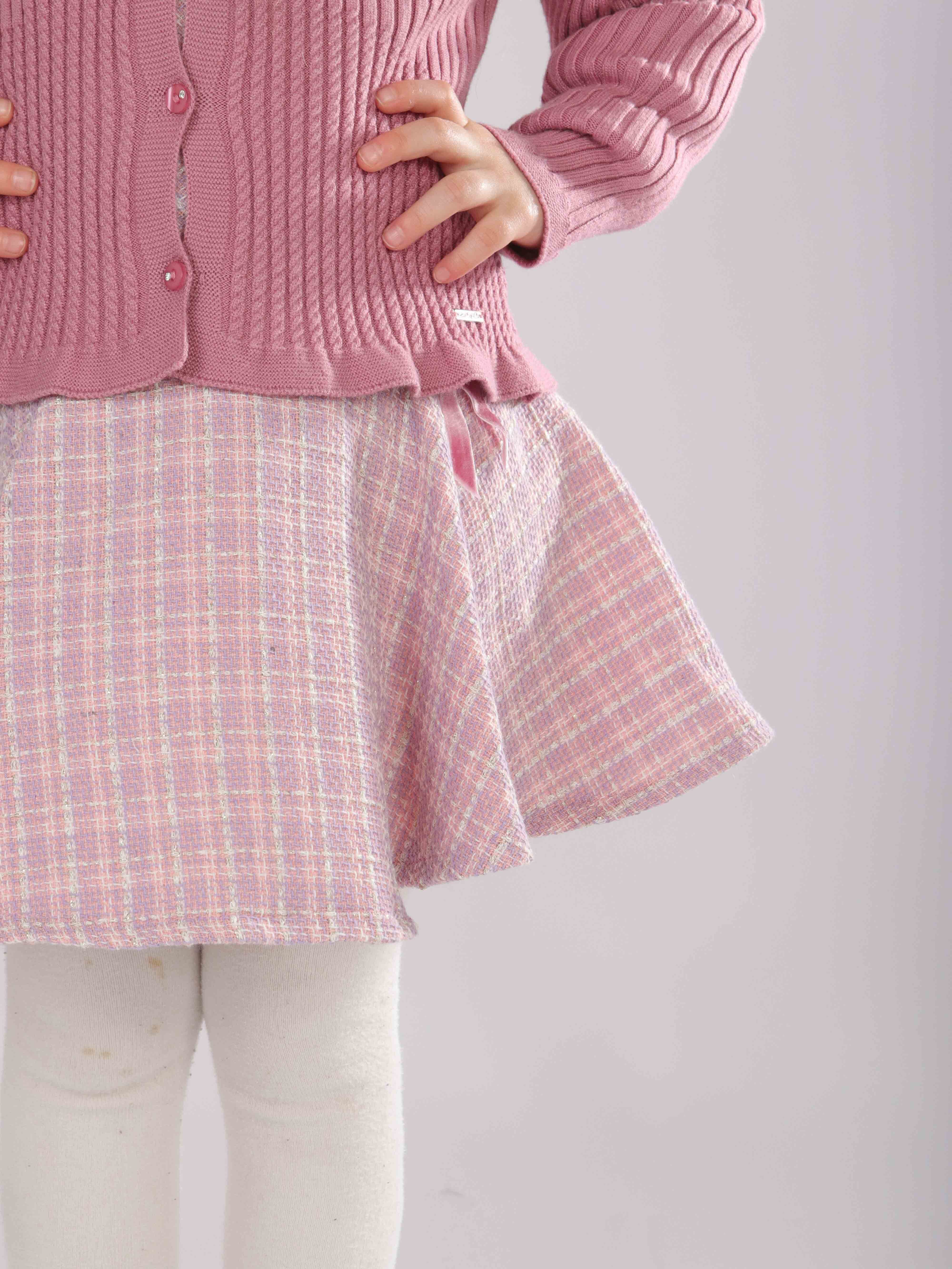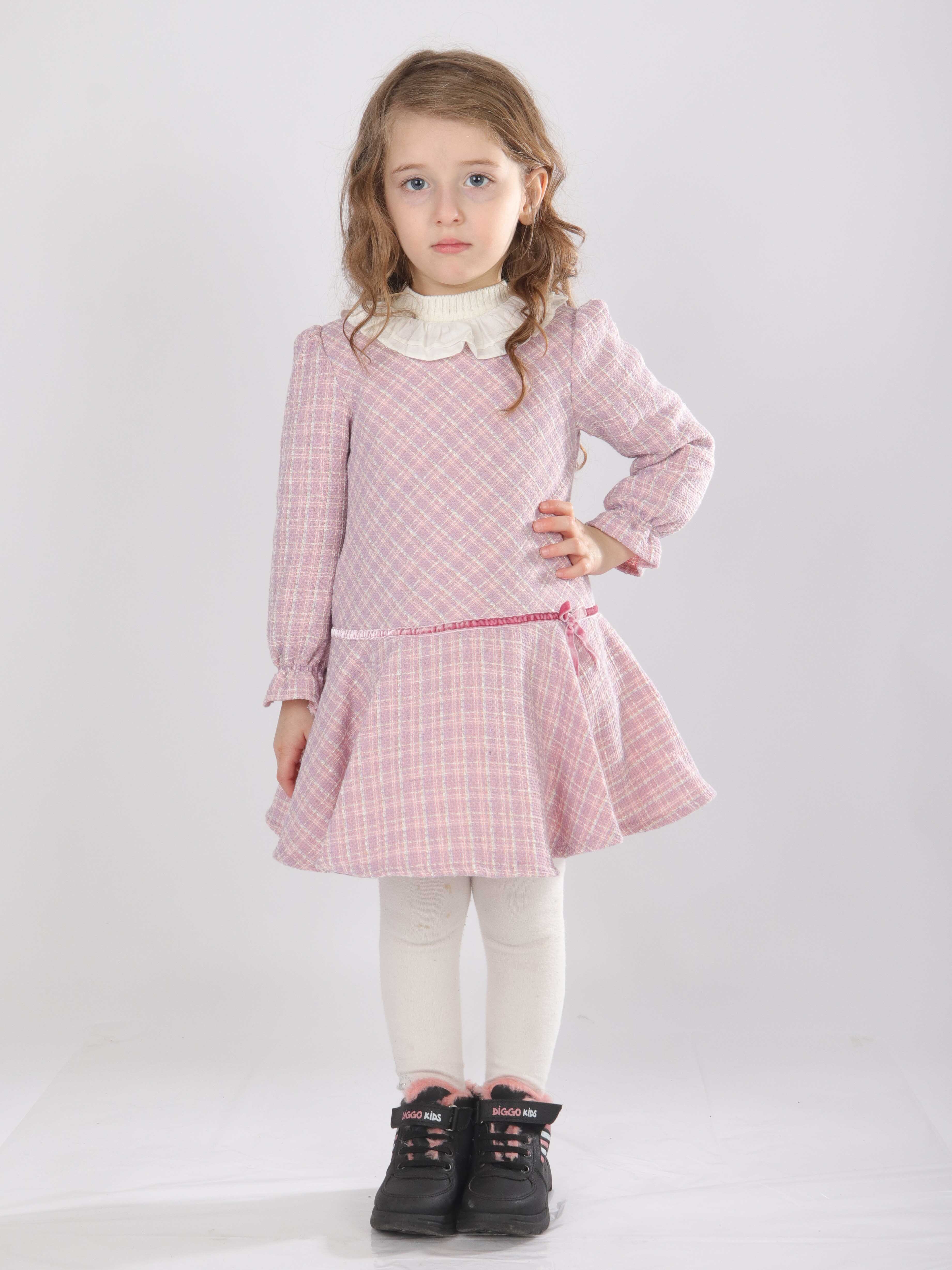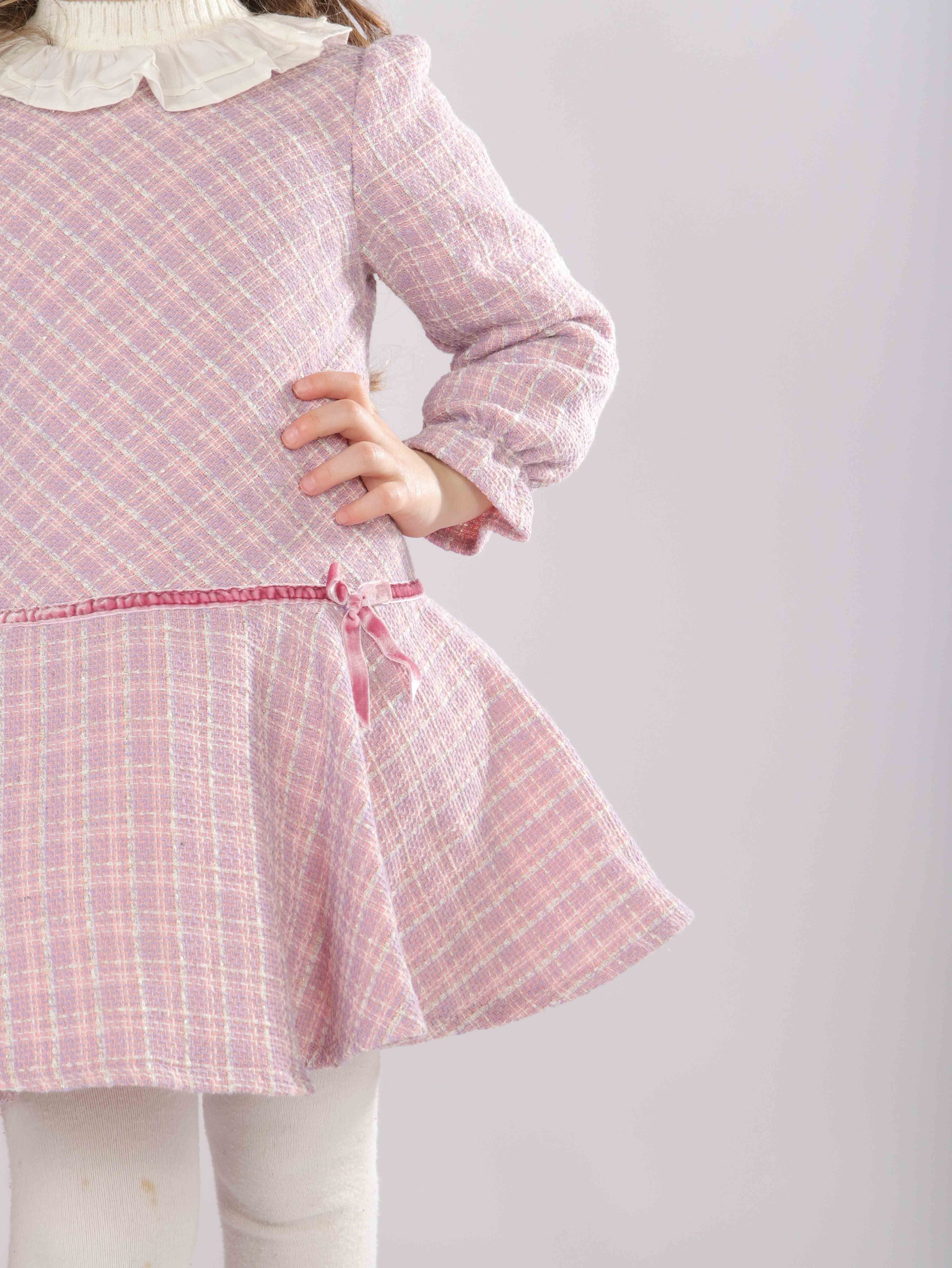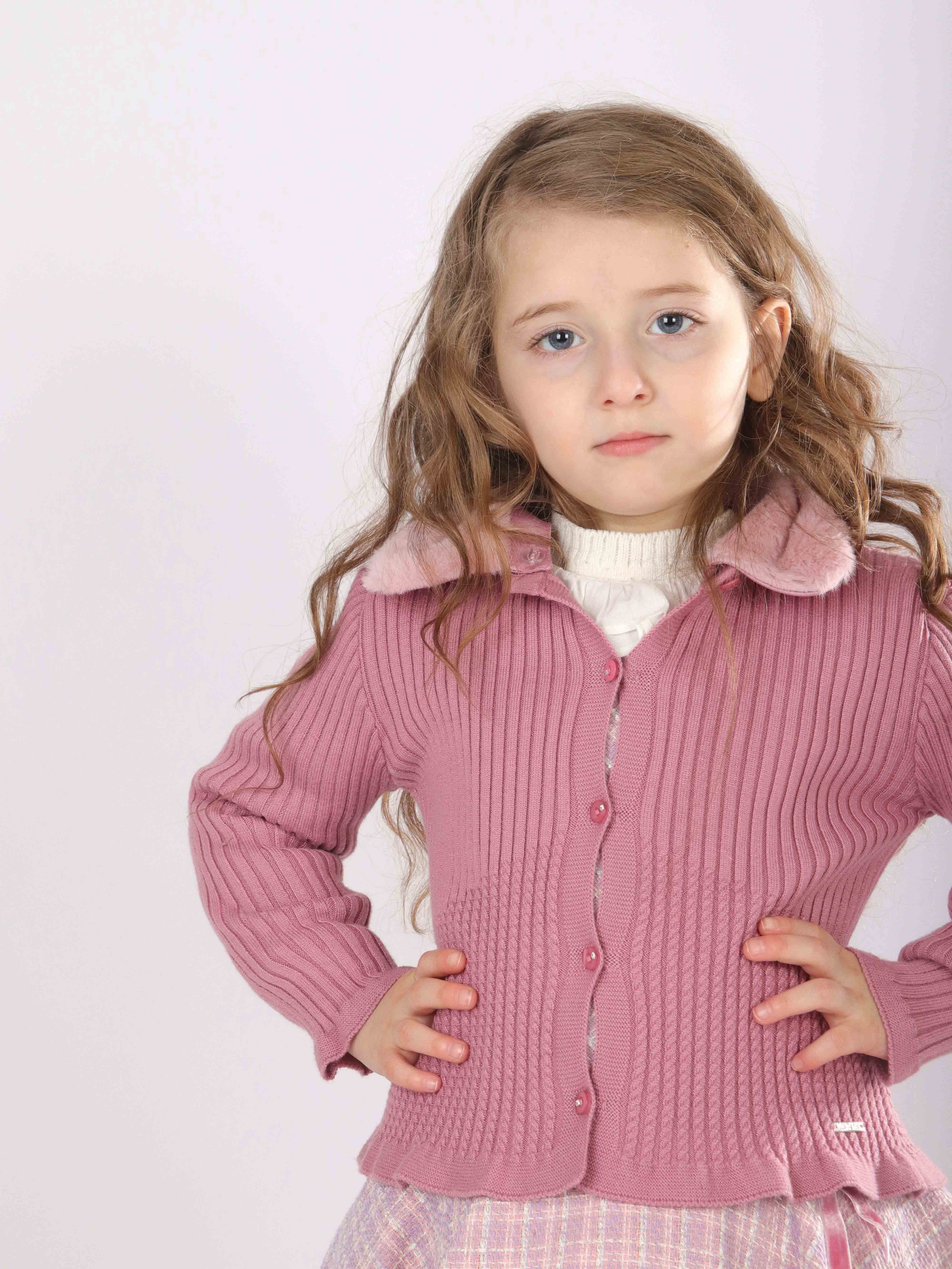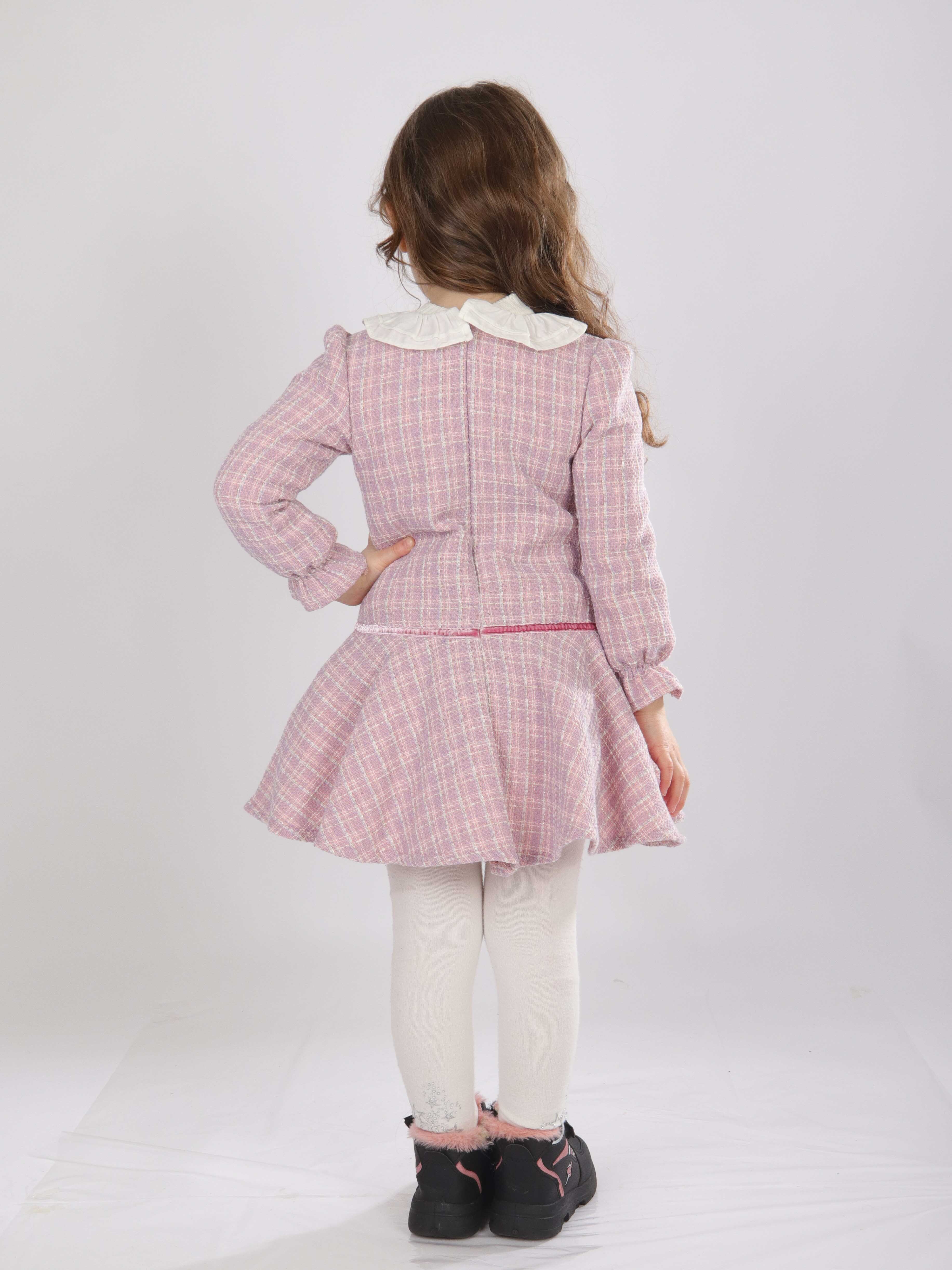 Bu kız çocuk elbisesi, bahar mevsimi için ideal şık ve rahat bir tasarıma sahiptir. Elbisenin kendisi uzun kollu ve bisiklet yaka detaylıdır. Alt kısmı hafifçe kabarık ve midi boyda, yumuşak ve dokulu kumaştan yapılmıştır. Üzerine giyilen hırka ise gül kurusu renkte, düğmeli, uzun kollu ve kapüşonsuzdur. Hırkanın yakası peluş detaylı olup sıcaklık ve rahatlık sağlar. Bütün kombinasyon, günlük kullanım için hem zarif hem de konforlu bir stil sunar.
