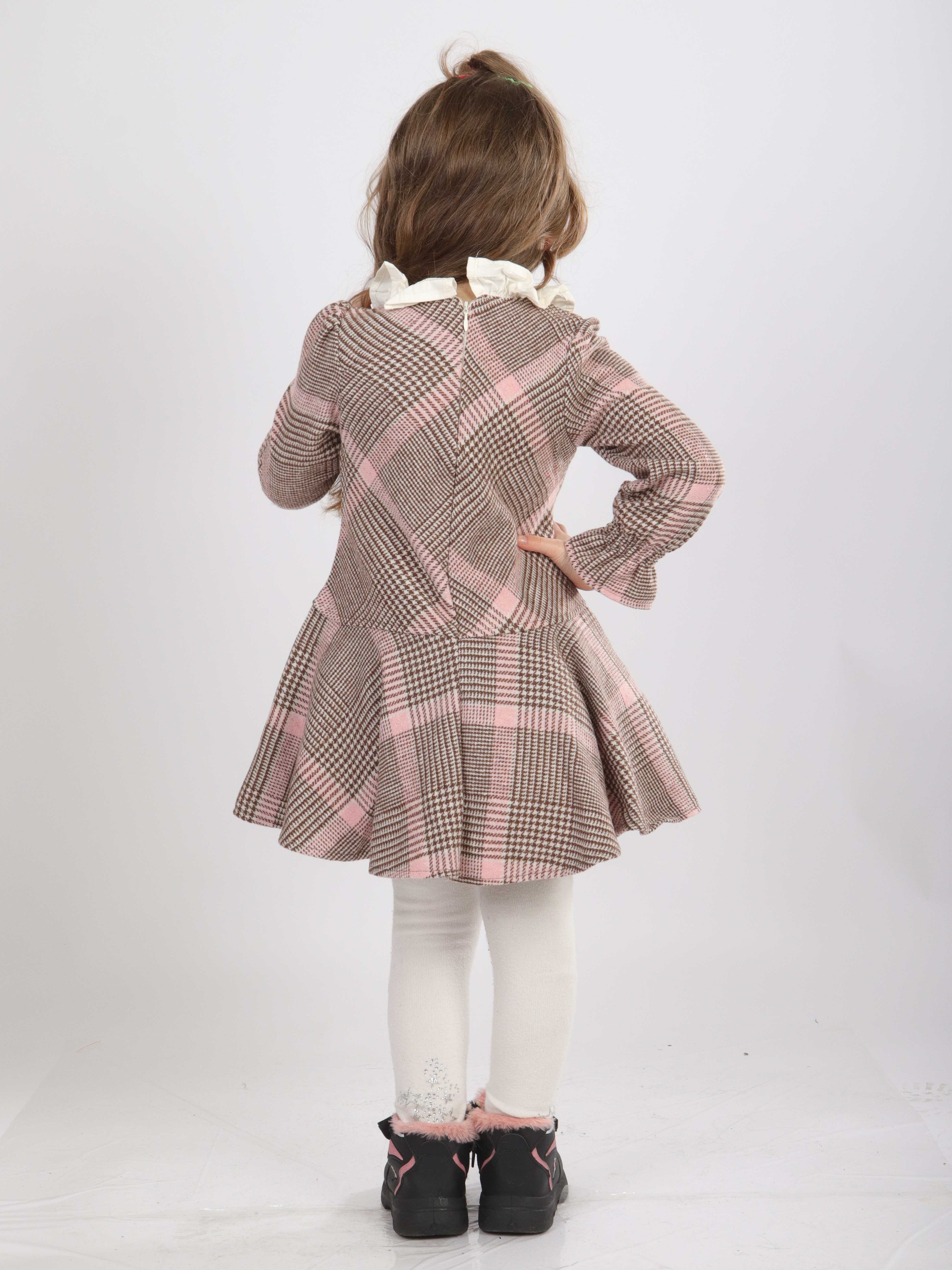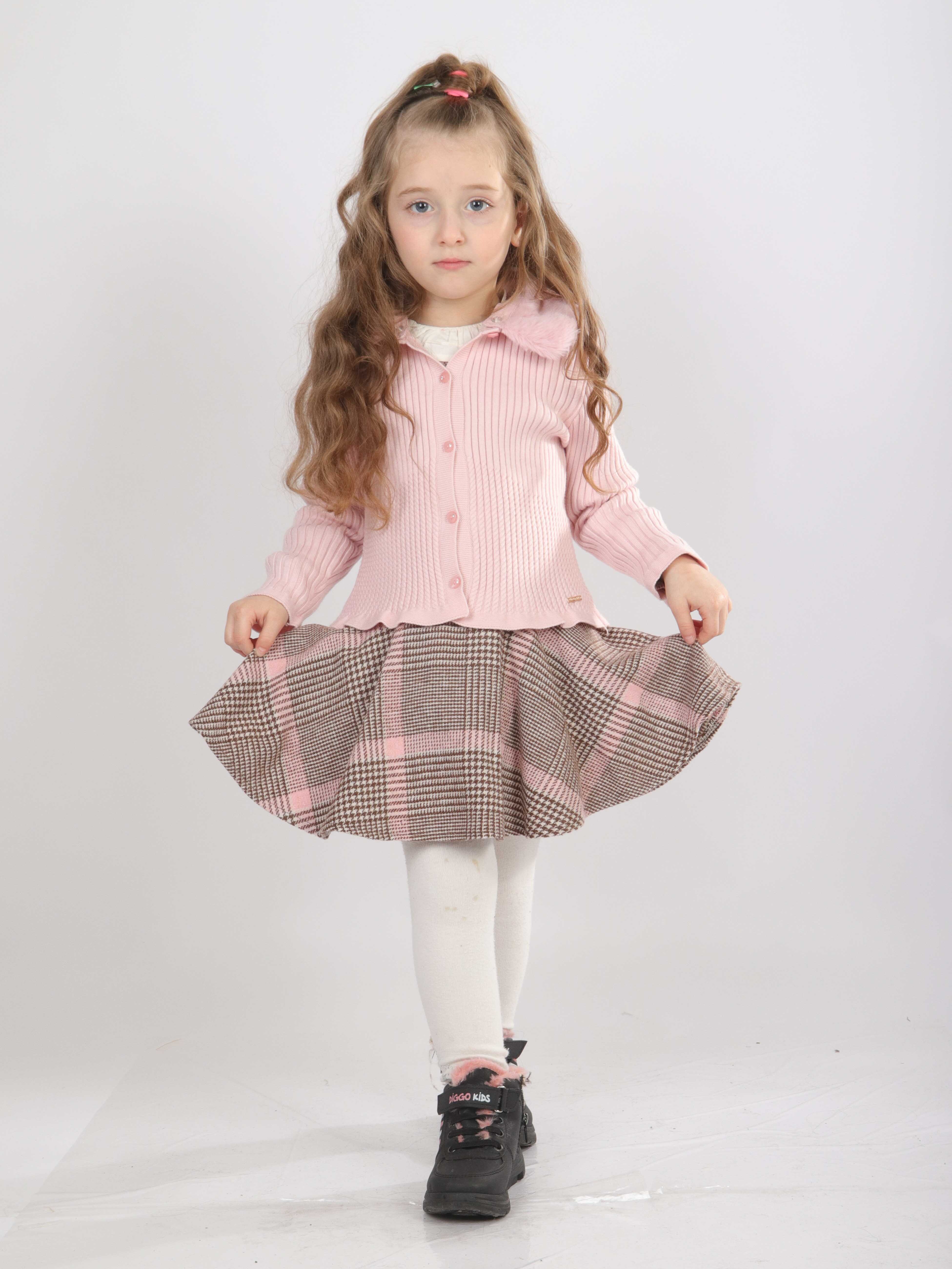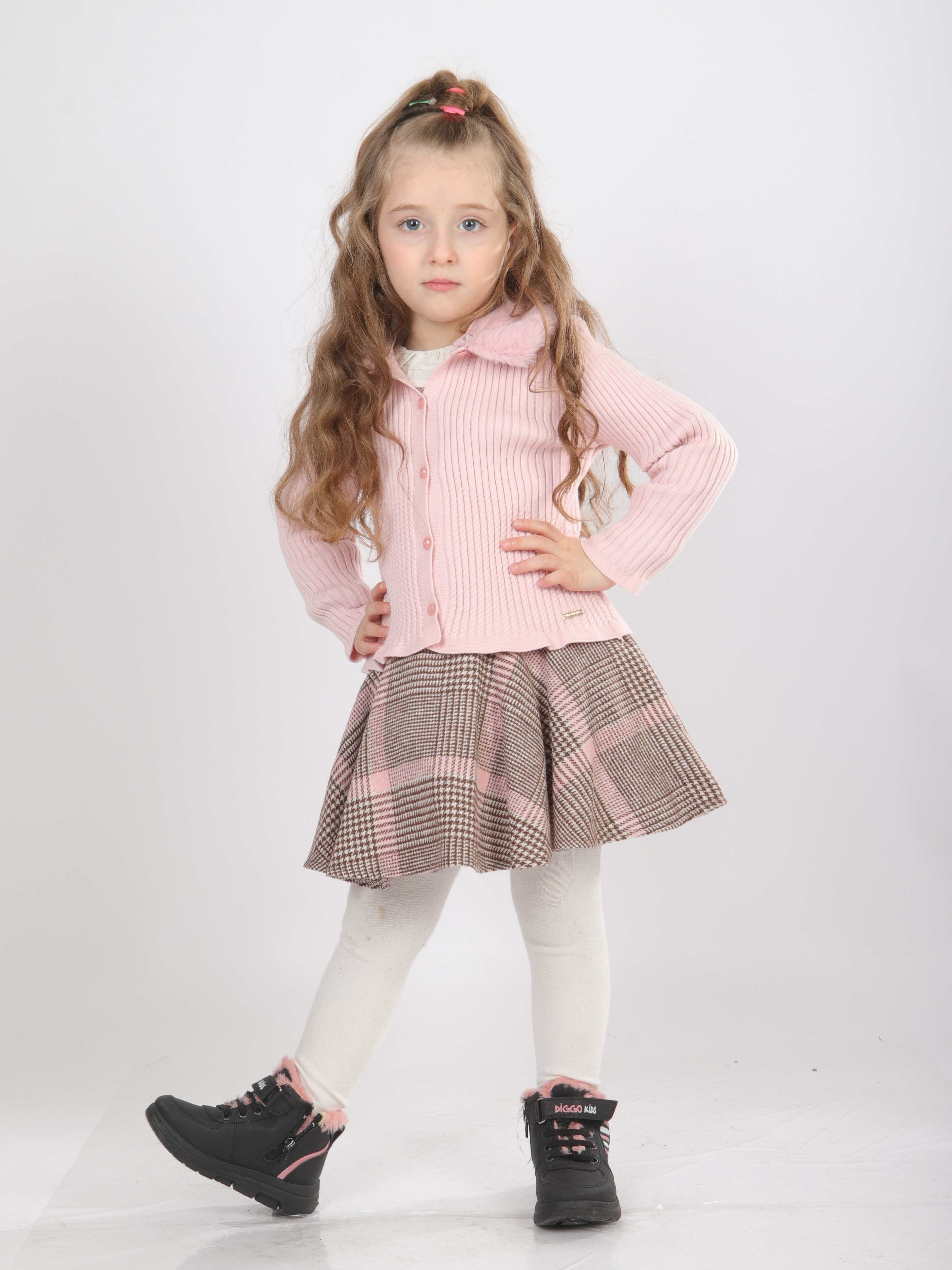 Bu şık kız çocuk kıyafeti, bahar ayları için mükemmel bir seçimdir. Takım, pembe tonlarında iki parçadan oluşmaktadır. Üst kısmı, düğmeli ve uzun kollu, kapüşonsuz, yakası ise tüylü detaylı klasik yaka olarak tasarlanmıştır. Alt parça ise, kahverengi ve pembe tonlarda büyük kare desenli, kısa ve hafif volanlı bir etek modelidir. Kombin, rahat ve sıcak tutan beyaz tayt ile tamamlanmıştır. Günlük kullanıma uygun, hem şık hem rahat bir dış görünüm sunar.
