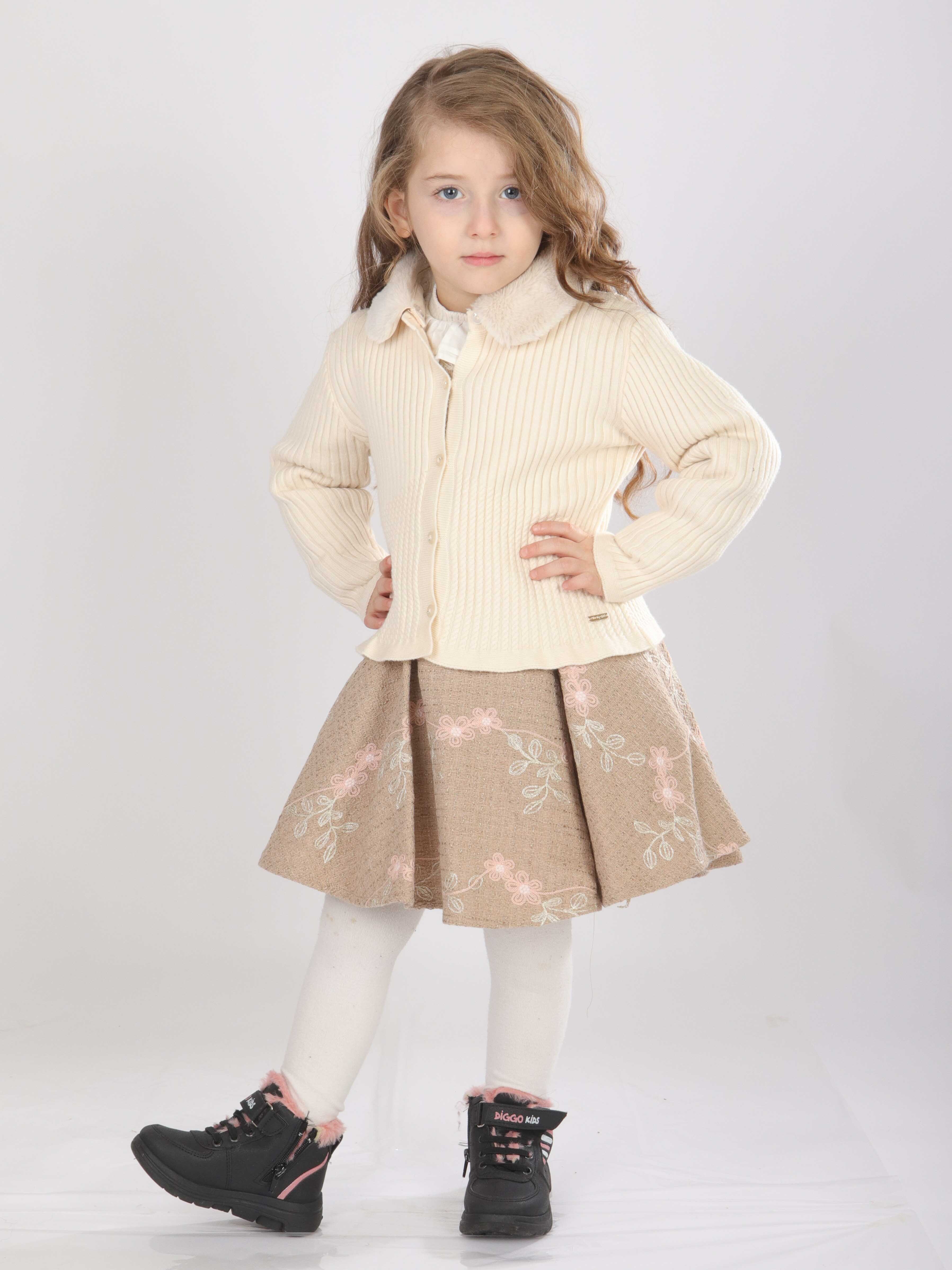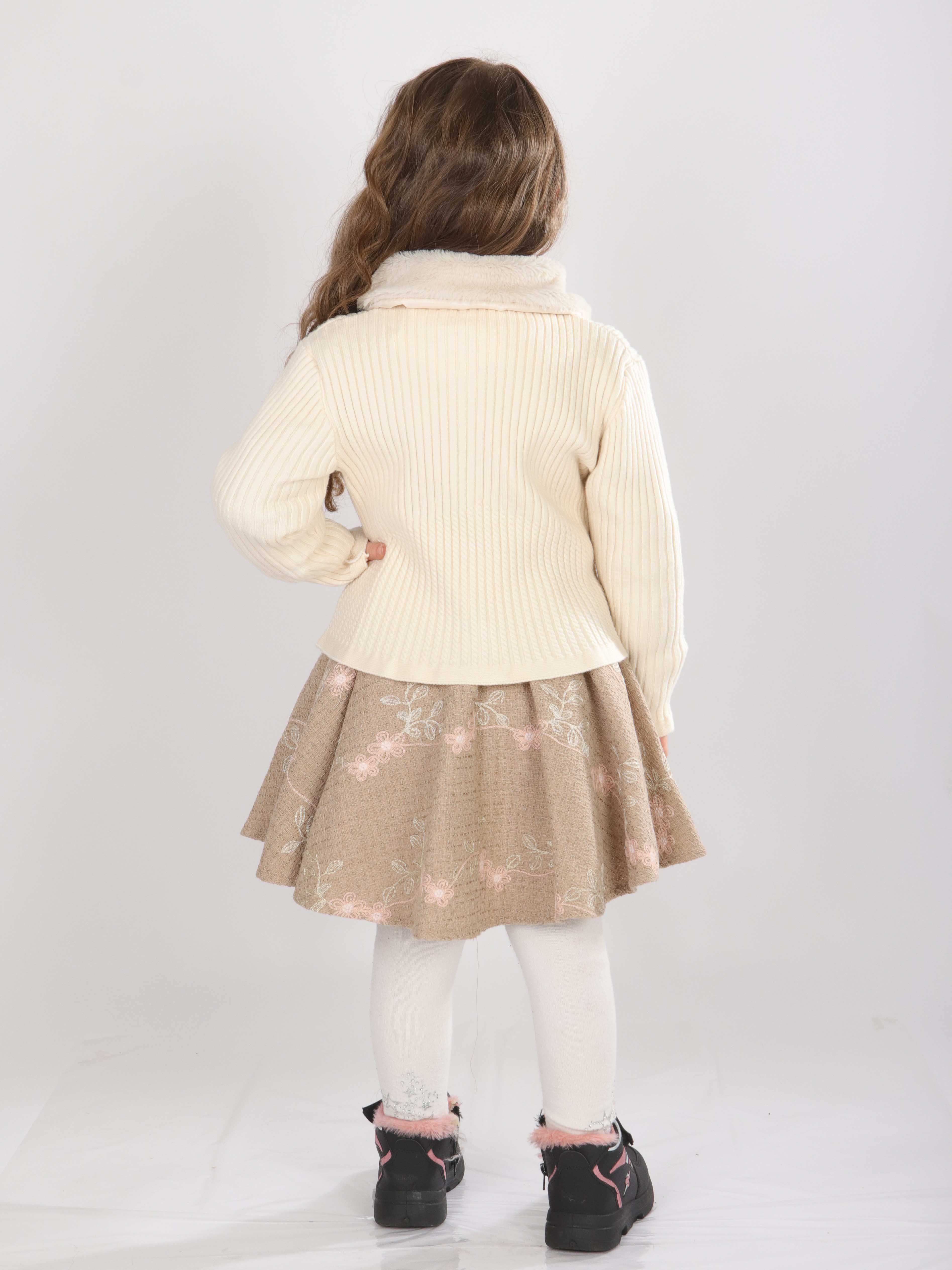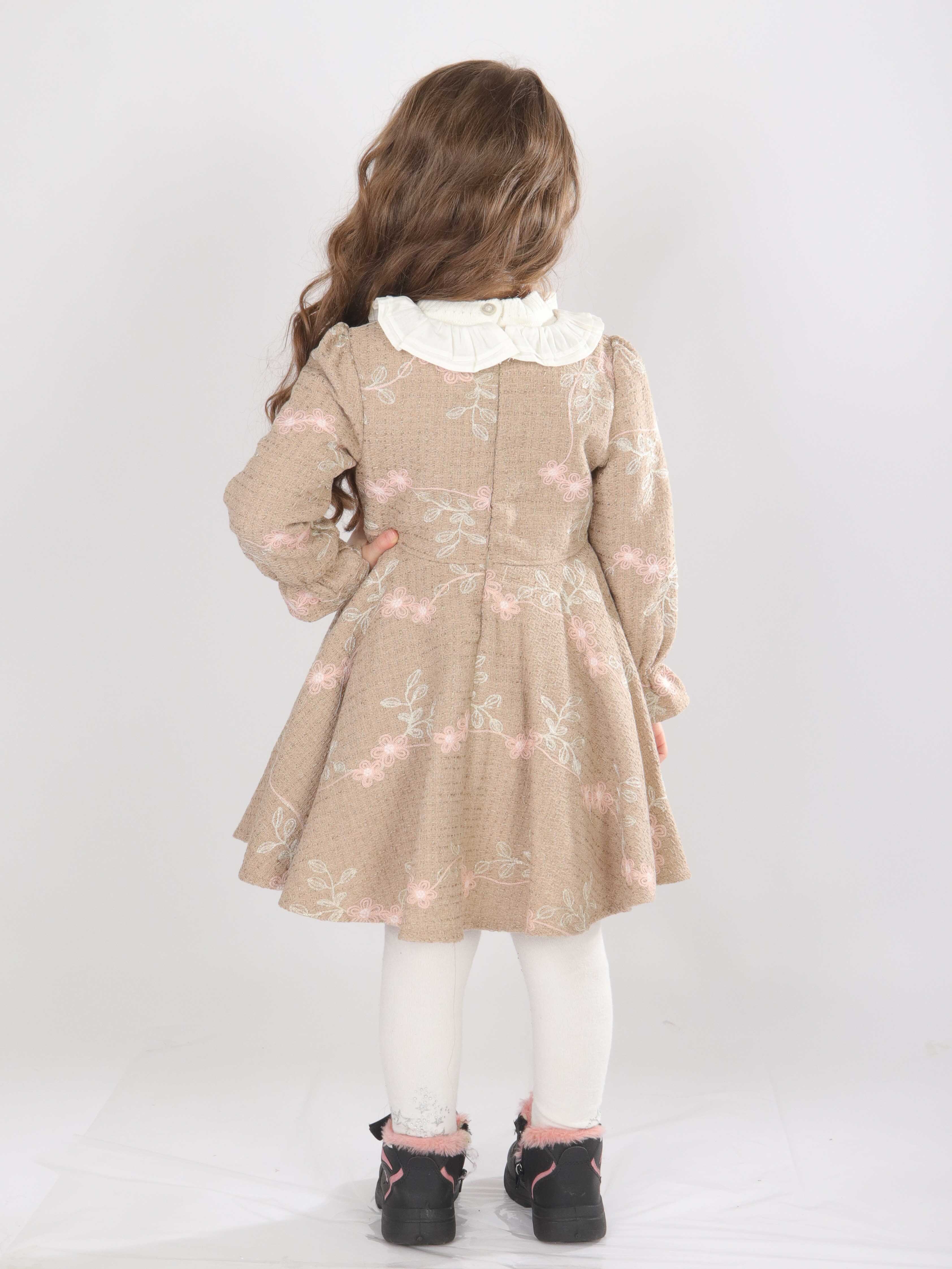 Bu kız çocuk elbisesi, bahar sezonu için şıklığı ve rahatlığı bir araya getiriyor. Krem renginde, düğmeli ve uzun kollu bir üst kısmı bulunan elbise, yumuşak tüylü bir yakaya sahip. Elbisenin alt kısmı, bej tonlarında ve pastel pembe ile açık mavi çiçek işlemeleriyle süslenmiş, midi boyda, etekli bir tasarıma sahip. Kombin rahatlığı artıran beyaz tayt ve siyah-pembe detaylı botlarla tamamlanmıştır. Günlük kullanıma uygun, zarif ve sıcak tutan bir modeldir.