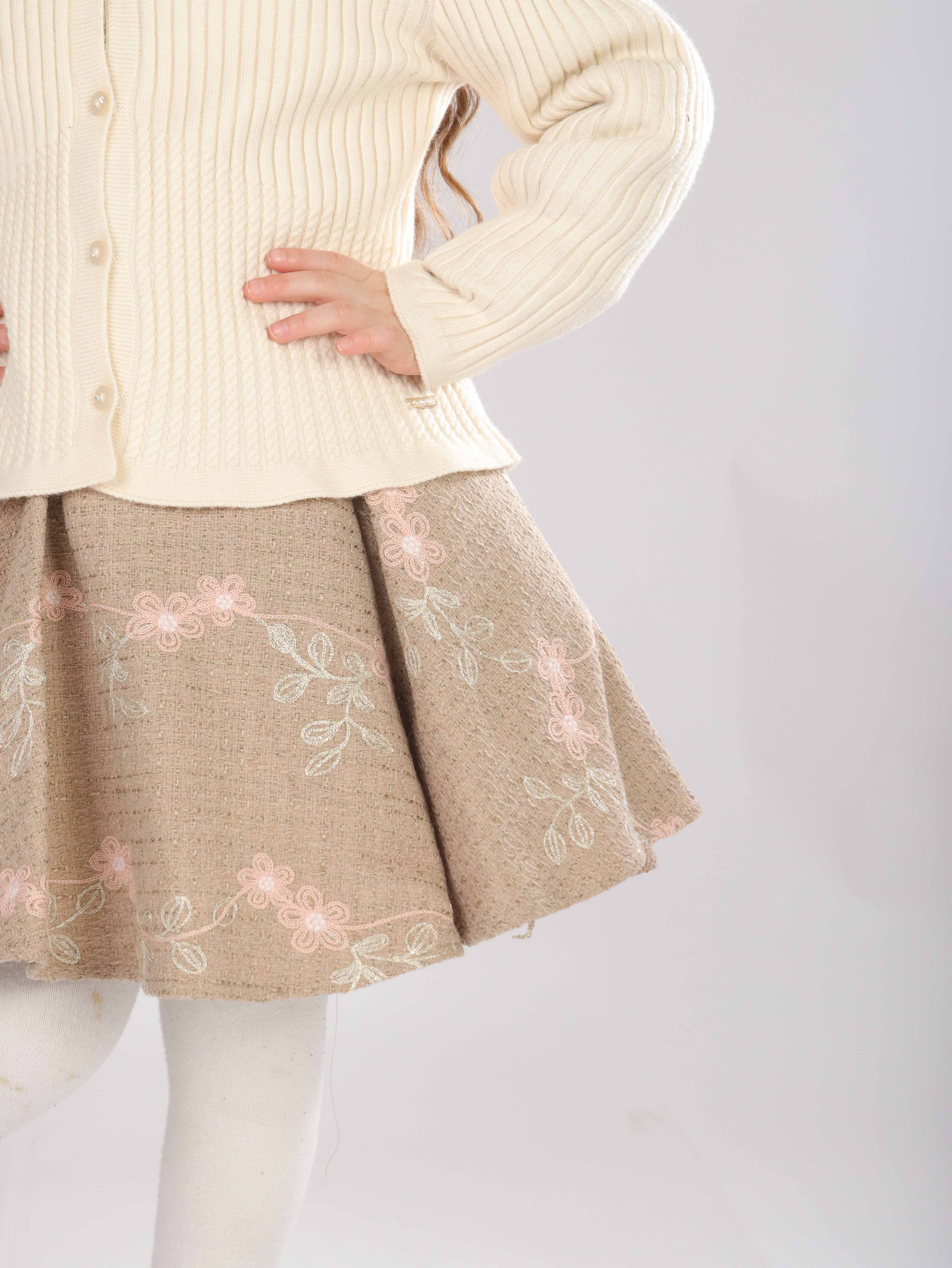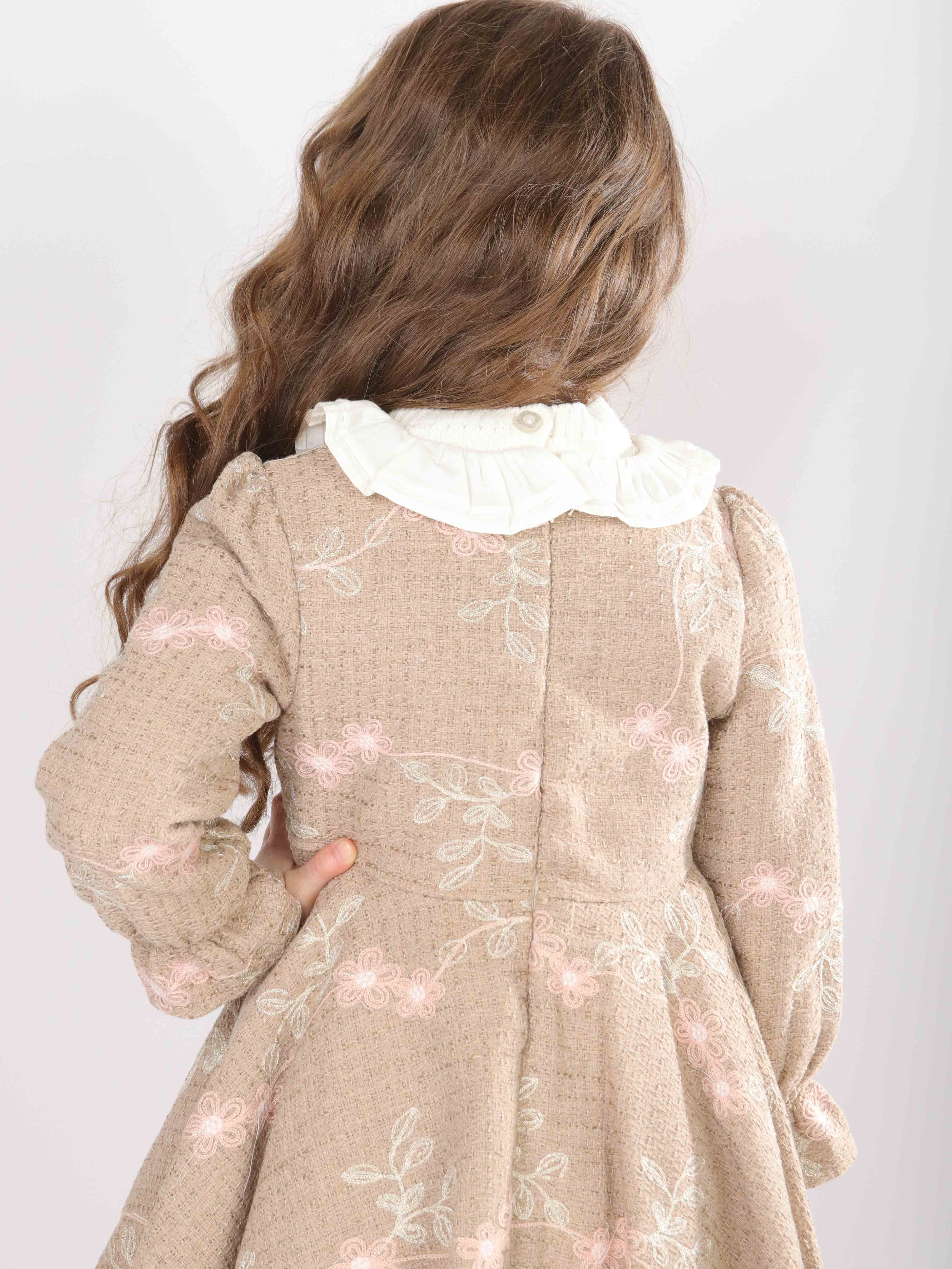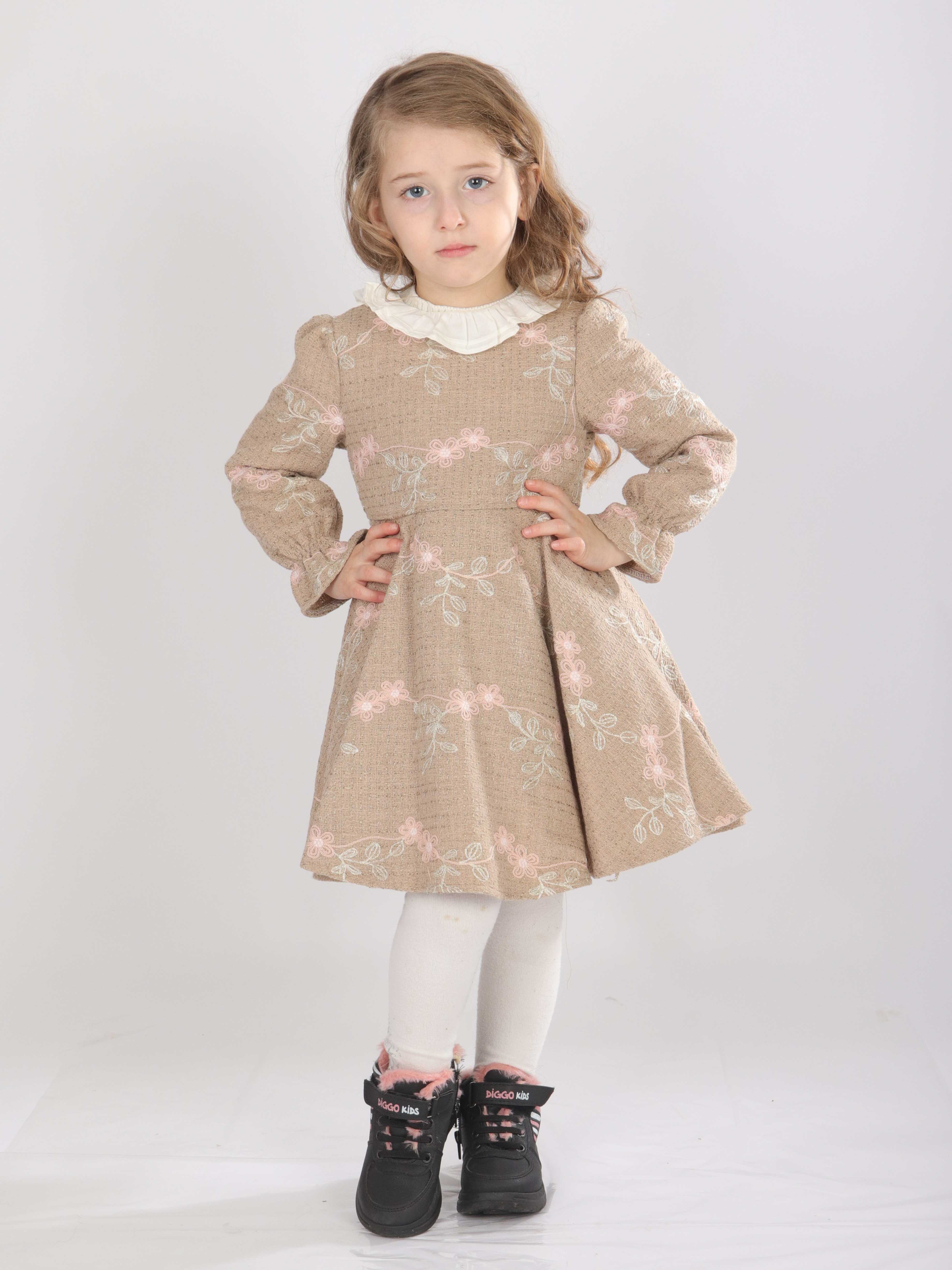 Bu kız çocuk elbisesi, bahar sezonu için şıklığı ve rahatlığı bir araya getiriyor. Krem renginde, düğmeli ve uzun kollu bir üst kısmı bulunan elbise, yumuşak tüylü bir yakaya sahip. Elbisenin alt kısmı, bej tonlarında ve pastel pembe ile açık mavi çiçek işlemeleriyle süslenmiş, midi boyda, etekli bir tasarıma sahip. Kombin rahatlığı artıran beyaz tayt ve siyah-pembe detaylı botlarla tamamlanmıştır. Günlük kullanıma uygun, zarif ve sıcak tutan bir modeldir.