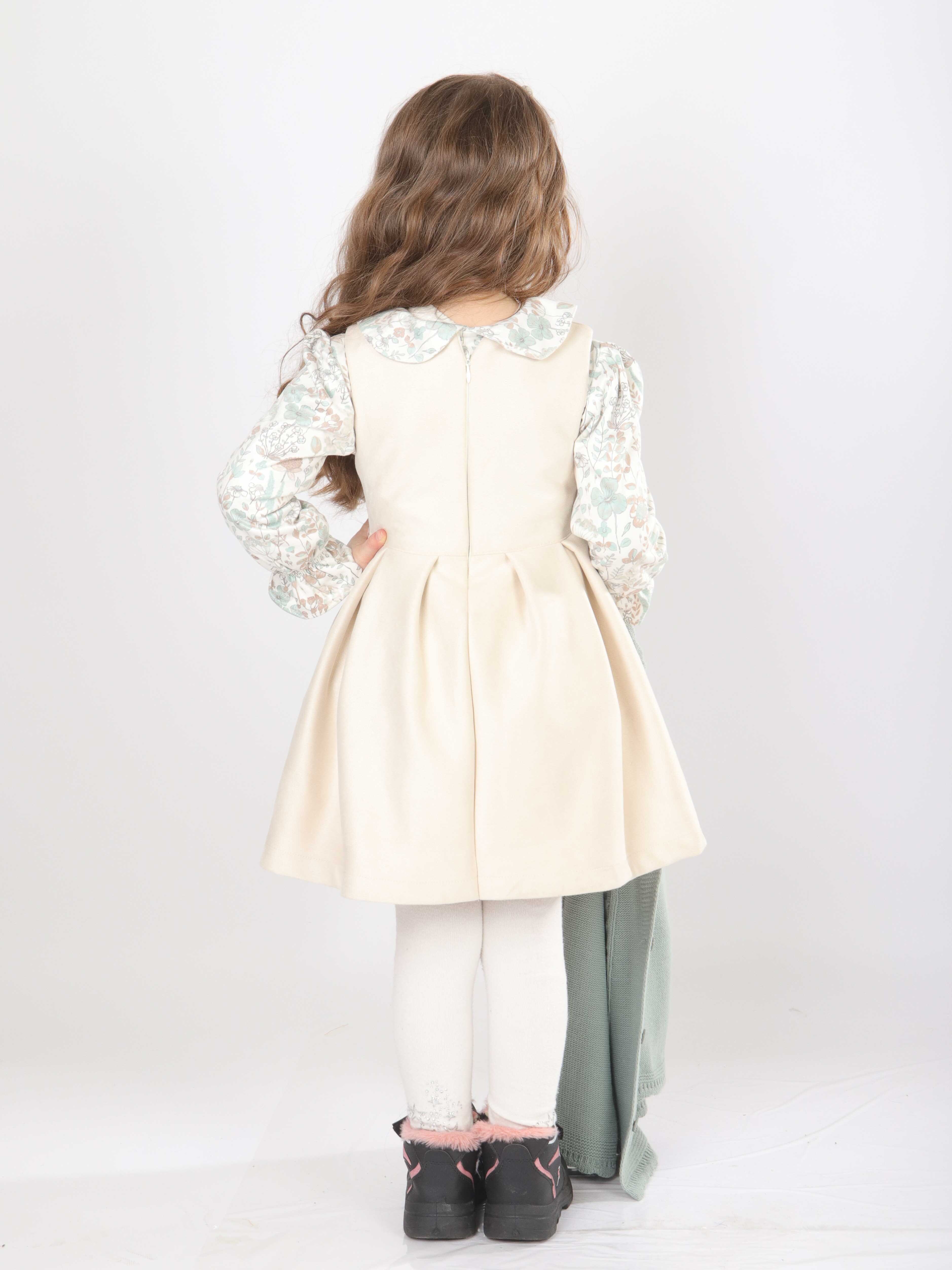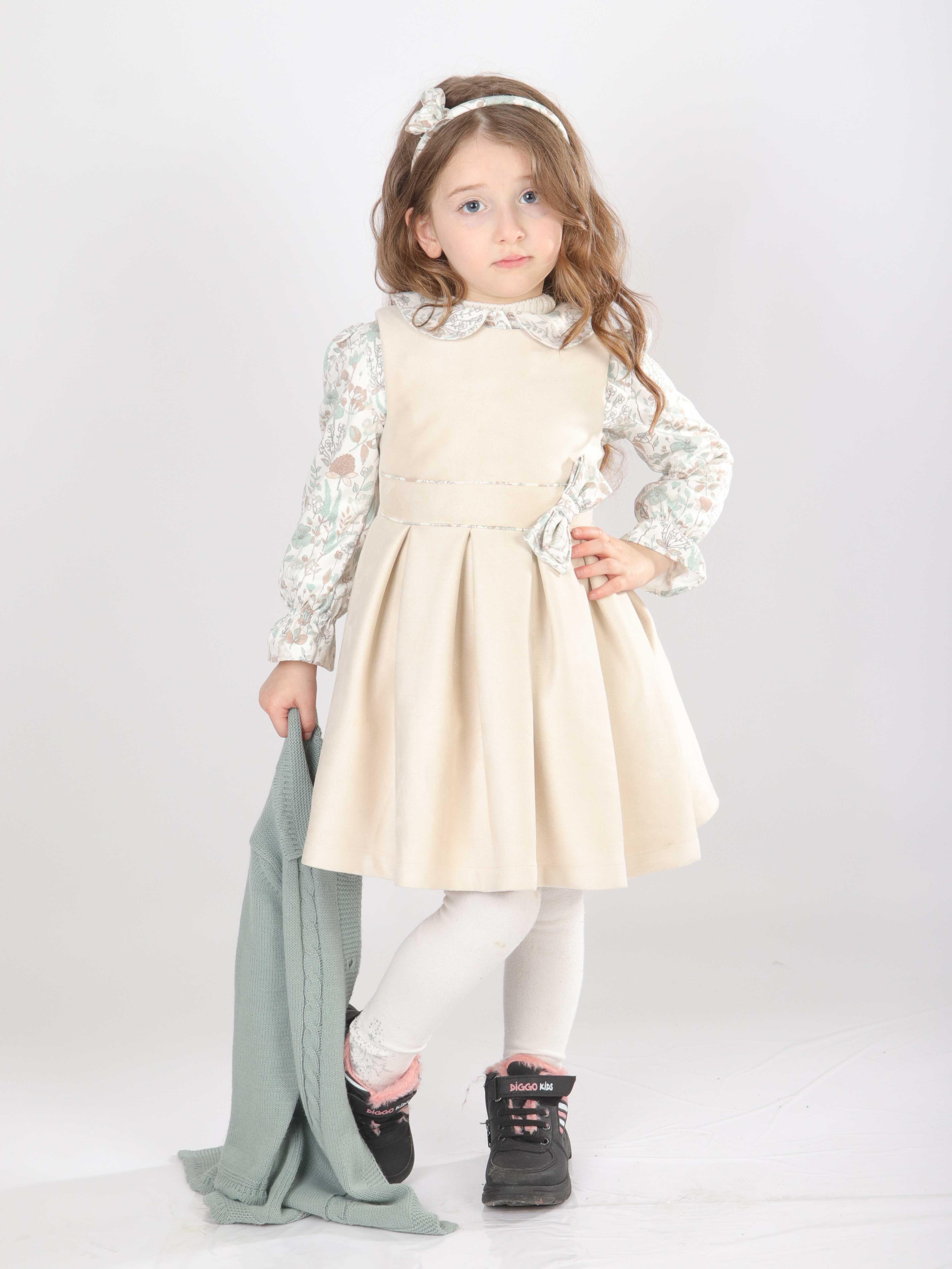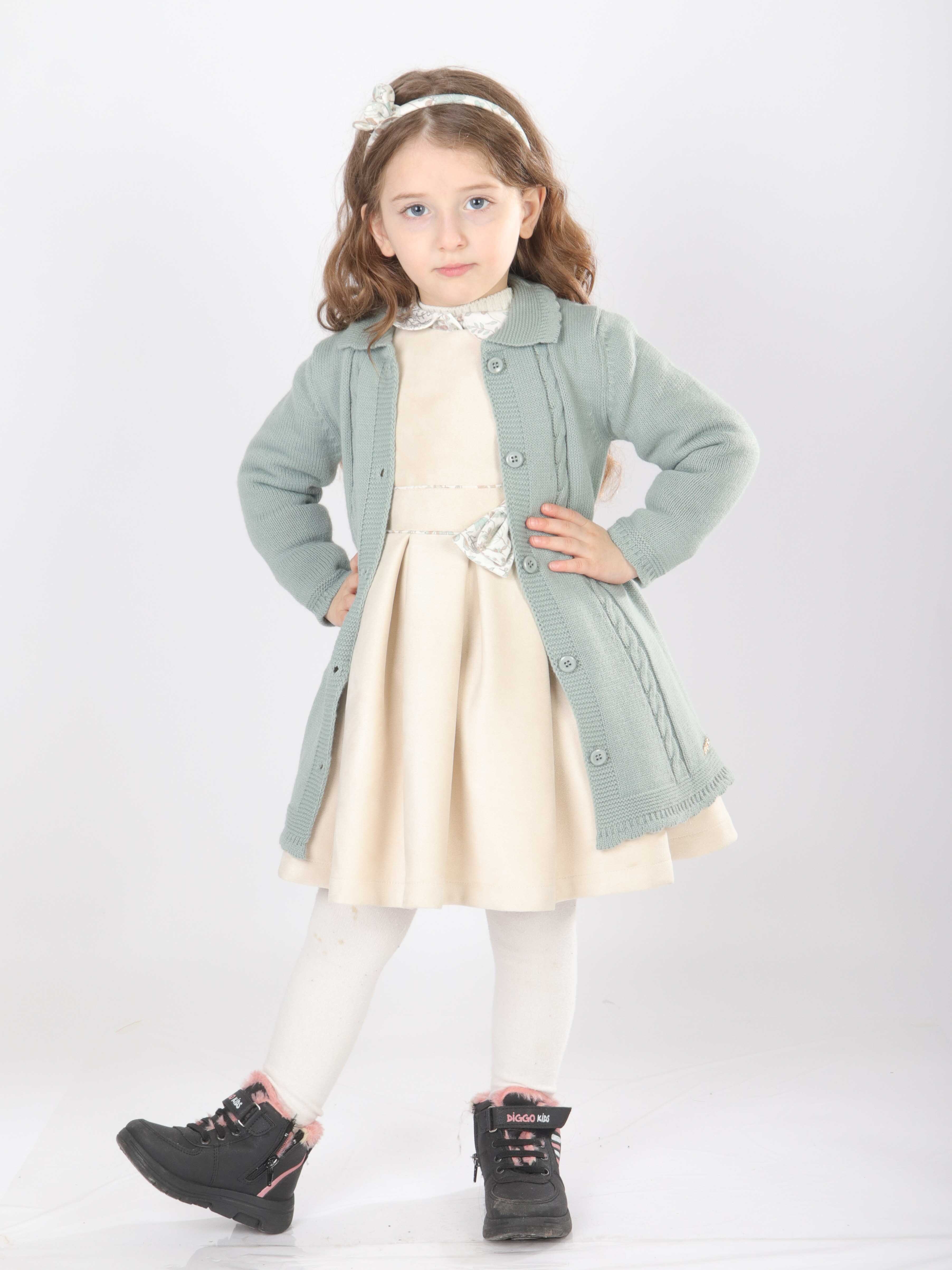 Bu şık kız çocuk elbise seti, bahar ayları için mükemmel bir tercihtir. Elbise, krem rengi kadife kumaştan yapılmış olup, uzun kollu ve çiçek desenli gömlek yakası ile zarif bir görünüm sunar. Elbisenin belinde ve yakasında bulunan küçük fiyonk detayları, tasarıma ince bir dokunuş katar. Üzerine giyilen mint yeşili triko hırka, düğmeli ve uzun kollu olup, örgü detayları ve zarif fırfırları ile klasik ve rahat bir stil yaratır. Kombin, beyaz tayt ve siyah-pembe detaylı botlarla tamamlanarak hem şık hem de kullanışlı bir çocuk kıyafeti sunar.