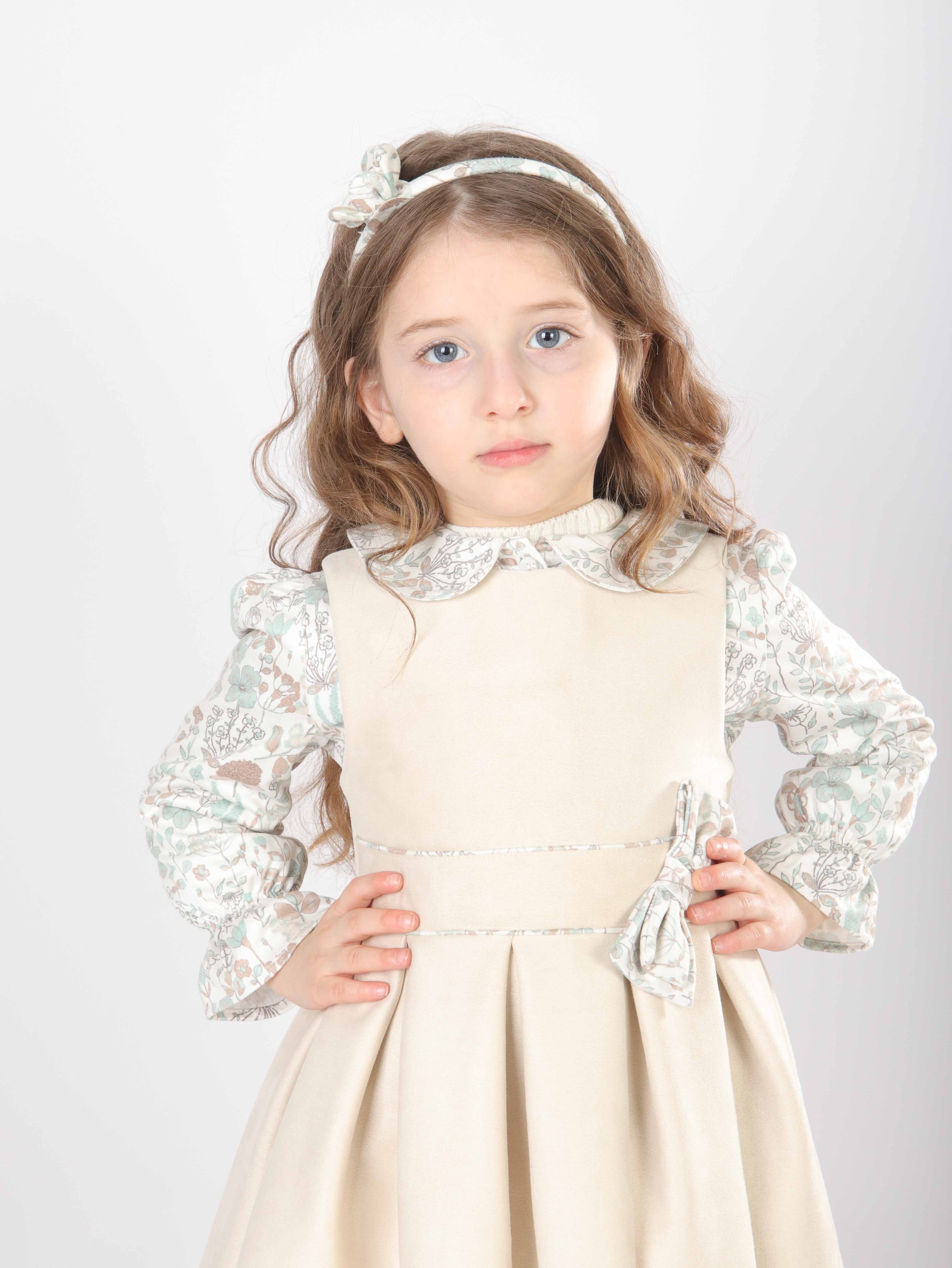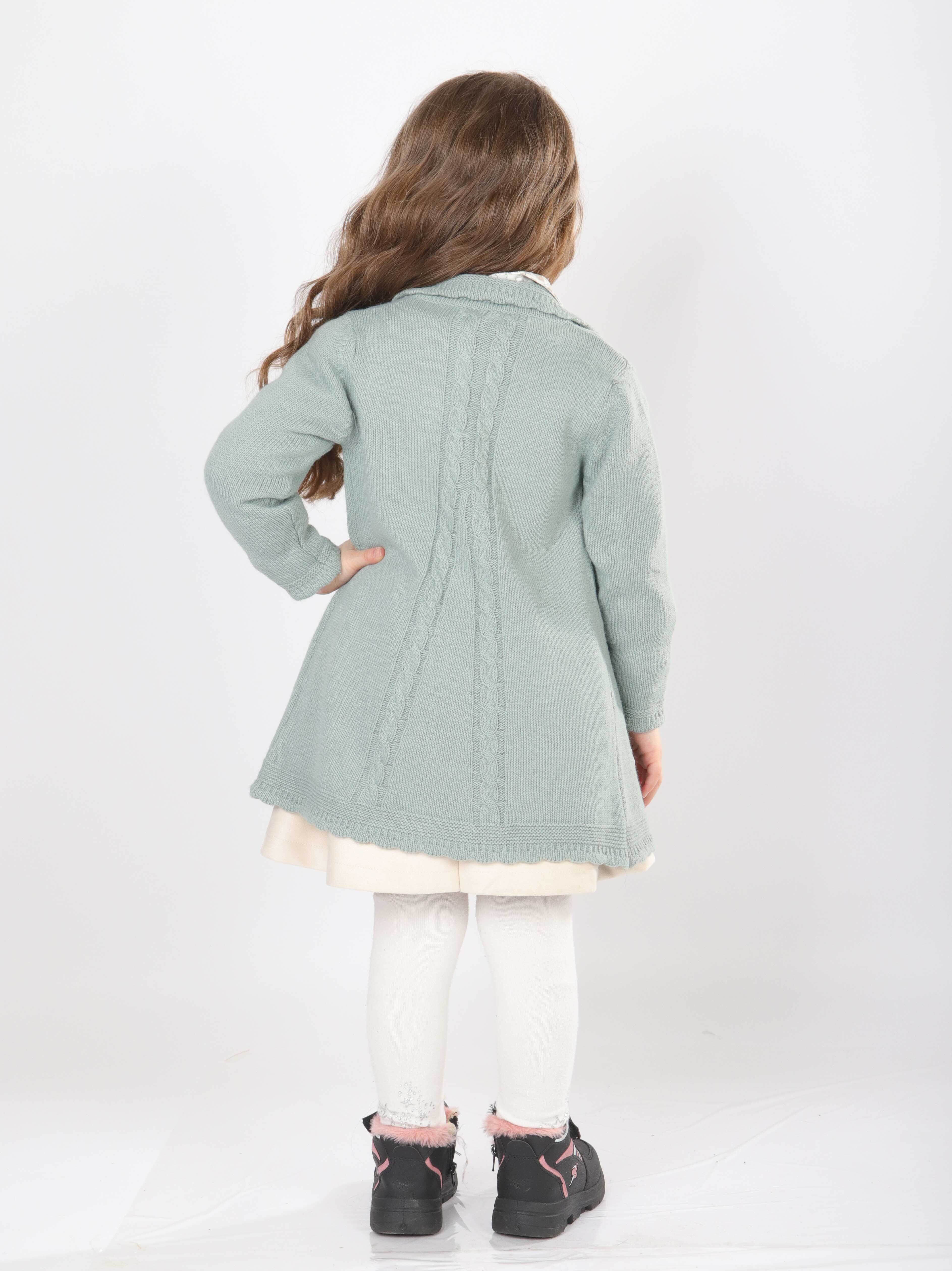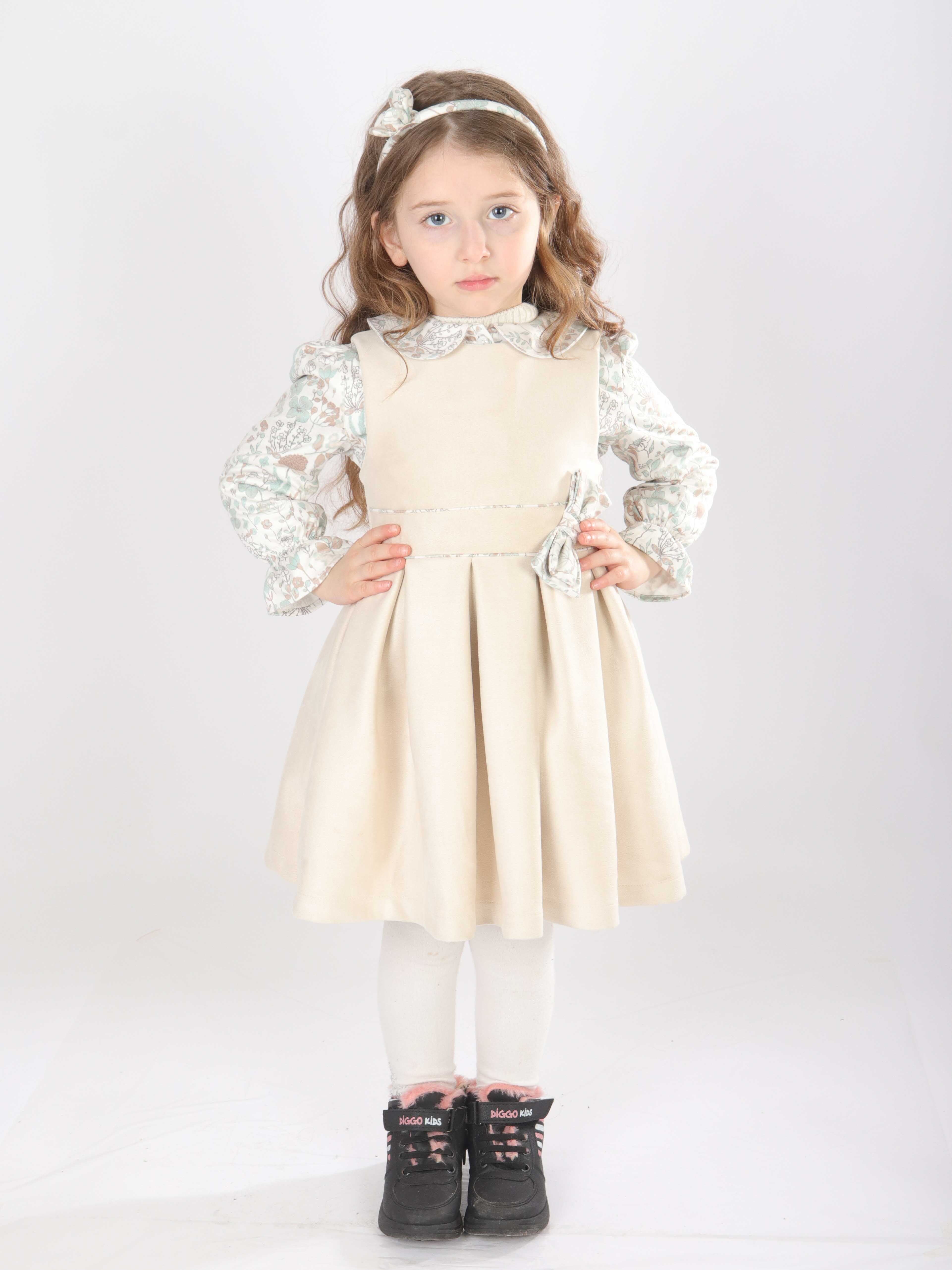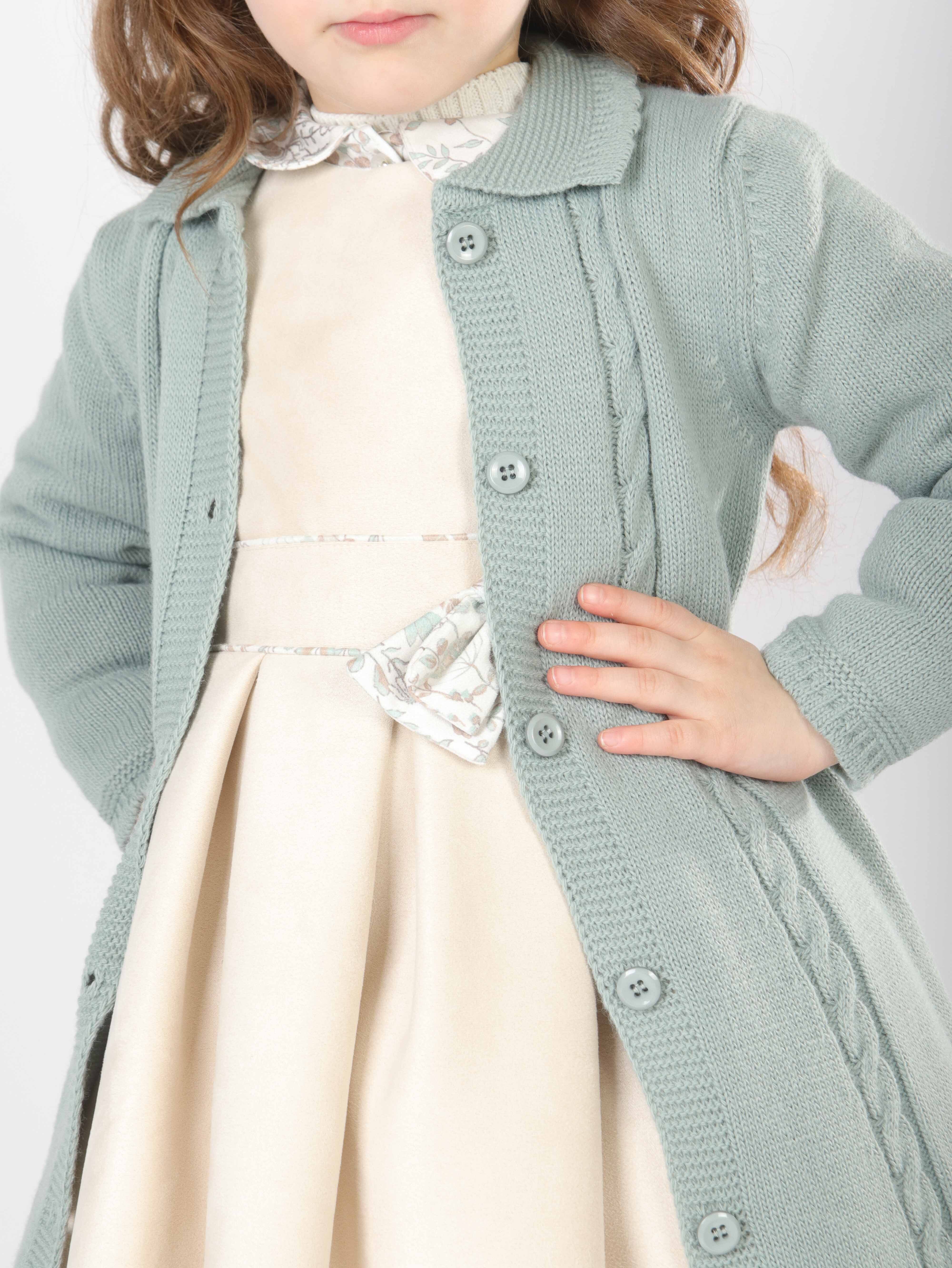 Bu şık kız çocuk elbise seti, bahar ayları için mükemmel bir tercihtir. Elbise, krem rengi kadife kumaştan yapılmış olup, uzun kollu ve çiçek desenli gömlek yakası ile zarif bir görünüm sunar. Elbisenin belinde ve yakasında bulunan küçük fiyonk detayları, tasarıma ince bir dokunuş katar. Üzerine giyilen mint yeşili triko hırka, düğmeli ve uzun kollu olup, örgü detayları ve zarif fırfırları ile klasik ve rahat bir stil yaratır. Kombin, beyaz tayt ve siyah-pembe detaylı botlarla tamamlanarak hem şık hem de kullanışlı bir çocuk kıyafeti sunar.