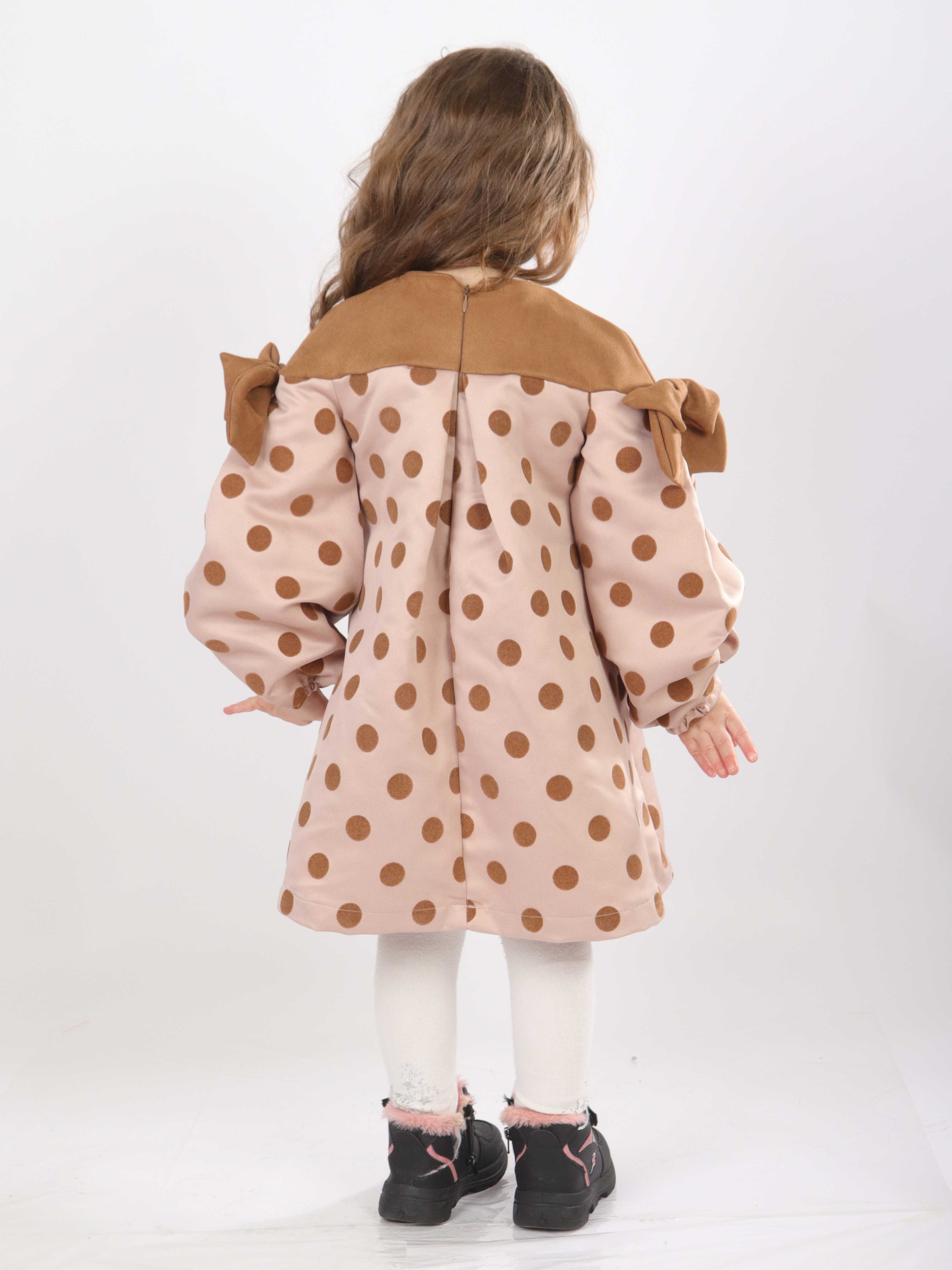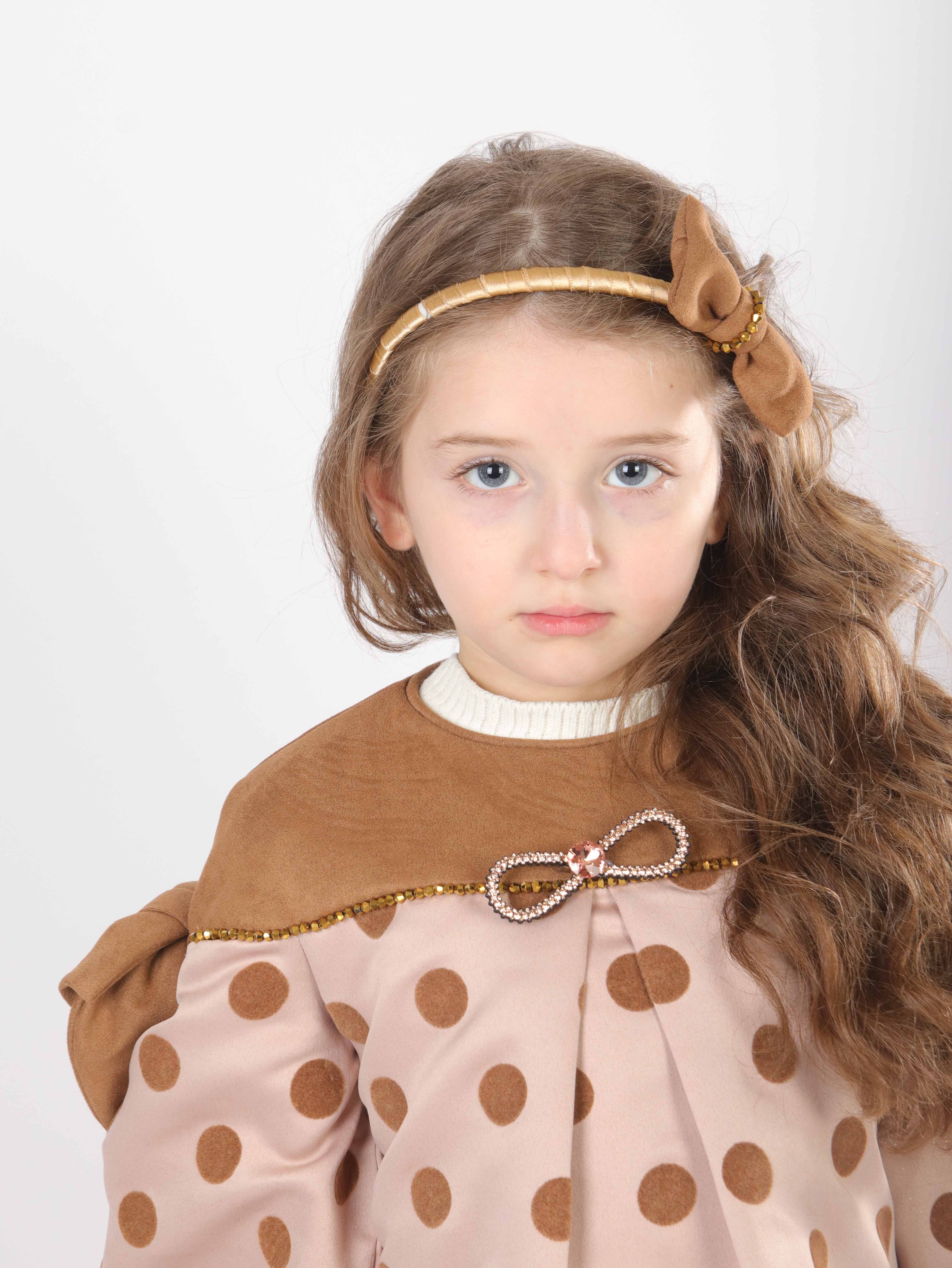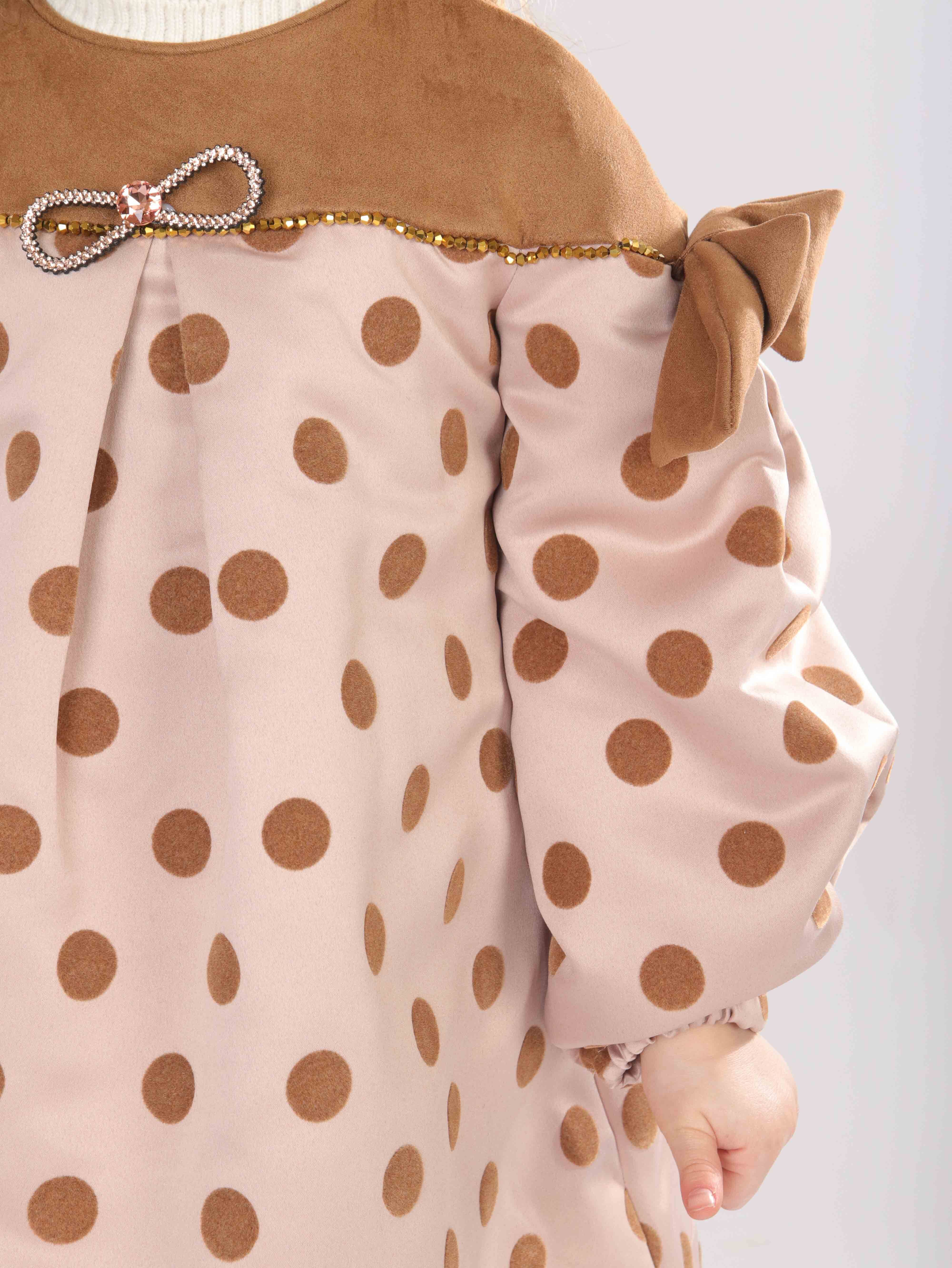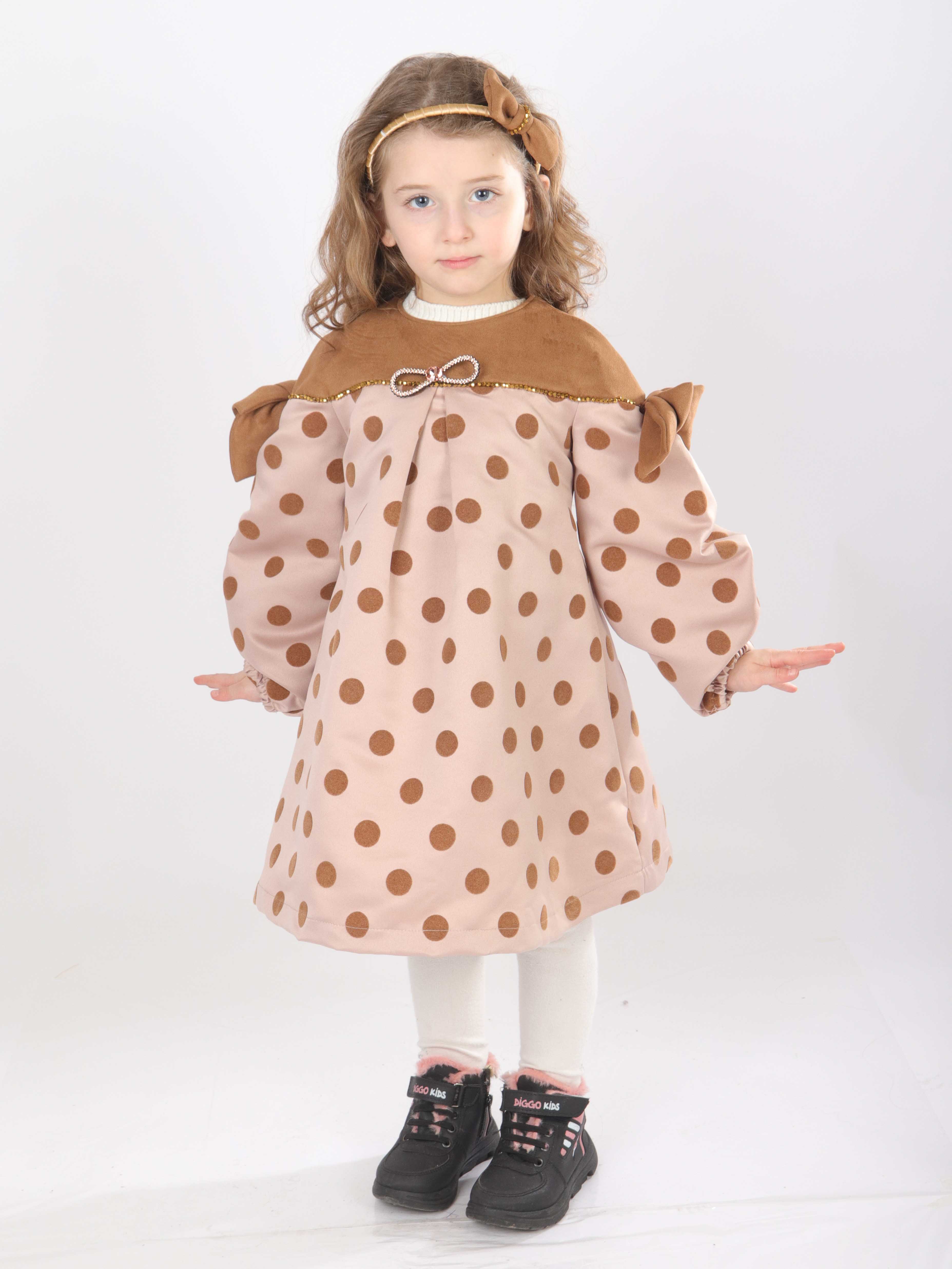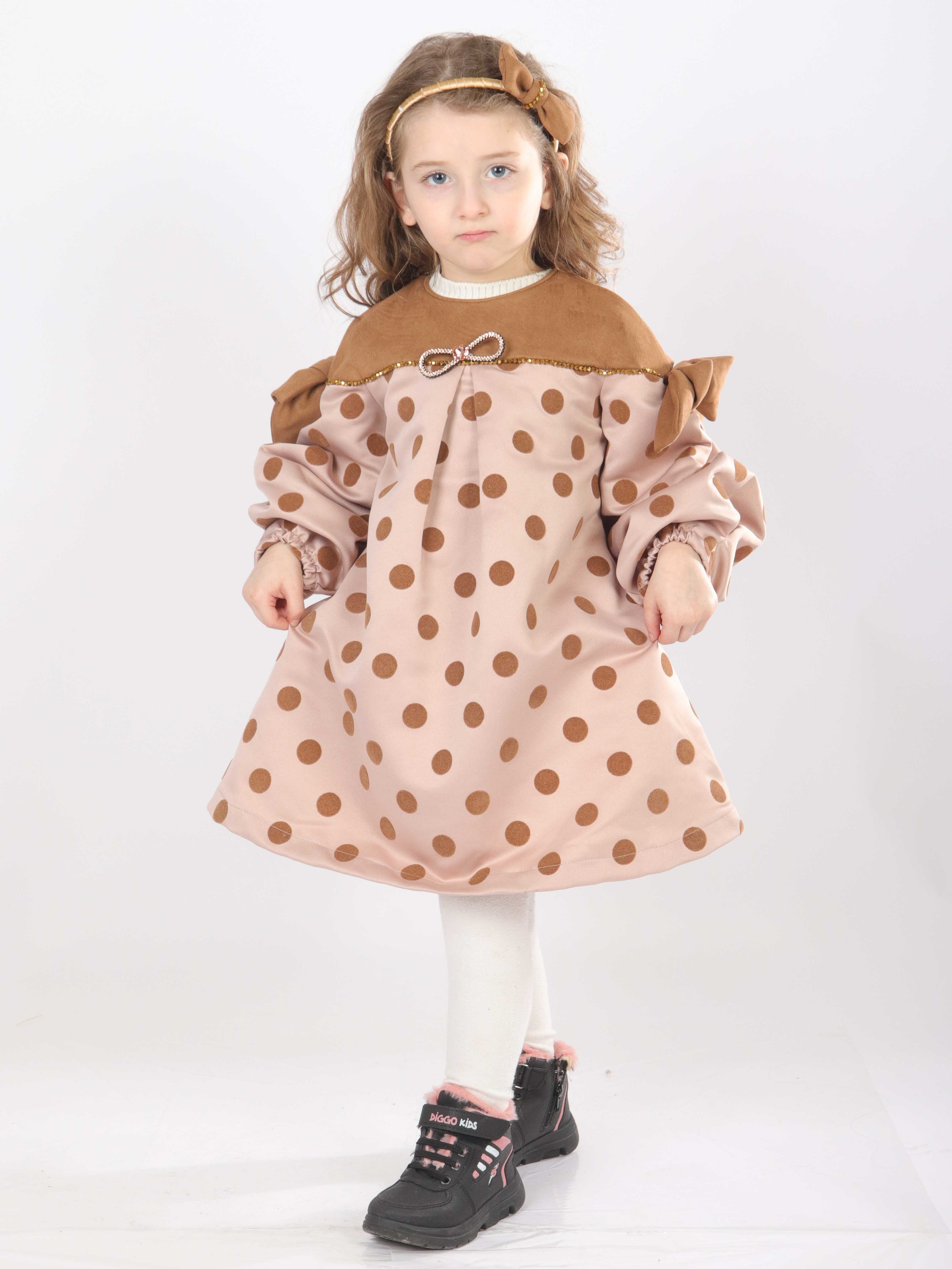 Gelince Haber VerBu kız çocuk elbisesi, bej ve kahverengi tonlarında şık bir tasarıma sahiptir. Uzun kollu ve midi uzunluğundaki elbise, yuvarlak kahverengi puantiyelerle süslenmiş yumuşak bej kumaştan üretilmiştir. Sıfır yakalı modelin omuzlarında sevimli kahverengi fiyonk detayları bulunur. Üst kısmındaki süet görünümlü kahverengi parça ve ince altın rengi süsleme, elbiseye zarif bir hava katmaktadır. Arkada fermuarlı kapanışı sayesinde kolay giyilip çıkarılabilir. Elastik manşetler sayesinde kollarda rahatlık sağlanır. Bahar mevsimi için ideal, hem günlük hem özel günlerde tercih edilebilecek şık ve konforlu bir elbisedir.