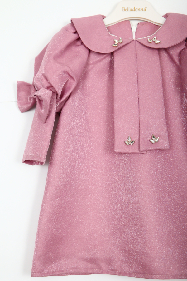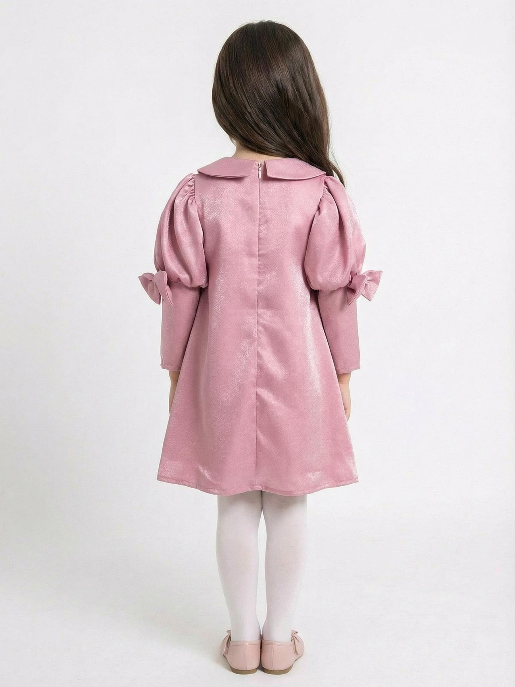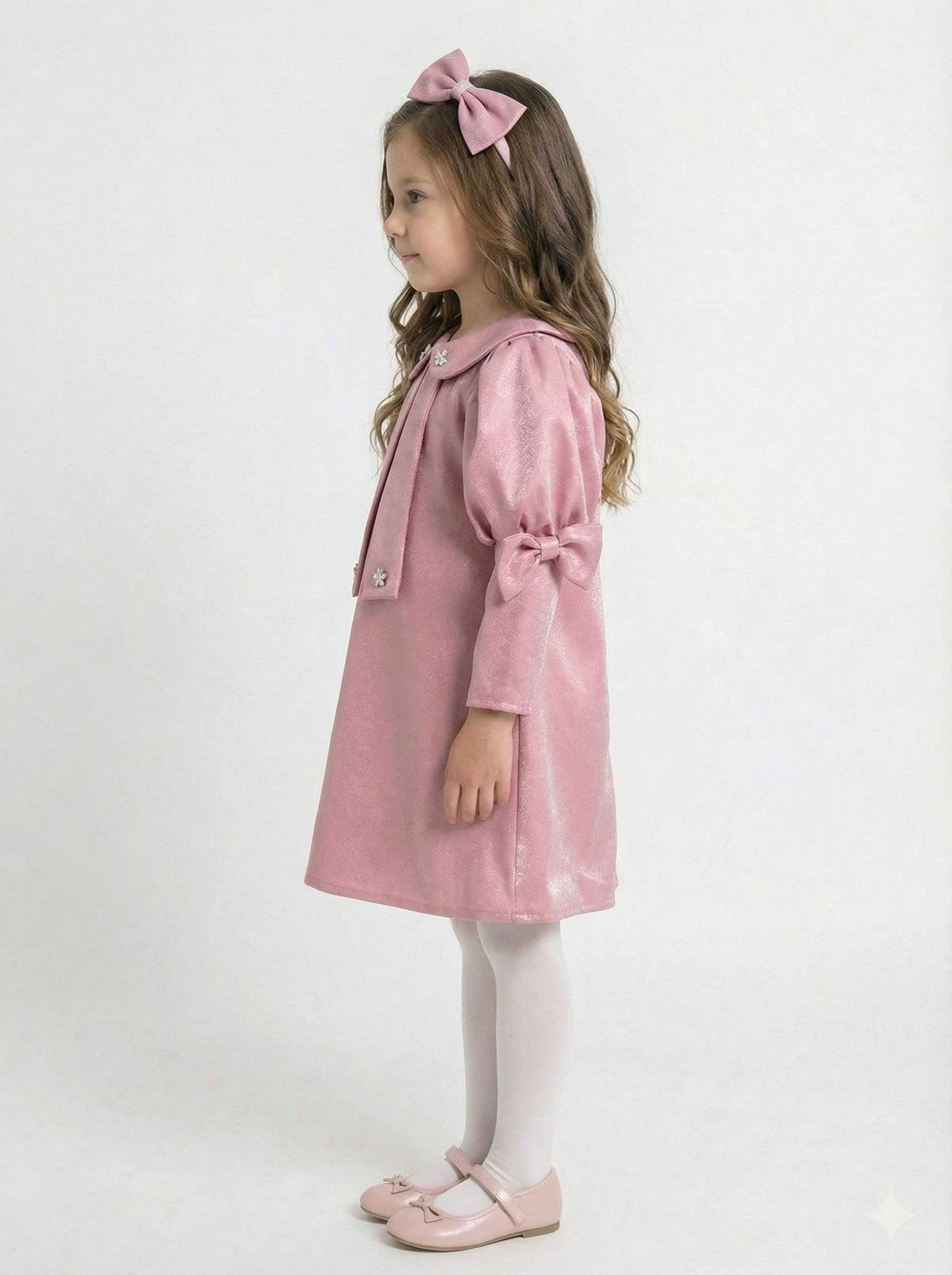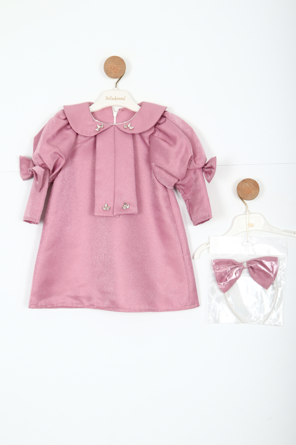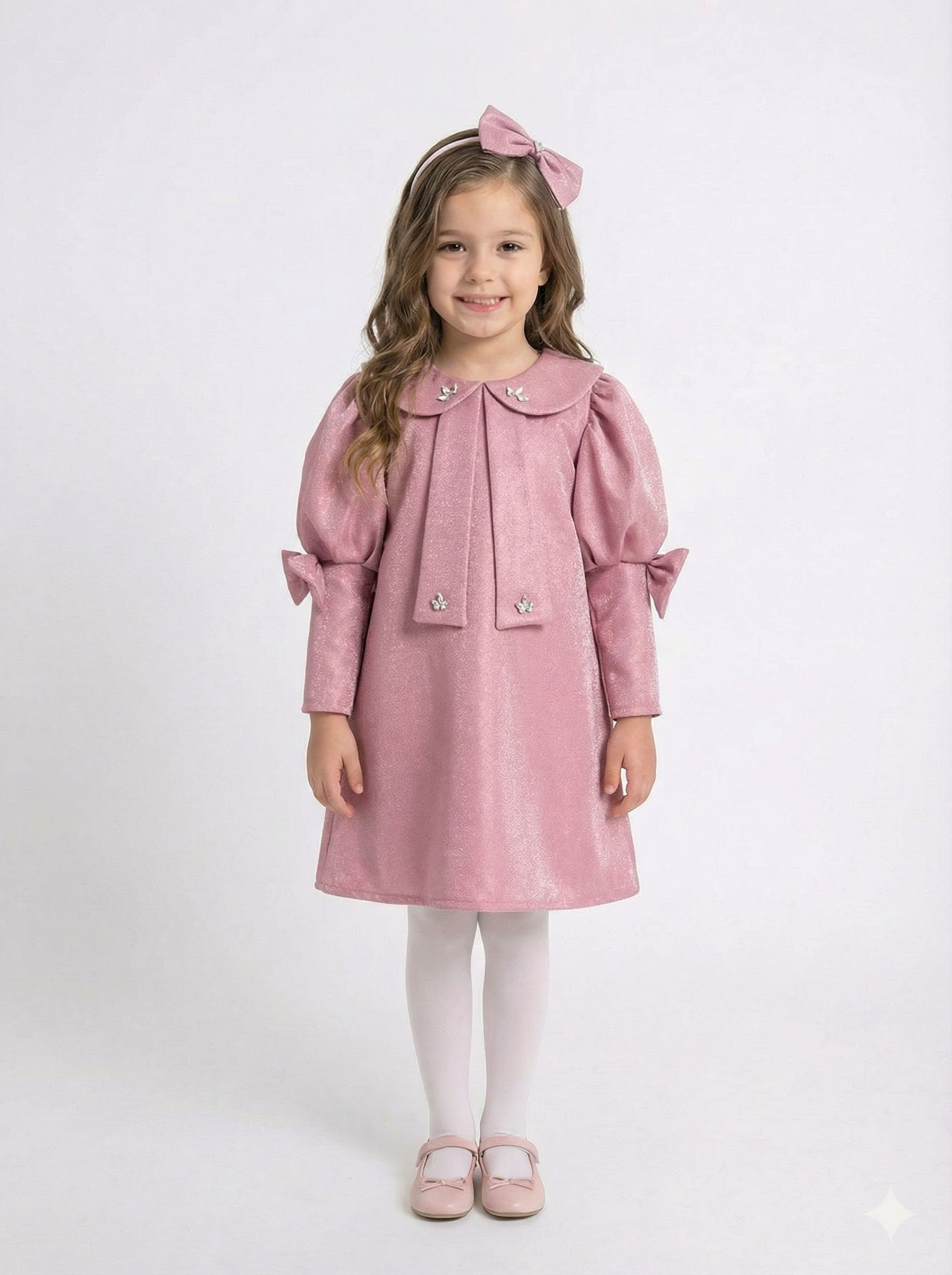 Bu şık kız çocuk elbisesi, özel günler ve davetler için mükemmel bir tercihtir. Parlak pembe renk tonuyla dikkat çeken elbise, uzun kollu ve puff kol detayıyla zarif bir görünüm sunar. Geniş ve yuvarlak yakası, üzerindeki küçük taşlı süslemelerle şıklığı artırırken, kolların üzerindeki şık fiyonk detayları da ekstra bir sevimlilik katar. Elbisenin arka kısmında gizli fermuar bulunur ve rahat giyip çıkarma imkanı sağlar. Yanında aynı renkte büyük fiyonk detaylı bir saç bandı aksesuarı ile birlikte gelir. Kız çocukları için rahat ve şık bir kombin oluşturmak isteyen aileler için idealdir.