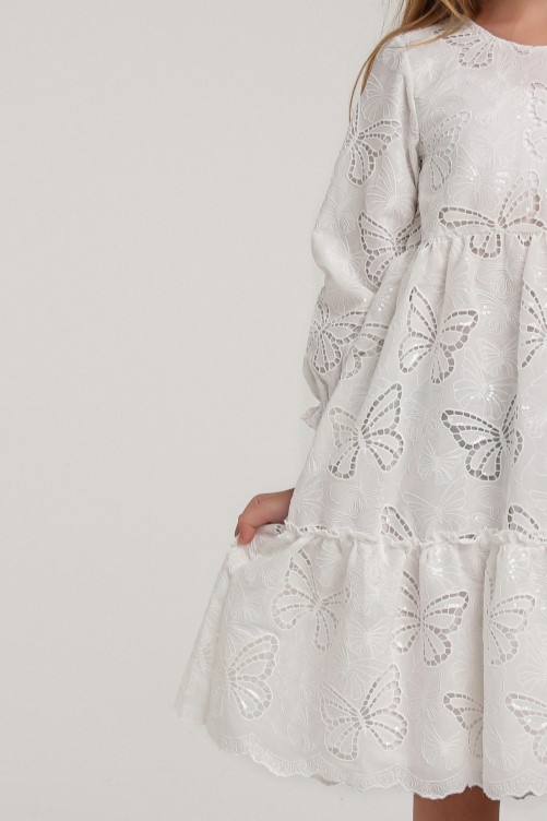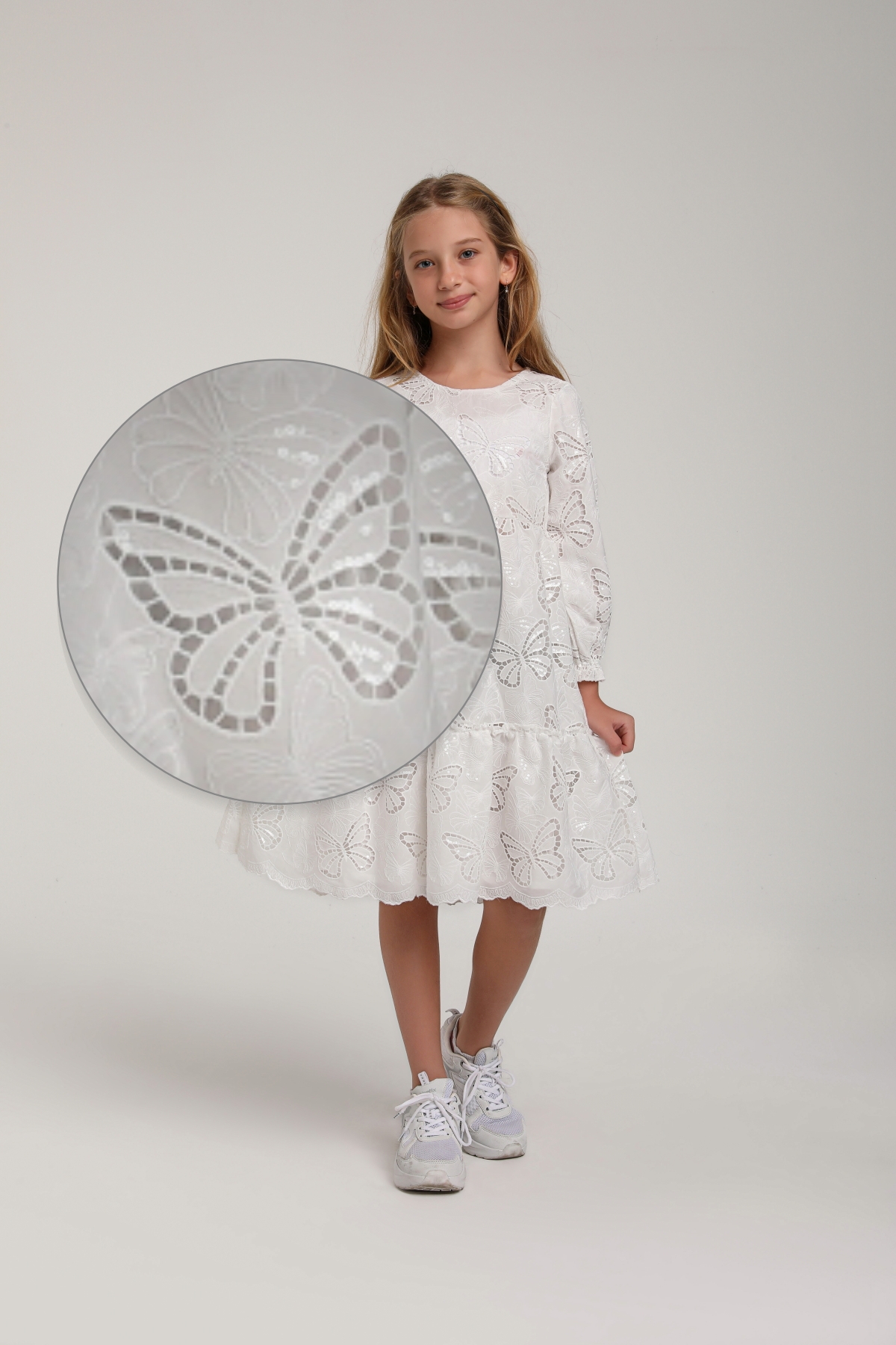 هذه الفستان الأنيق مصمم للفتيات، حيث يقدم مظهرًا أنيقًا. بلون بيج فاتح مزين بنقوش الفراشات، يوفر تجربة مريحة ومنعشة خلال أشهر الصيف. التصميم ذو الأكمام الطويلة وتفاصيل التنورة المنحنية يسمحان بحرية الحركة دون التضحية بالأناقة.