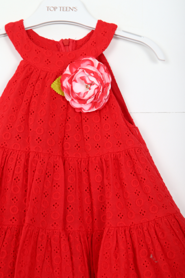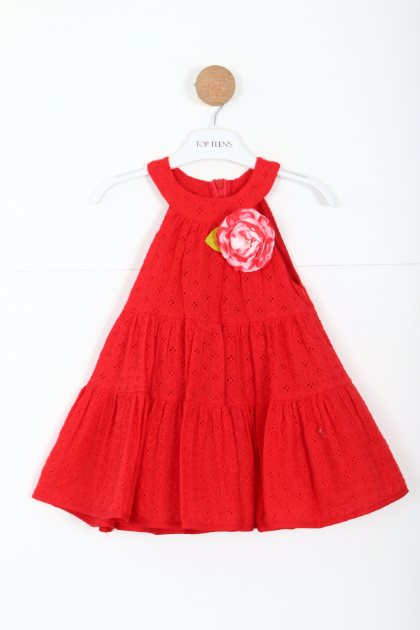Gelince Haber VerBu kız çocuk elbisesi, şık ve rahat tasarımı ile öne çıkıyor. Kolsuz ve bisiklet yaka kesimi sayesinde yaz ayları için ideal bir seçenek sunar. Canlı kırmızı rengindeki elbise, göz alıcı işlemeli dantel detaylarıyla süslenmiştir. Göğüs kısmında büyük, pembe-beyaz tonlarında yapay çiçek aksesuvarı bulunur ve bu detay elbiseye zarif bir dokunuş katar. Kat kat pileli midi uzunluğu ile hareket özgürlüğü sağlar ve oyun saatlerinde de rahatlık sunar. Arkada gizli fermuarla kolayca giyilip çıkarılabilir.