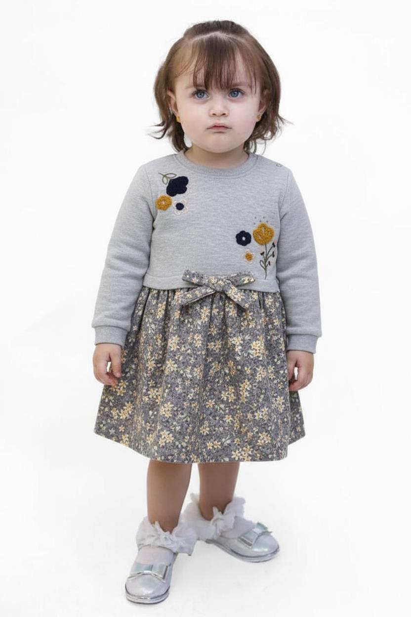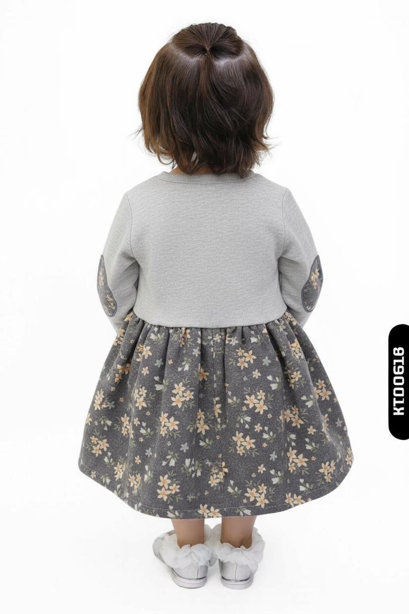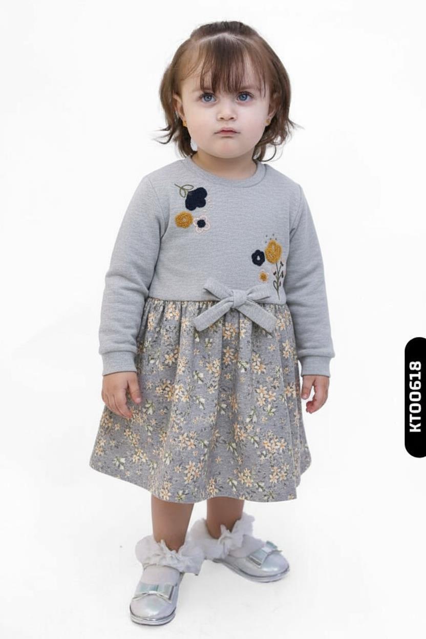 Bu sevimli kız çocuk elbisesi, kış ayları için ideal yumuşak ve sıcak kumaştan üretilmiştir. Üst kısmı düz gri renkte ve uzun kollu, bisiklet yaka tasarımlıdır. Göğüs kısmında sarı ve lacivert tonlarında nakış çiçek detayları bulunurken, belde şık bir fiyonk aksesuarı vardır. Etek kısmı ise çiçek desenleriyle süslenmiş, midi boy uzunluğunda ve esnek dokuludur. Elbisenin arka kısmında da dirseklerde uyumlu desenli yama detayları yer alır. Günlük ve özel günler için hem rahat hem de şık bir seçimdir.