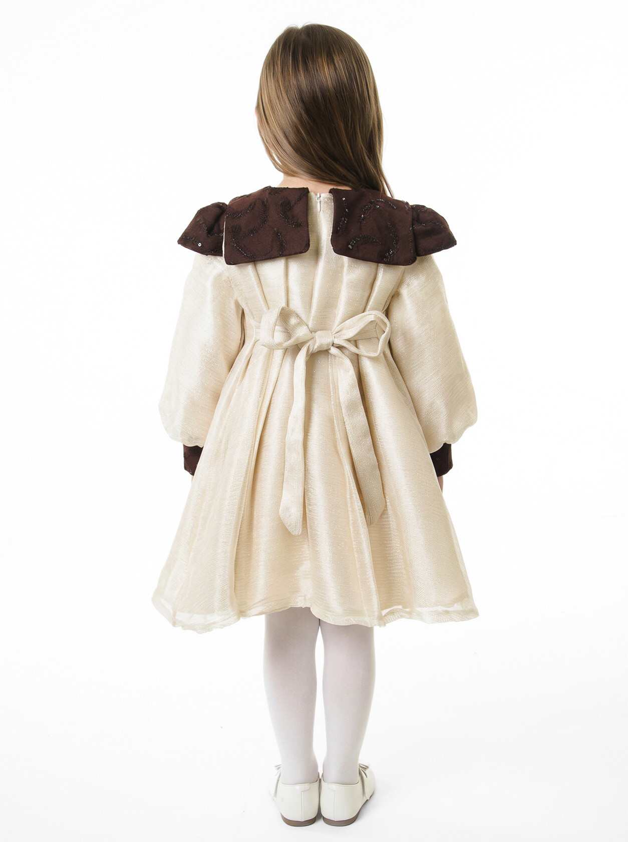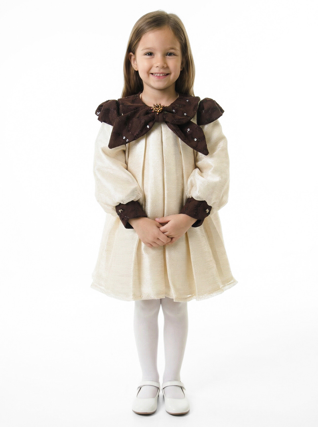Bu kız çocuk elbisesi, şıklığı ve rahatlığı bir arada sunar. Pembe tonlarında, hafif parlak dokusu ile dikkat çeker. Elbise uzun kollu olup, manşetlerinde düğme detayı bulunur. Sıfır yaka tasarımı, büyük ve gösterişli ekru renkli fiyonk ile süslenmiştir. Belde arkadan bağlanan kurdele detayı ile hem estetik hem de ayarlanabilir bir kullanım sağlar. Diz hizasında, midi boyda kesime sahiptir.
