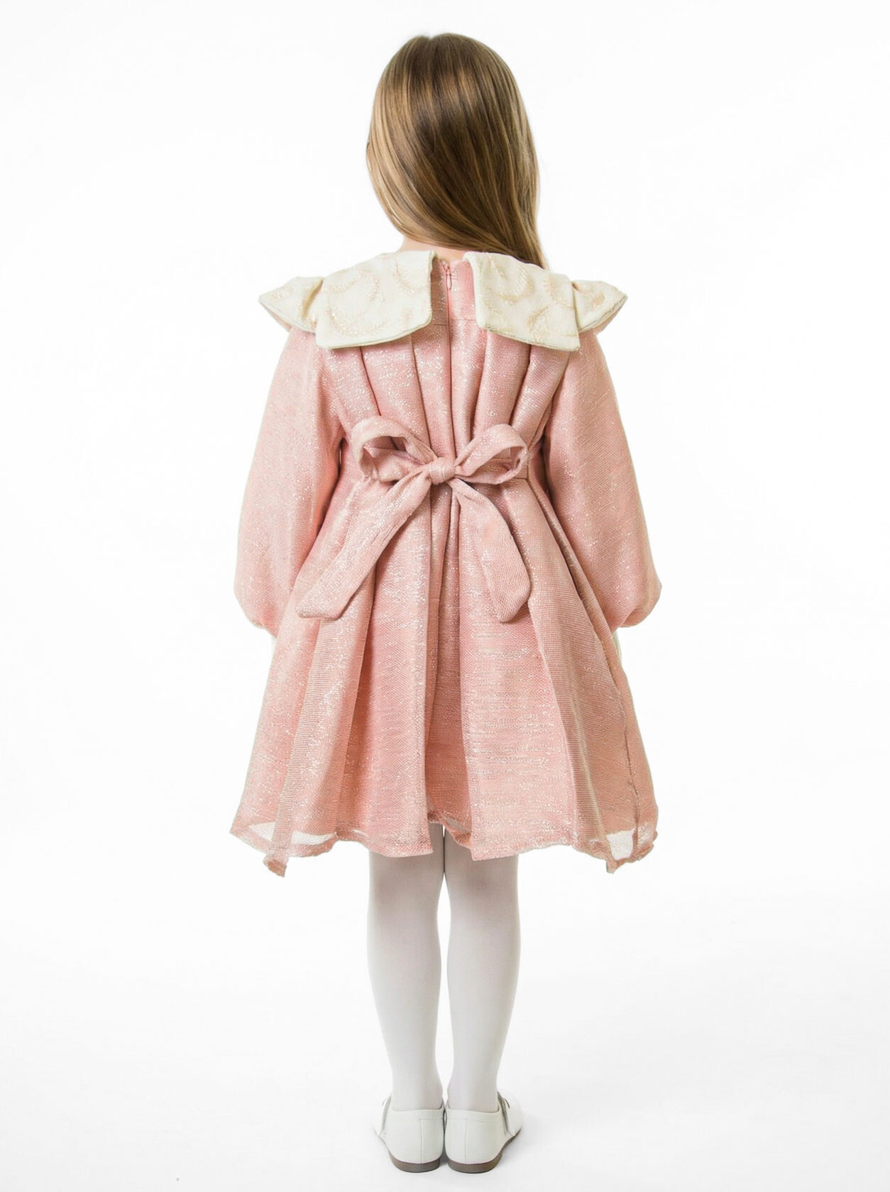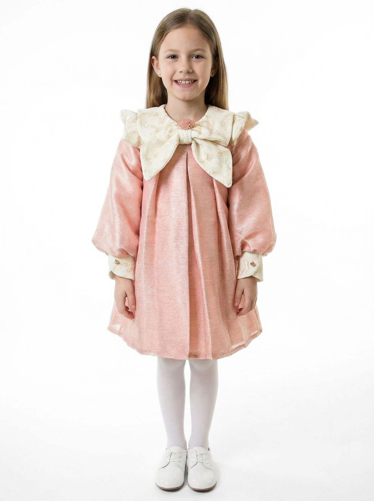 Bu kız çocuk elbisesi, şıklığı ve rahatlığı bir arada sunar. Pembe tonlarında, hafif parlak dokusu ile dikkat çeker. Elbise uzun kollu olup, manşetlerinde düğme detayı bulunur. Sıfır yaka tasarımı, büyük ve gösterişli ekru renkli fiyonk ile süslenmiştir. Belde arkadan bağlanan kurdele detayı ile hem estetik hem de ayarlanabilir bir kullanım sağlar. Diz hizasında, midi boyda kesime sahiptir.