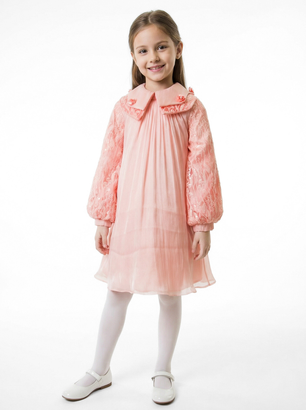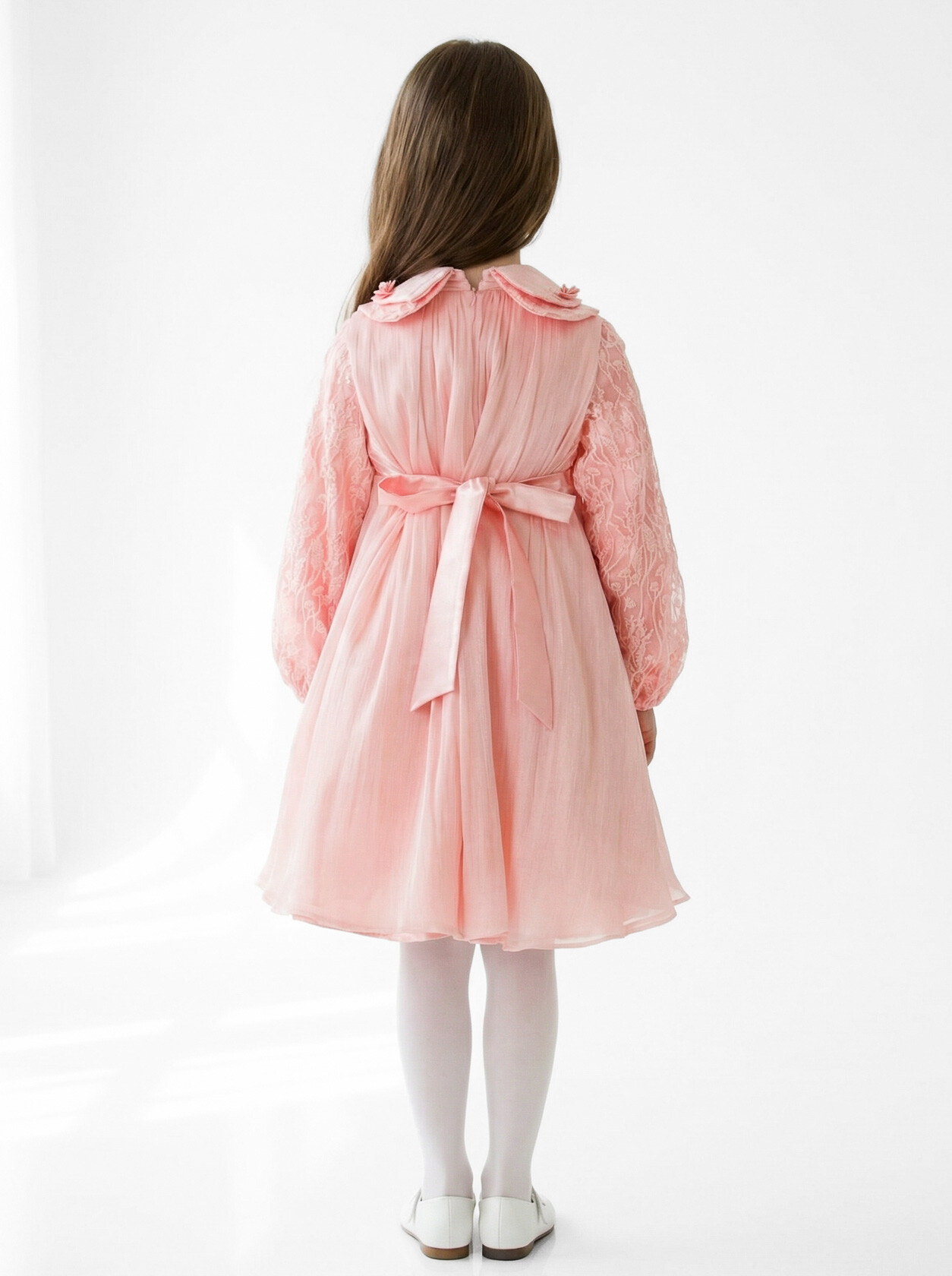 Bu şık kız çocuk elbisesi, bahar sezonu için mükemmel bir seçimdir. Yumuşak somon rengiyle, her ortama uyum sağlar. Elbise, zarif bir yaka detayına ve uzun, kabarık kollara sahiptir. Arkada yer alan bağcık detayı, belinize oturarak şıklığını artırır.