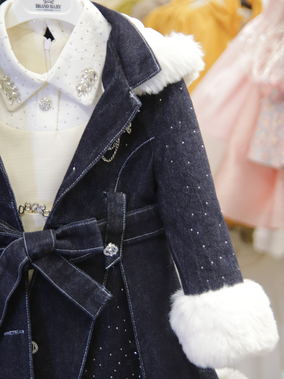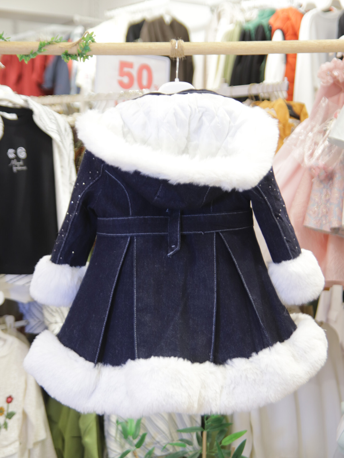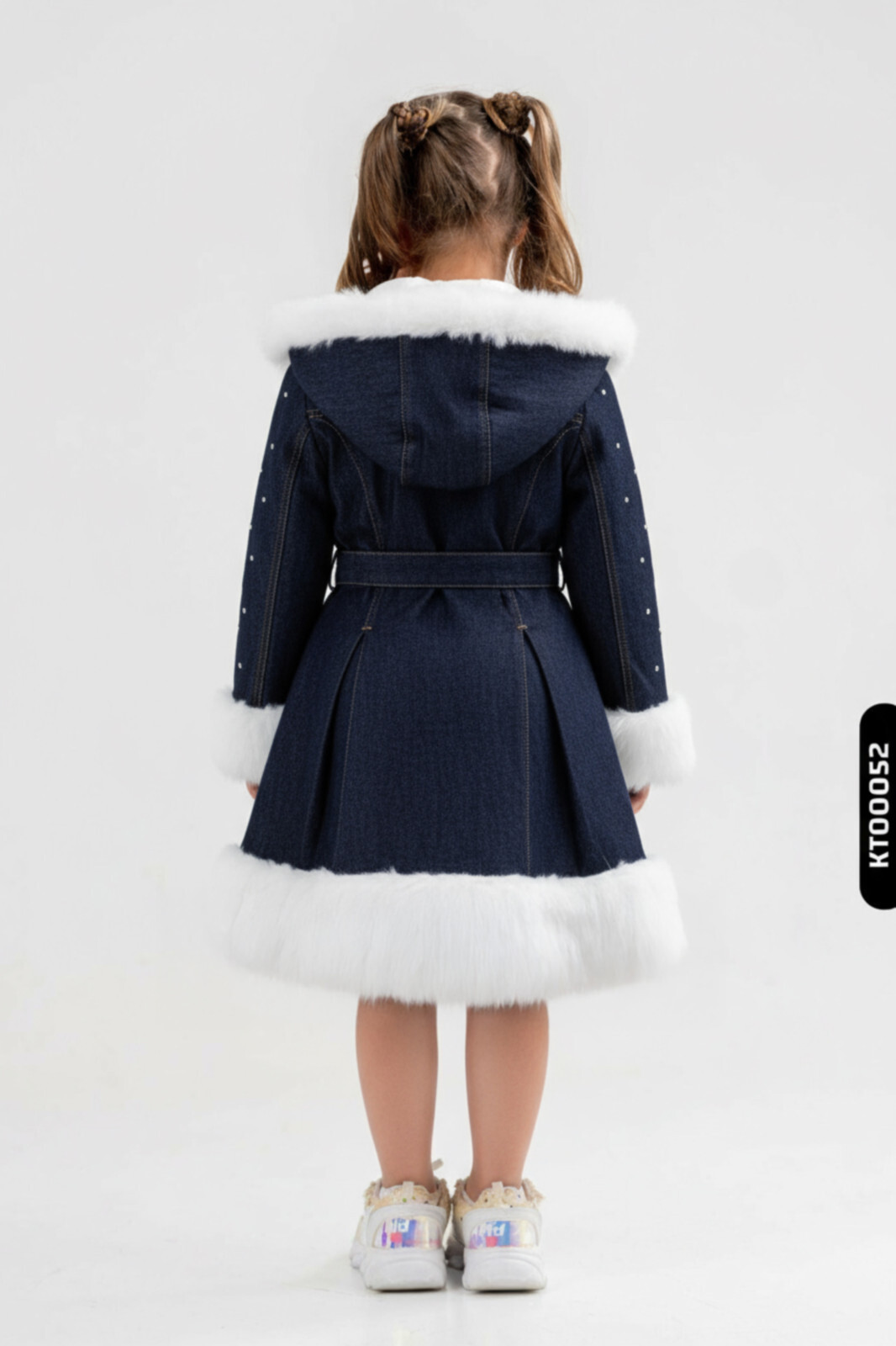 Bu şık kız çocuk kabanı, soğuk kış günlerinde sıcak tutan ve zarif tasarımıyla dikkat çeken özel bir parçadır. Lacivert renkte olup, kapüşonlu ve fermuarlı yapısı sayesinde kullanım kolaylığı sağlar. Kabanın kol uçları ve etek ucu beyaz peluş detaylarla süslenmiş, bu da ona zarif ve sıcak bir görünüm katmıştır. Belde bulunan büyük kumaş kemer, kıyafetin formunu belirginleştirirken, ön kısmındaki simli taş süslemeler ve şık broş aksesuarı ekstra bir ışıltı katar. Uzun kollu ve diz hizasında midi boyda olan bu kaban, kış ayları için ideal bir tercih olup hem günlük hem de özel günlerde rahatlıkla kullanılabilir.