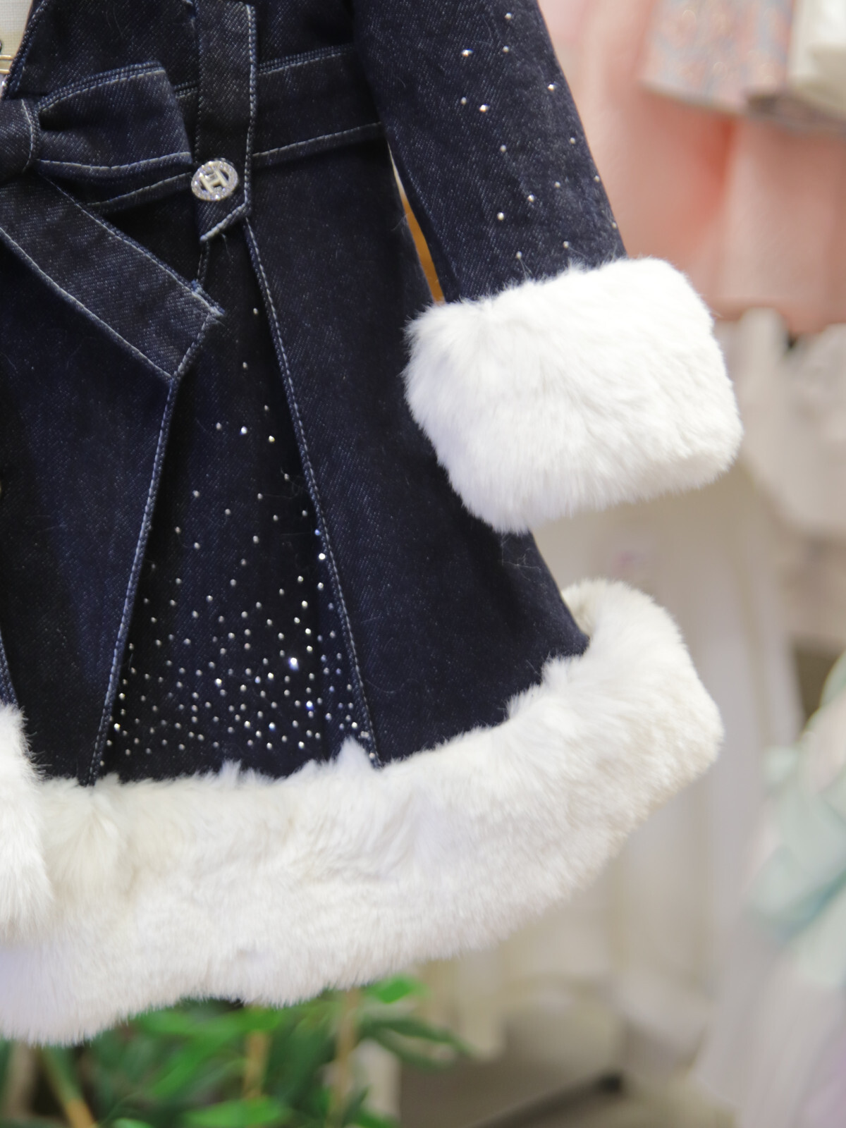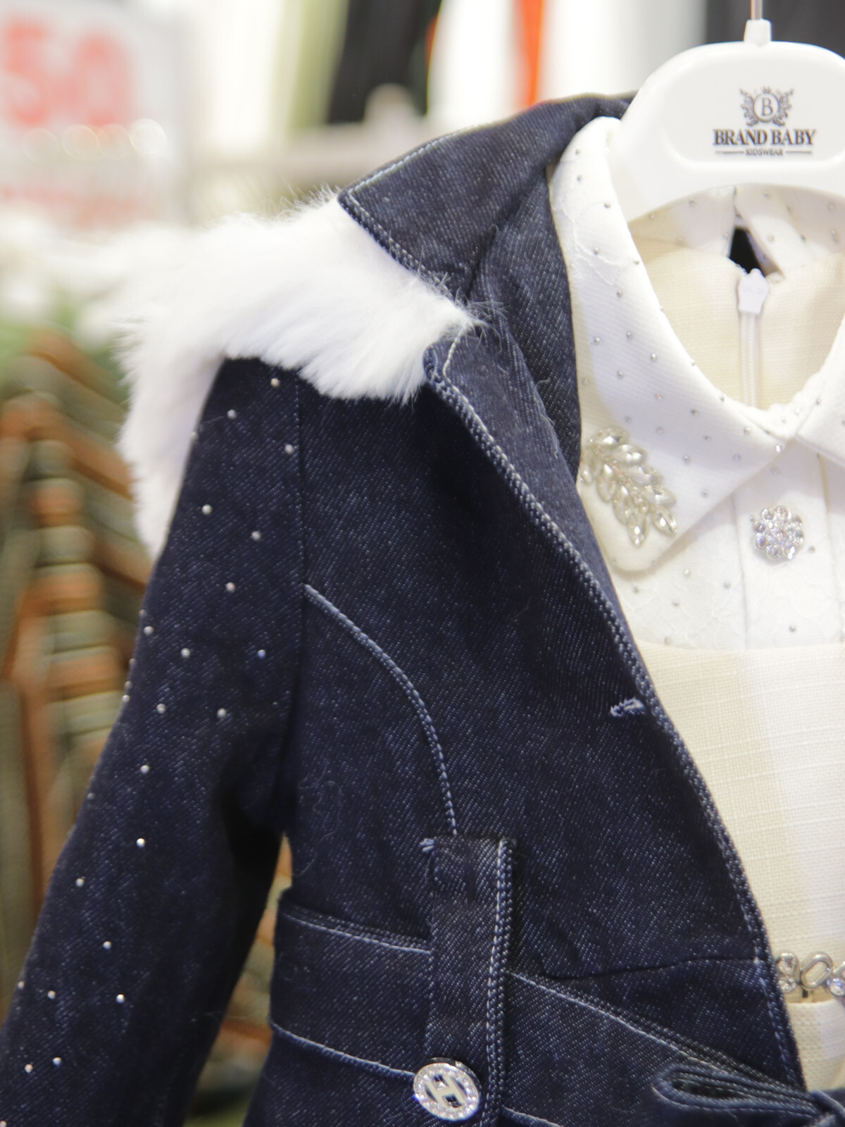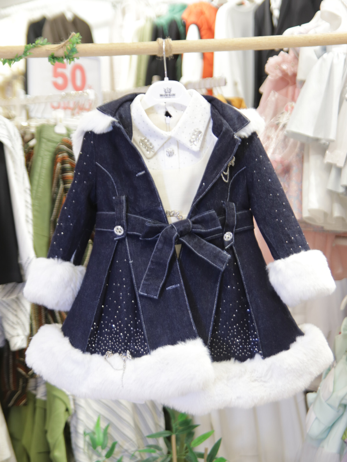 Bu şık kız çocuk kabanı, soğuk kış günlerinde sıcak tutan ve zarif tasarımıyla dikkat çeken özel bir parçadır. Lacivert renkte olup, kapüşonlu ve fermuarlı yapısı sayesinde kullanım kolaylığı sağlar. Kabanın kol uçları ve etek ucu beyaz peluş detaylarla süslenmiş, bu da ona zarif ve sıcak bir görünüm katmıştır. Belde bulunan büyük kumaş kemer, kıyafetin formunu belirginleştirirken, ön kısmındaki simli taş süslemeler ve şık broş aksesuarı ekstra bir ışıltı katar. Uzun kollu ve diz hizasında midi boyda olan bu kaban, kış ayları için ideal bir tercih olup hem günlük hem de özel günlerde rahatlıkla kullanılabilir.