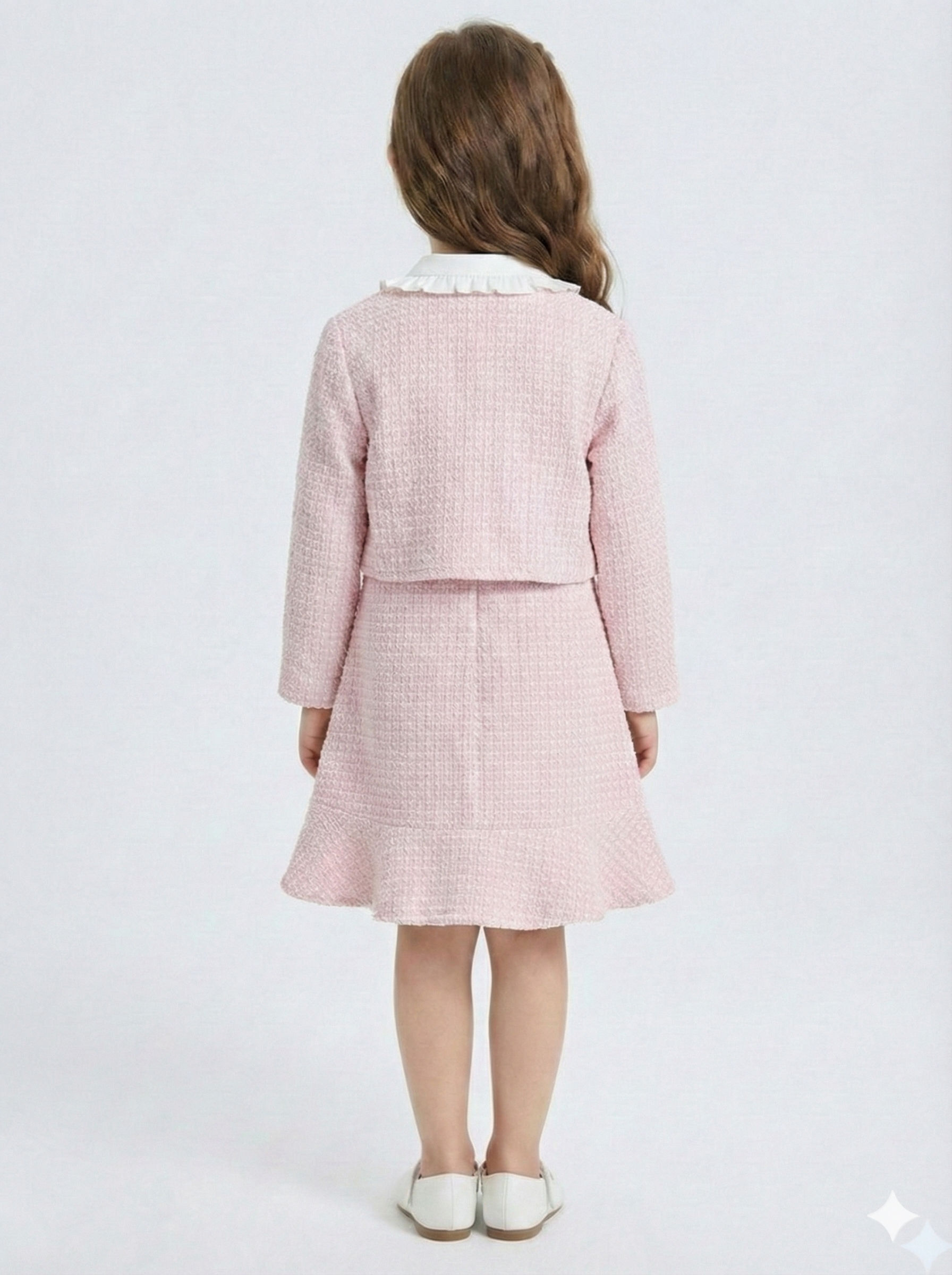 Kız Çocuk Kurdele Detaylı Parlak Kumaşlı 2'li Elbise ve Kaban Takmı 1-6 Yaş 4417 Pembe