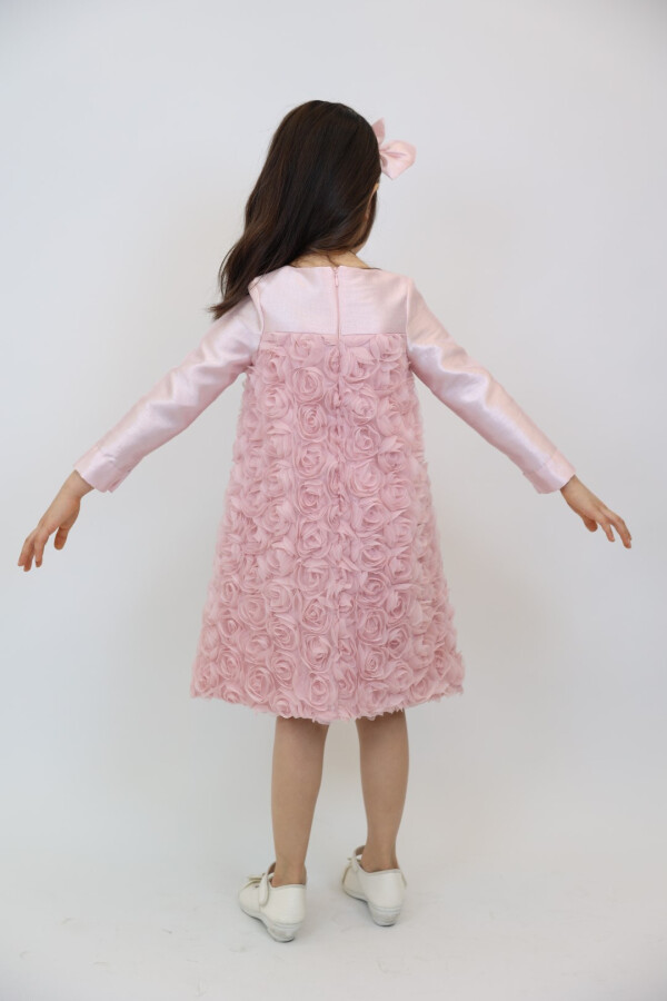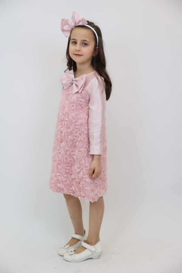 Şık ve zarif bir görünüm sunan bu kız çocuk elbisesi, özel günlerde ve davetlerde giyilmek üzere tasarlanmıştır. Elbise, pembe ve ekru renk seçenekleriyle sunulmakta olup, her yaştaki kız çocuğuna hitap etmektedir.