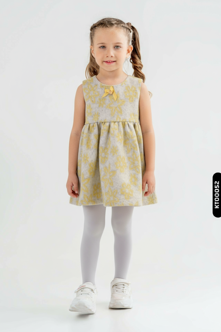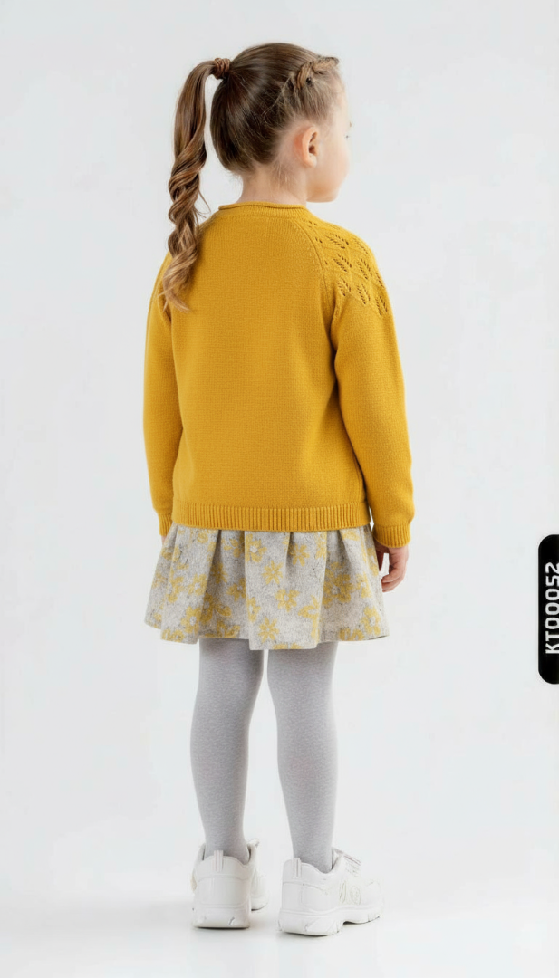 Bu kız çocuk elbisesi, kış sezonu için zarif ve rahat bir seçenek sunar. Hardal renginde örme hırka, ön kısmında düğmeli ve zarif bir dantel desenine sahiptir. Uzun kollu ve sıfır yakalı olan hırka, şıklığı ve sıcaklığı bir arada sunar. Elbise ise, yumuşak gri zemin üzerine hardal sarısı çiçek desenleriyle süslenmiş, kolsuz ve diz üstü uzunluğundadır. Kombin, gri tayt ve beyaz spor ayakkabılarla tamamlanarak hem günlük hem özel günler için uygundur.