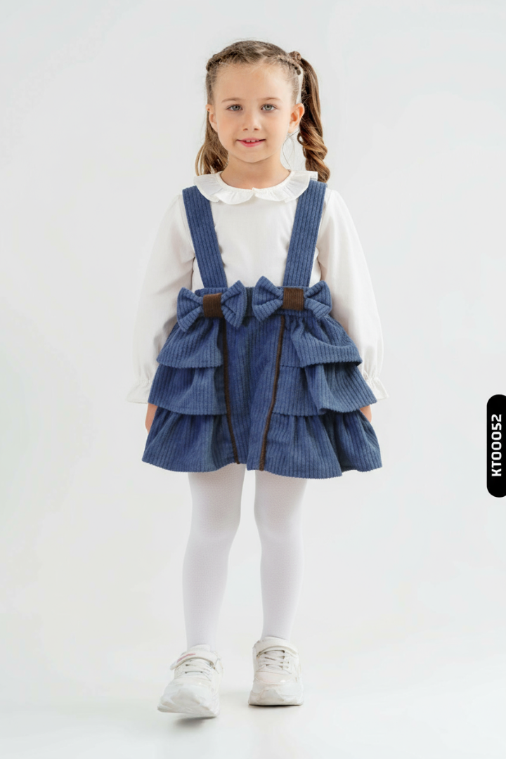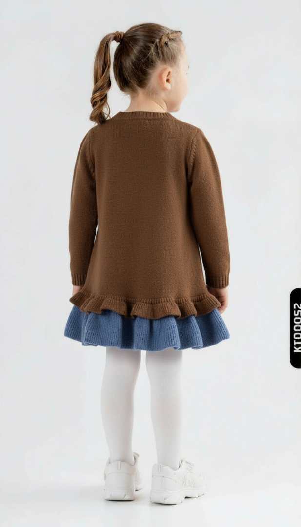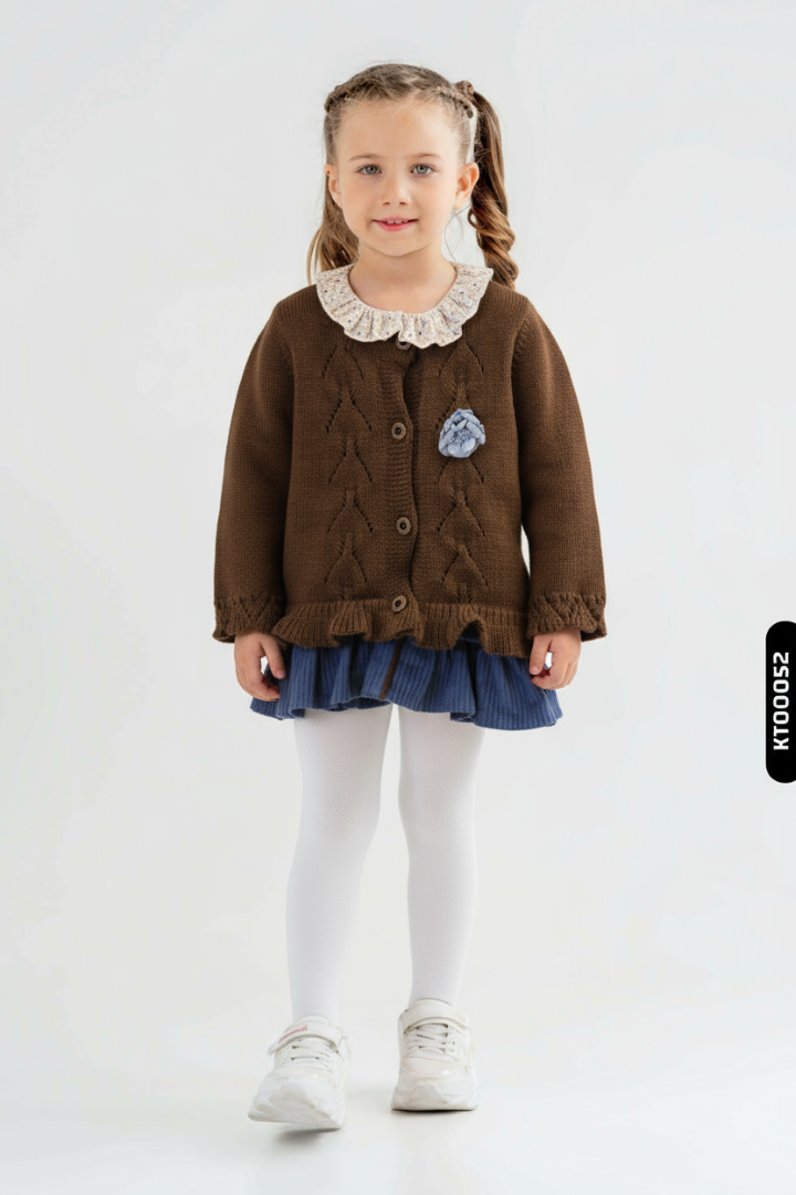 Bu kız çocuk elbisesi, kış sezonu için şık ve rahat bir kombin sunuyor. Elbise, fırfırlı ve askılı mavi kadife etek kısmına sahip olup, üzerine giyilen kahverengi örgü hırka ile tamamlanmıştır. Hırkanın önü düğmeli ve etek ucu ile kol uçlarında zarif fırfır detayları bulunmaktadır. Uzun kollu ve sıfır yakalı tasarımı, çocuğunuzu soğuk havalarda korurken aynı zamanda sevimli bir görünüm sağlar. Elbisenin üst kısmındaki beyaz bluz, zarif fırfırlı yakası ile kombine hoş bir kontrast yaratır. Günlük kullanıma uygun, rahat ve sıcak tutan bu set, kız çocukları için ideal bir kış kıyafetidir.