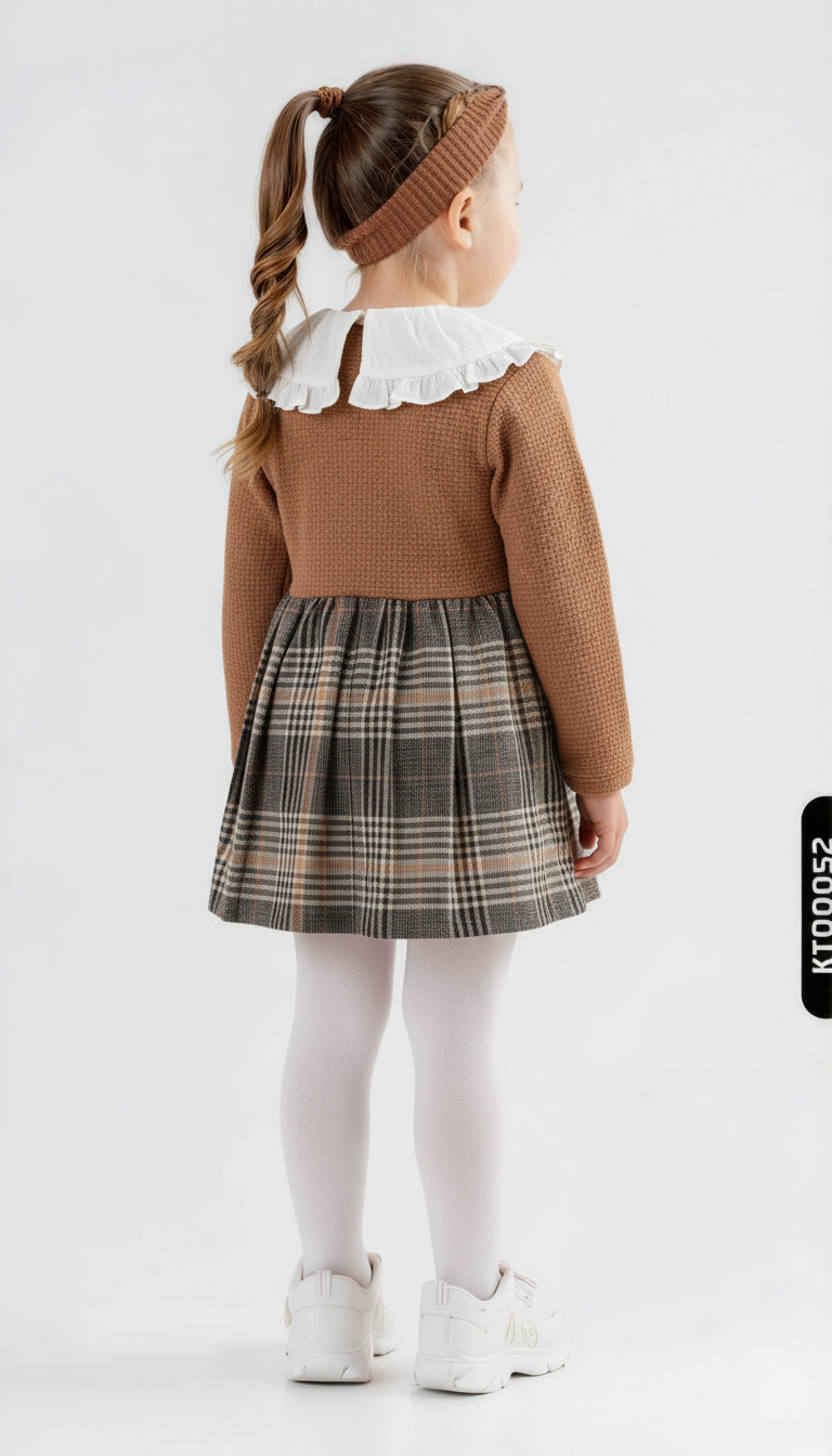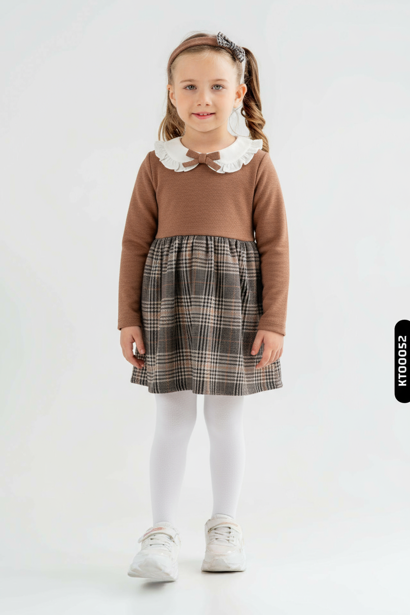 Bu kız çocuk elbisesi, kış sezonu için hem şık hem de sıcak tutan bir tasarıma sahiptir. Üst kısmı dokulu kahverengi kumaştan yapılmış olup, uzun kolludur ve rahat bir kullanım sunar. Elbisenin etek kısmında klasik ekose desenler bulunmakta, bu da ona zarif ve vintage bir hava katmaktadır. Beyaz fırfırlı ve fiyonk detaylı bisiklet yaka, elbiseye sevimli ve naif bir görünüm kazandırır. Elbise, midi boyda olup günlük ve özel günler için idealdir.