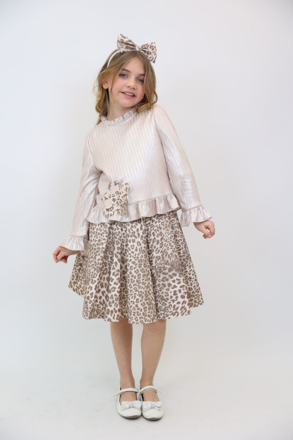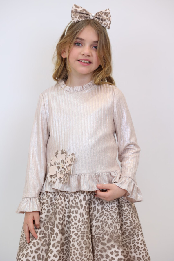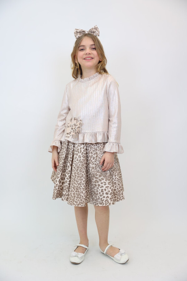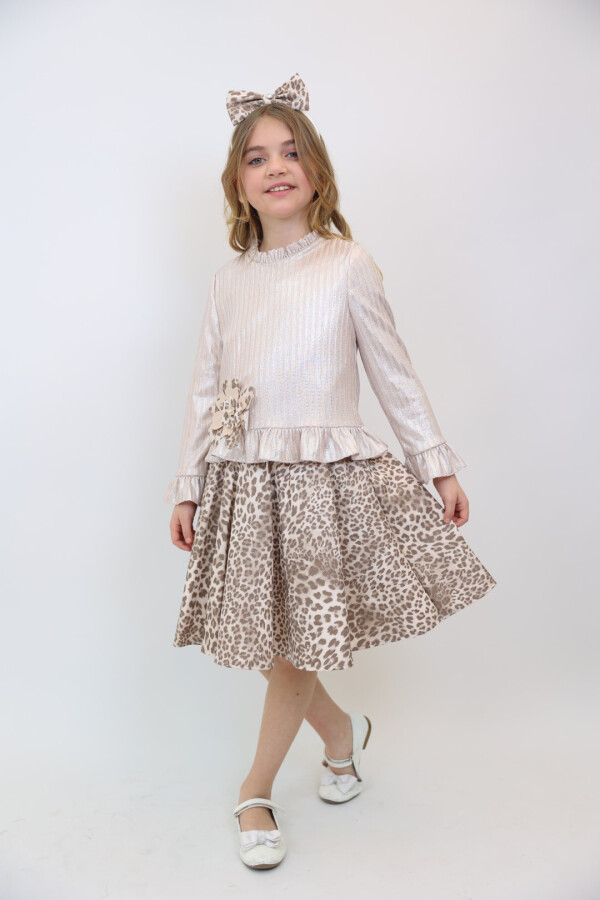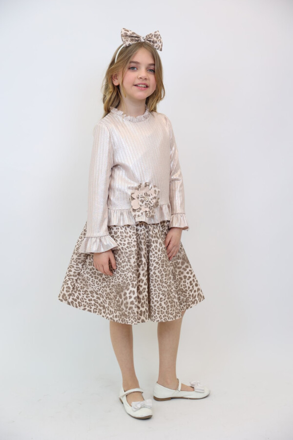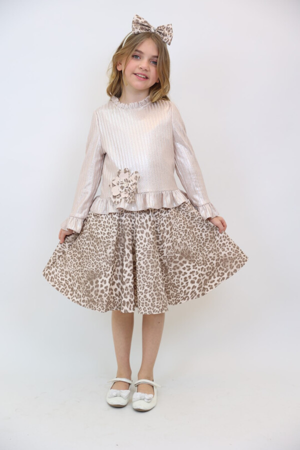 Şıklığı ve rahatlığı bir araya getiren bu kız çocuk elbisesi, özel günlerde ve günlük giyimde tercih edilebilecek harika bir seçenek. Üst kısmı, şık bir dokuya sahip ve fırfır detaylarıyla zenginleştirilmiş. Alt kısmı ise sevimli leopar deseniyle dikkat çekiyor. Ayrıca, elbisenin yanında uyumlu bir saç bandı da bulunuyor.