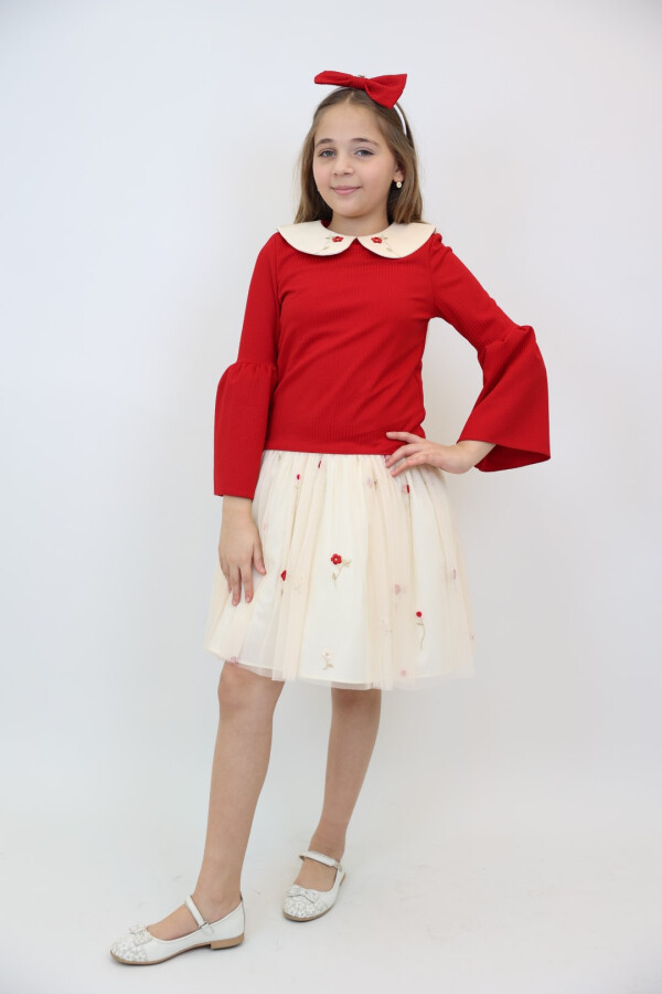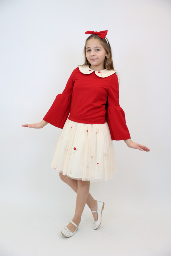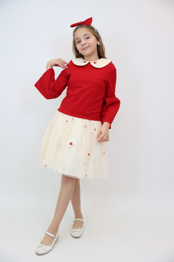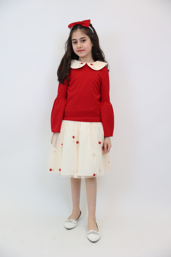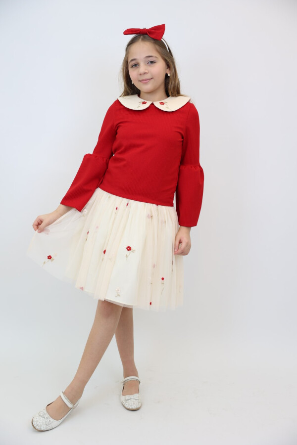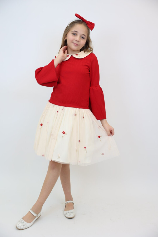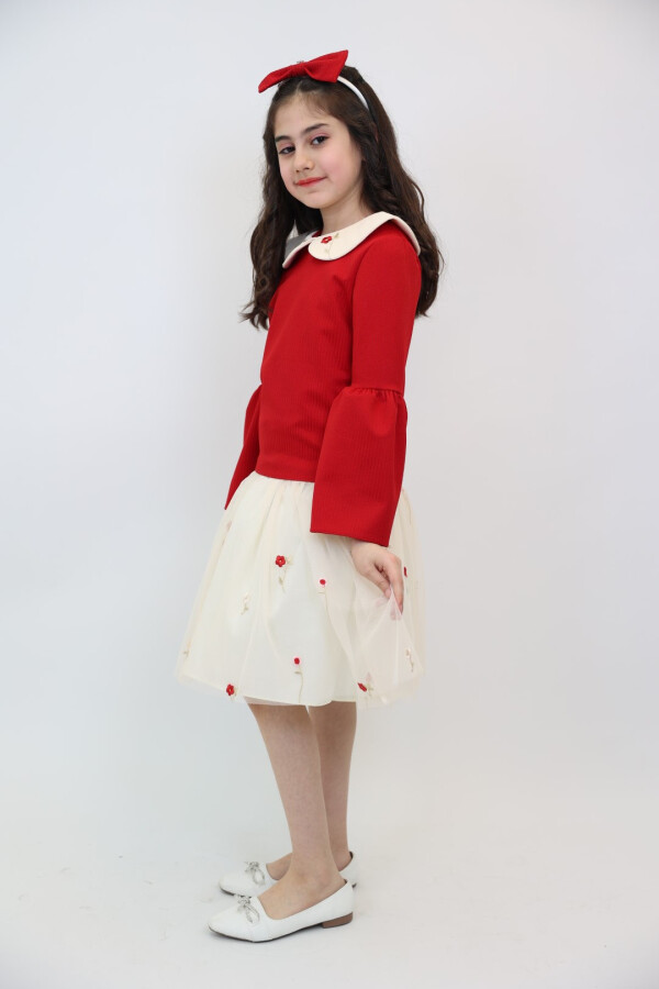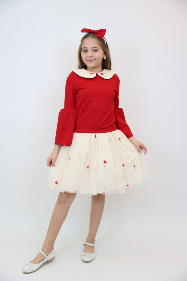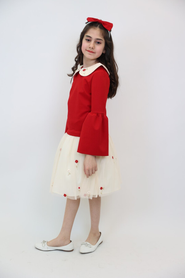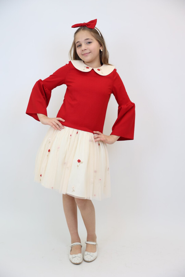 Bu şık kız çocuk elbisesi, özel günlerde ve günlük kullanımda rahatlıkla giyilebilecek bir tasarıma sahiptir. Kırmızı rengin enerjisi ve zarif detaylar ile birleşiyor.