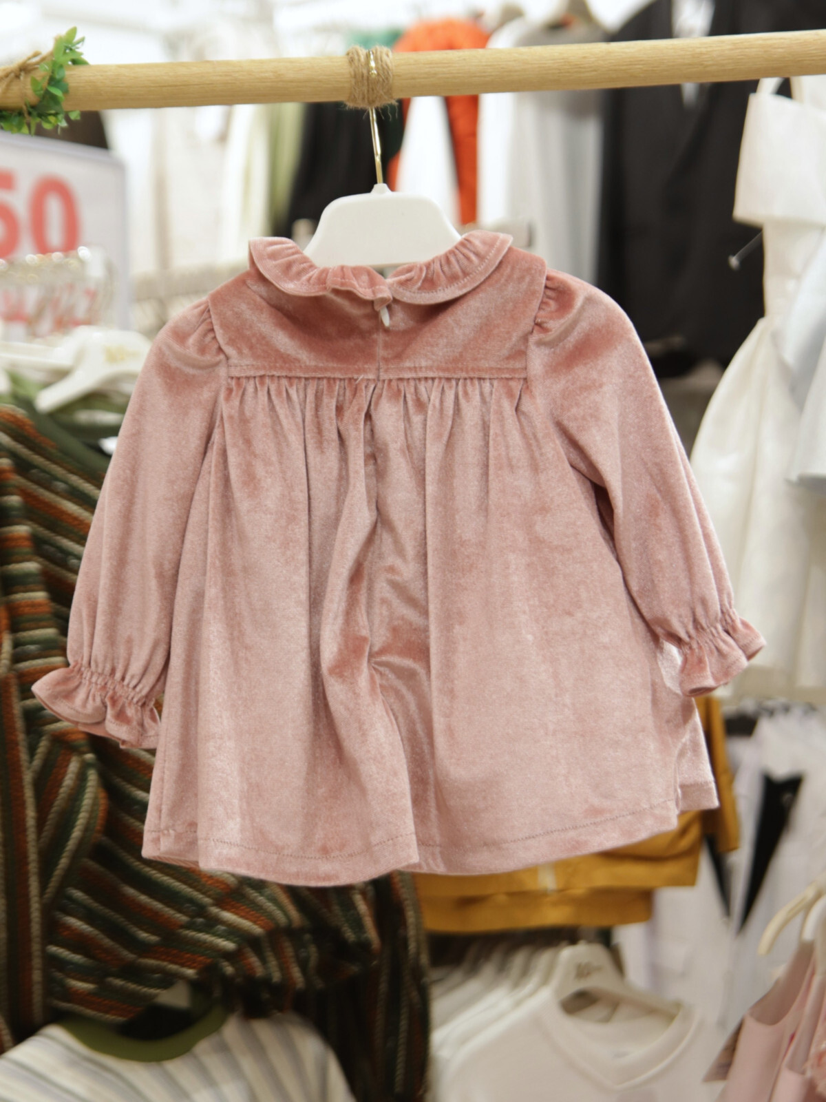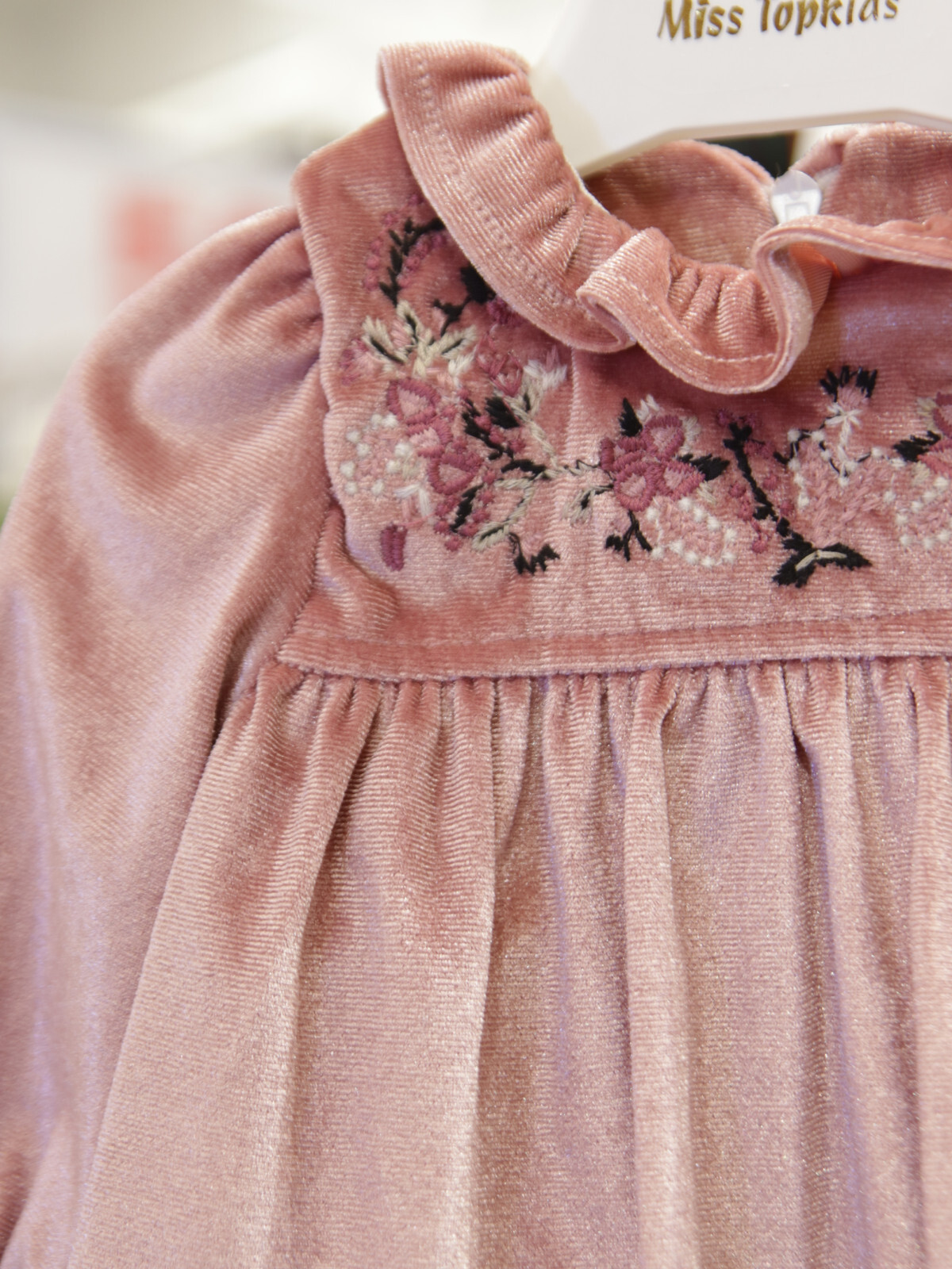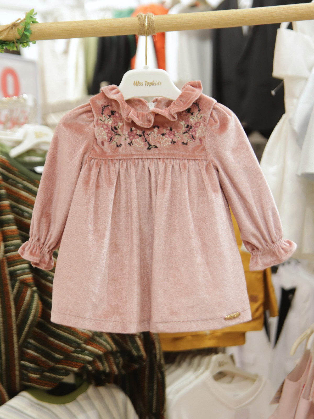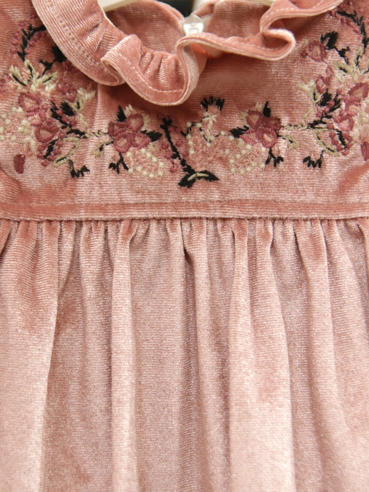Bu kız çocuk elbisesi, yumuşak kadife kumaşı ve gül kurusu rengi ile zarif ve konforlu bir tercih sunar. Uzun kollu tasarımı, kış ayları için sıcak tutacak şekilde tasarlanmıştır. Elbisenin ön kısmında zarif çiçek işlemeleri ve inci detayları yer almakta, yuvarlak ve fırfırlı yakası ile sevimli bir görünüm sağlamaktadır. Kol uçlarındaki lastikli ve fırfırlı detaylar da şıklığı tamamlar. Arkada gizli fermuar ile kolay giyilip çıkarılabilir. Midi boyda, rahat kesimi sayesinde çocukların hareket özgürlüğünü kısıtlamaz.