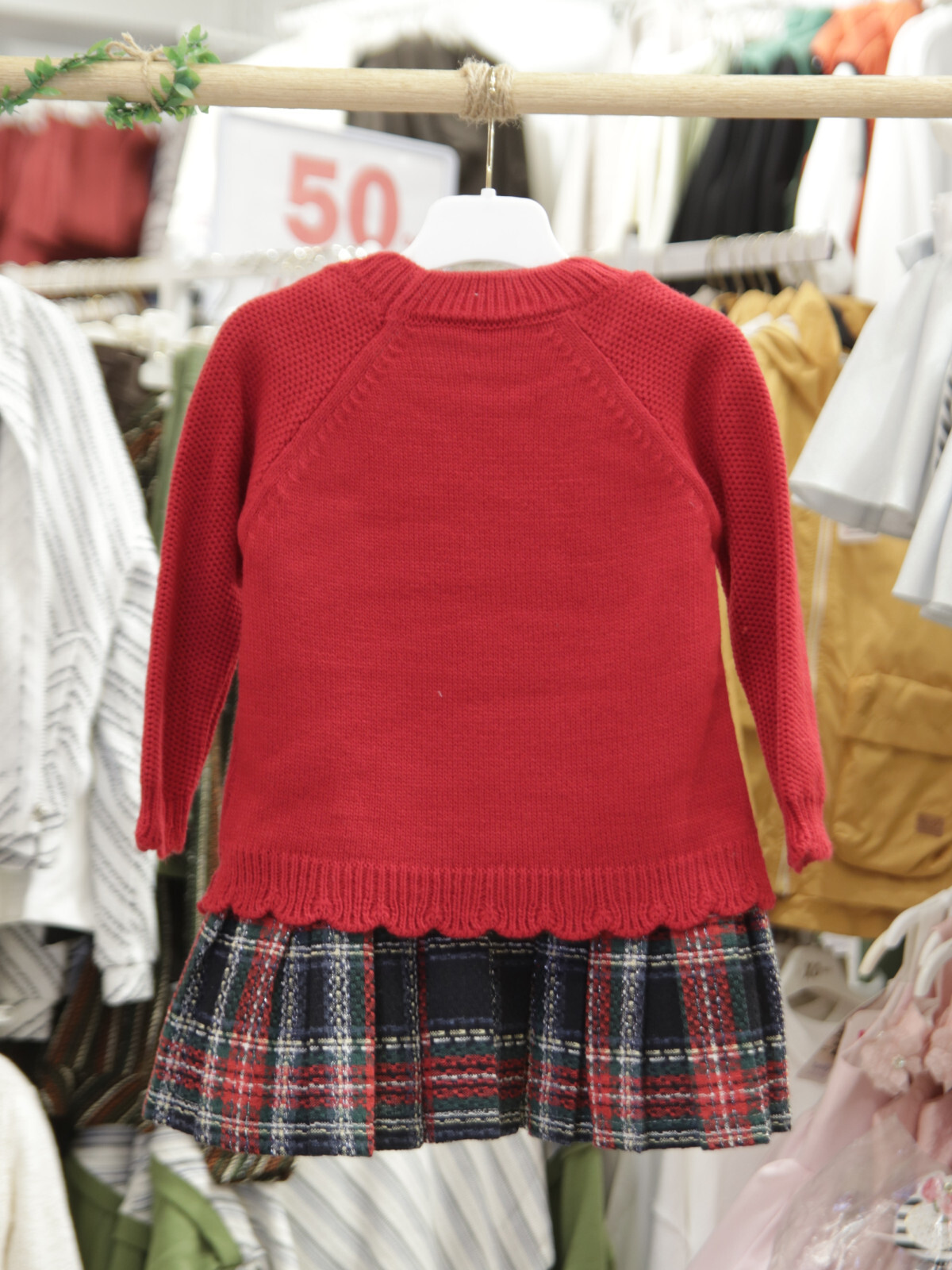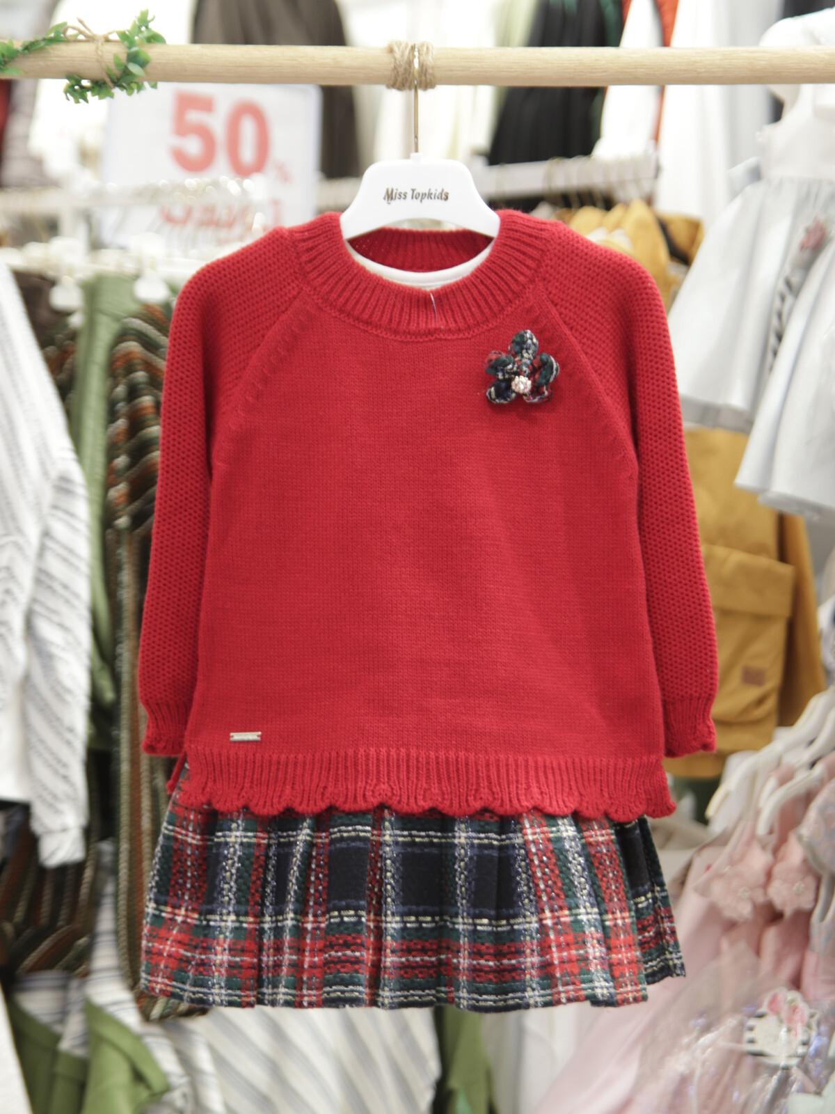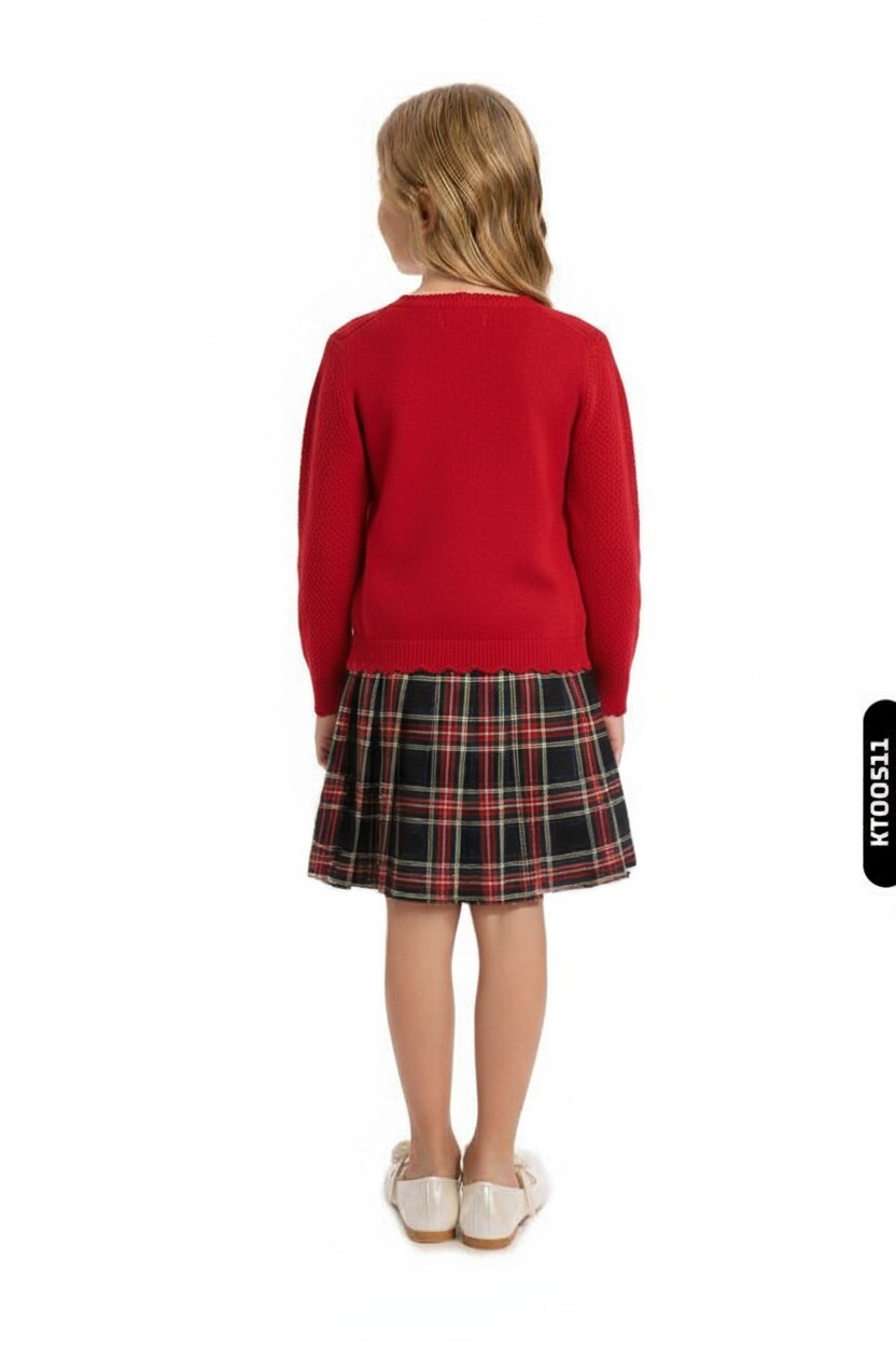 Bu kız çocuk elbisesi, kış ayları için hem şık hem de rahat bir seçenektir. Üst kısmı kırmızı renkte, uzun kollu ve bisiklet yaka tasarıma sahip bir kazak şeklindedir. Kazak üzerinde zarif bir çiçek broş detayı bulunur. Etek kısmı ise klasik ekose desenli, diz üstü uzunlukta ve pileli yapısıyla hareketlidir. Bu elbise, günlük kullanıma uygun olup, okul ve özel günlerde tercih edilebilir.