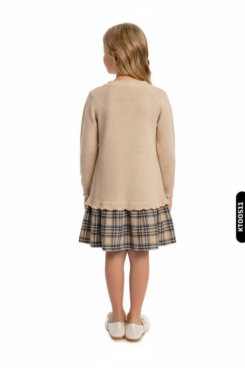 Bu kız çocuk kışlık elbise, bej renkli, rahat ve şık bir tasarıma sahiptir. Üst kısmı yumuşak dokulu, uzun kollu ve sıfır yakalı bir kazak şeklindedir. Sol omuzda zarif bir çiçek süsü bulunur. Kazak, kol manşetlerinde ve etek ucunda ince detaylı örgü desenlerle süslenmiştir. Etek kısmı ise klasik ekose desenli, diz hizasında, hafif pileli ve sıcak tutan kalın bir kumaştan üretilmiştir. Bu kombin, günlük kullanım için hem rahat hem de stil sahibi bir tercih sunar.