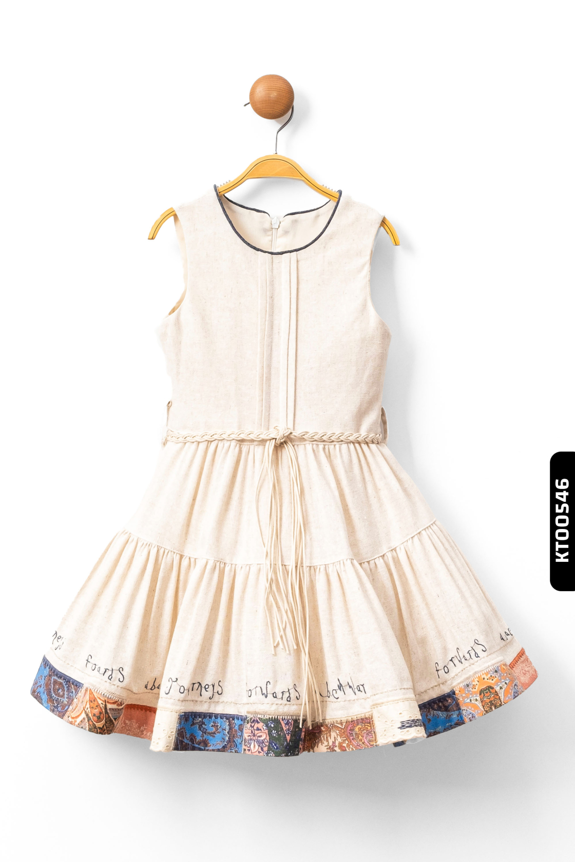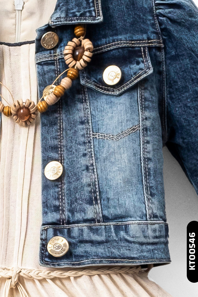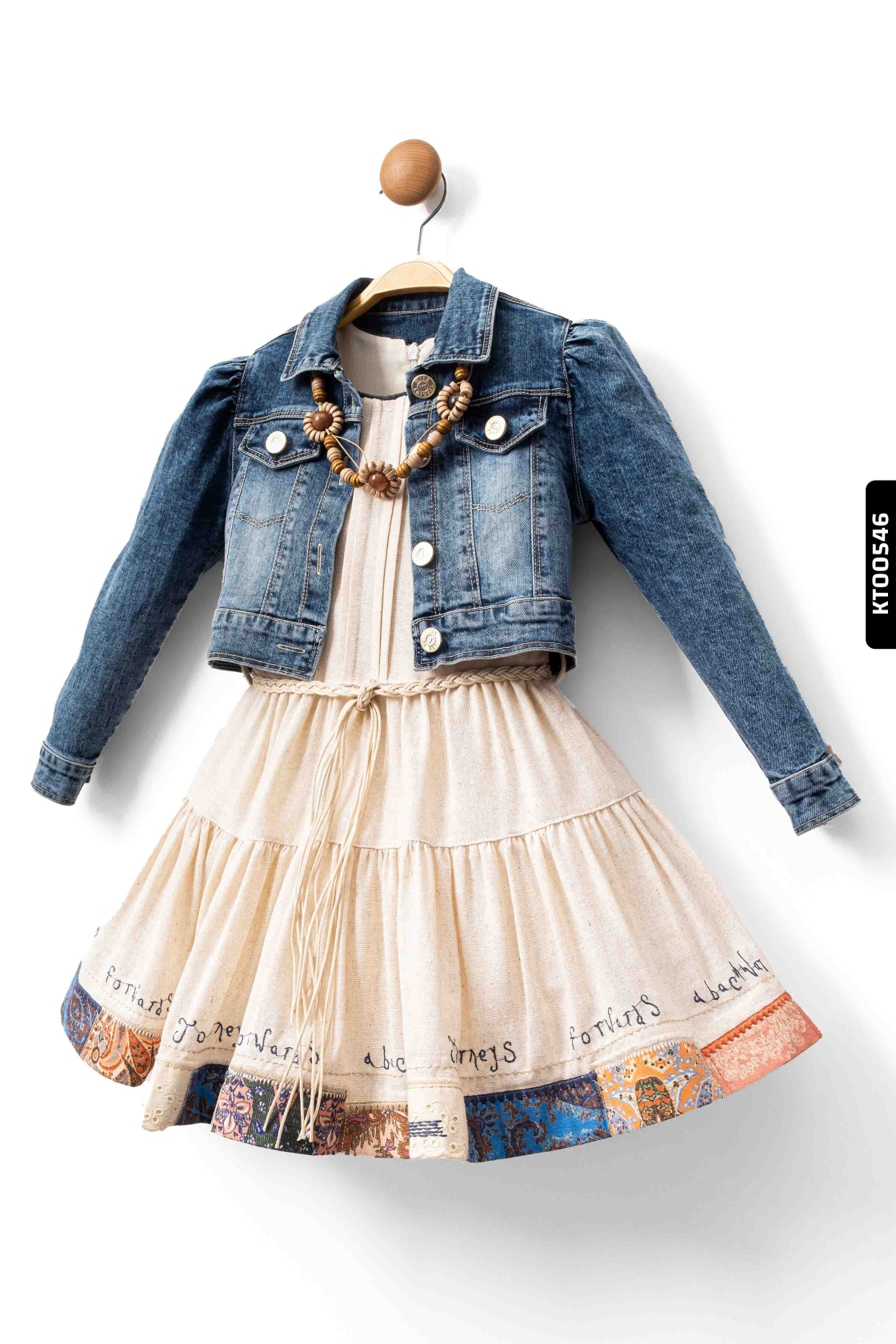 Bu şık kız çocuk elbisesi, krem tonlarında kat kat etek kısmı ve etek ucundaki renkli desen detaylarıyla dikkat çekiyor. Elbisenin üst kısmı kolsuz, sıfır yakalı ve belde ince örgülü kordon ile tamamlanmıştır. Üzerinde yer alan kot ceket, kısa boylu ve uzun kollu olup, düğmeli kapama detayına sahiptir. Ceket, klasik kot mavisi renginde tasarlanmış ve küçük cepler ile aksesuar olarak ahşap boncuklu kolye detayı eklenmiştir. Hem günlük hem özel günlerde rahatlıkla kullanılabilecek şık ve rahat bir kombin sunar.